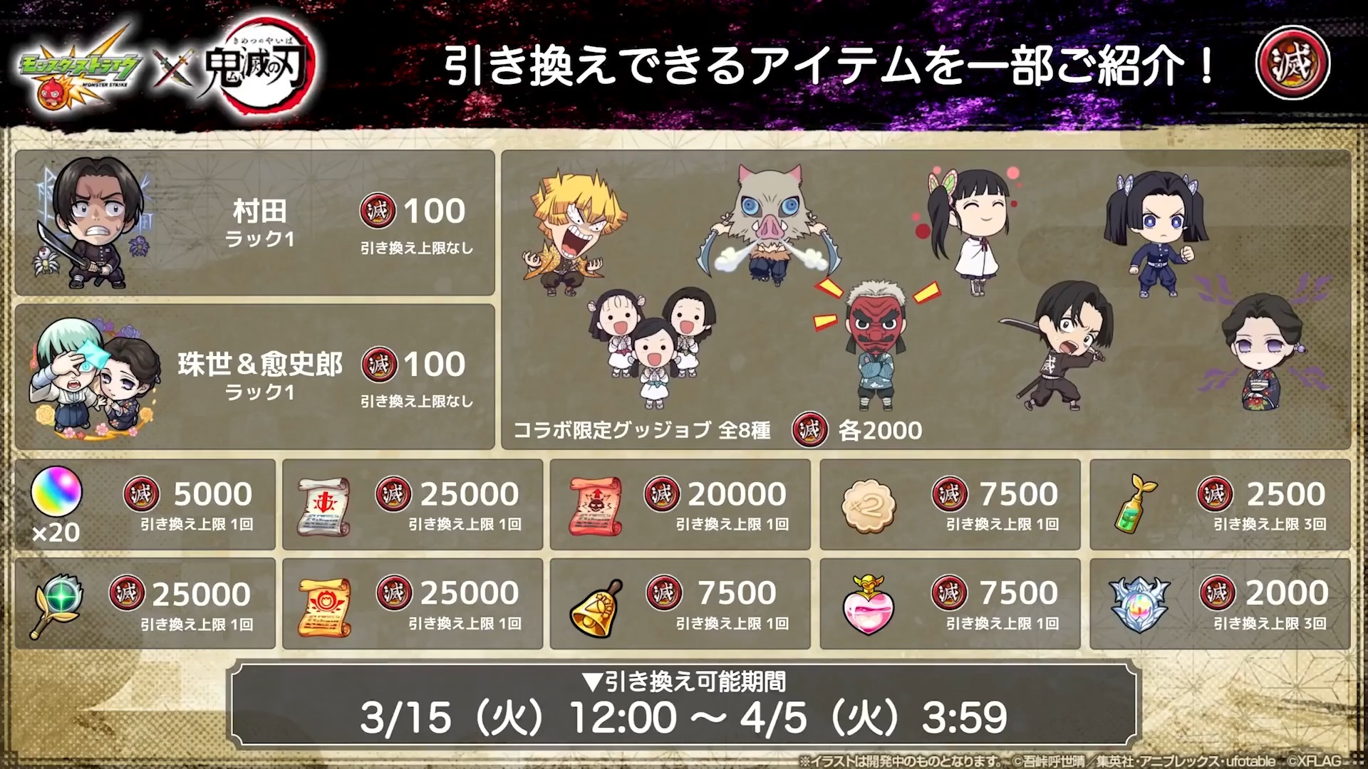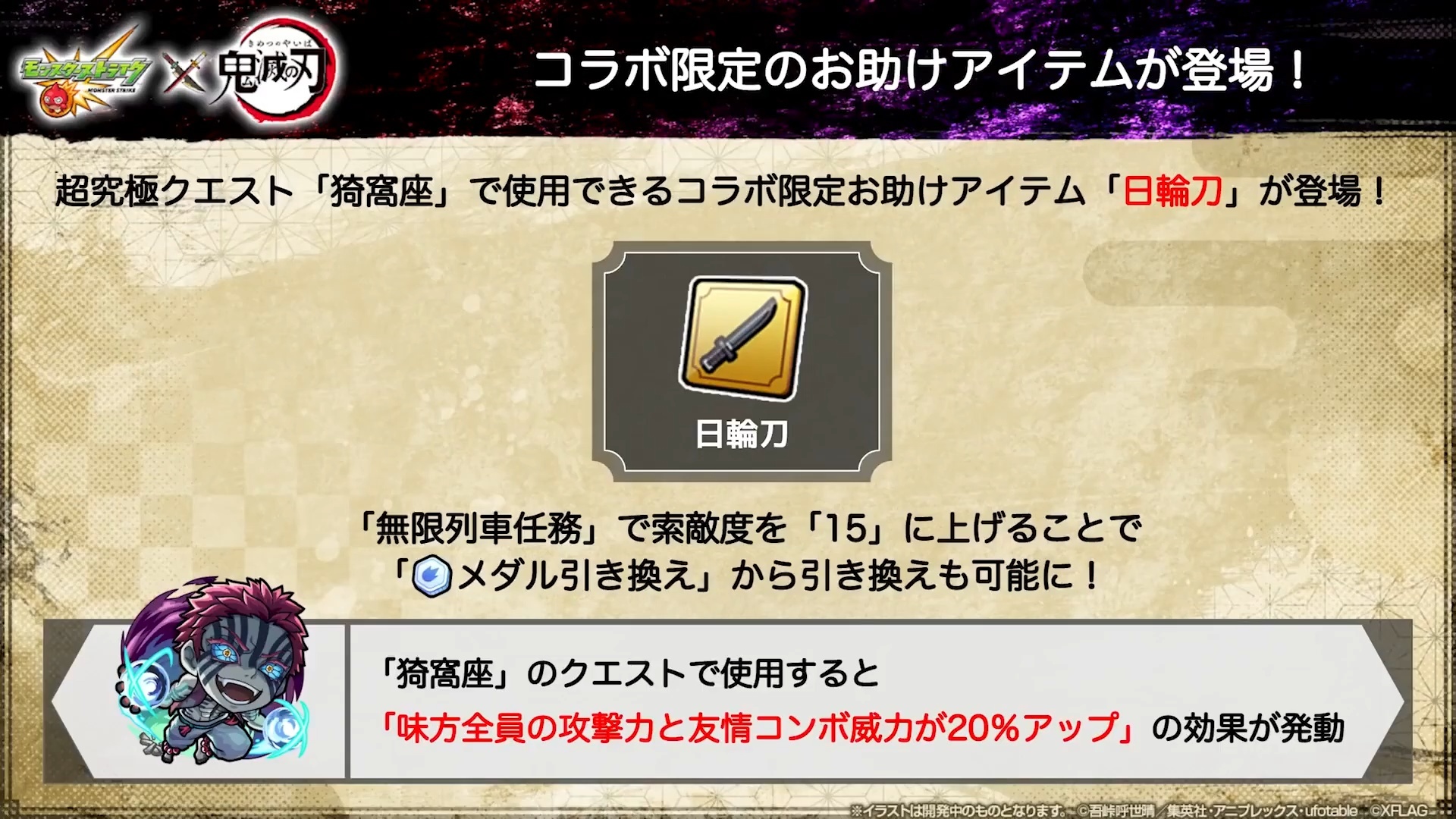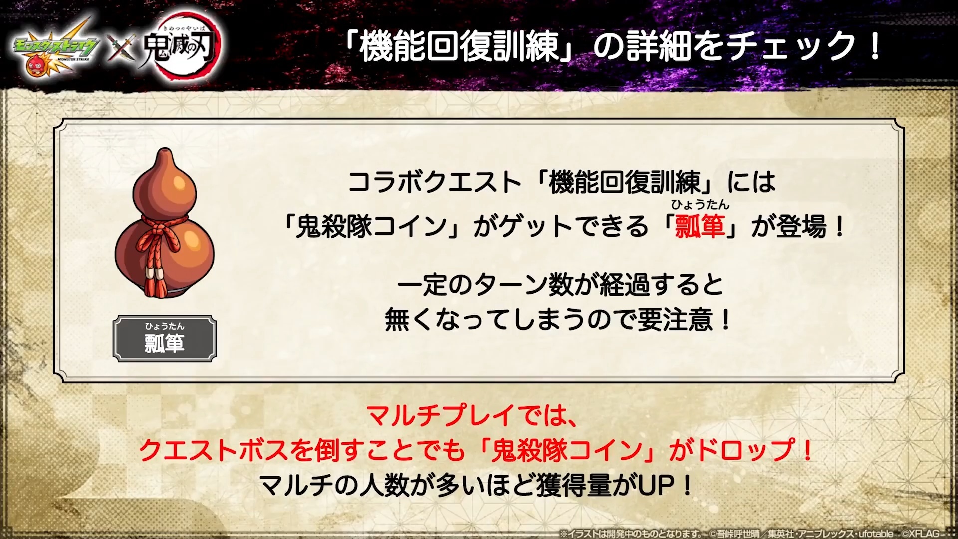 合作期間將舉辦冒險「機能回復訓練」,透過收集「鬼殺隊硬幣」兌換合作角色、遊戲內道具及合作限定 Good Job。