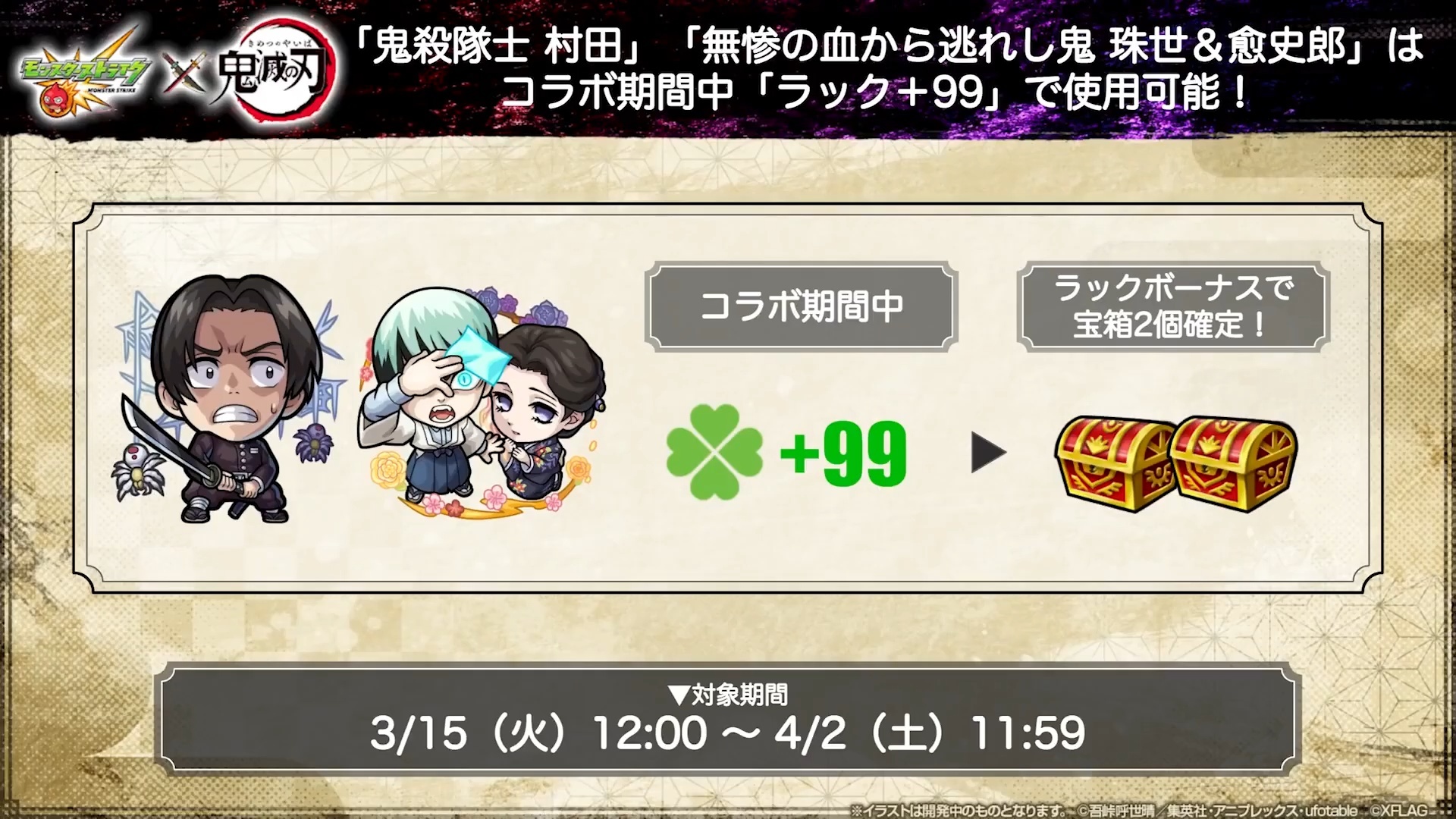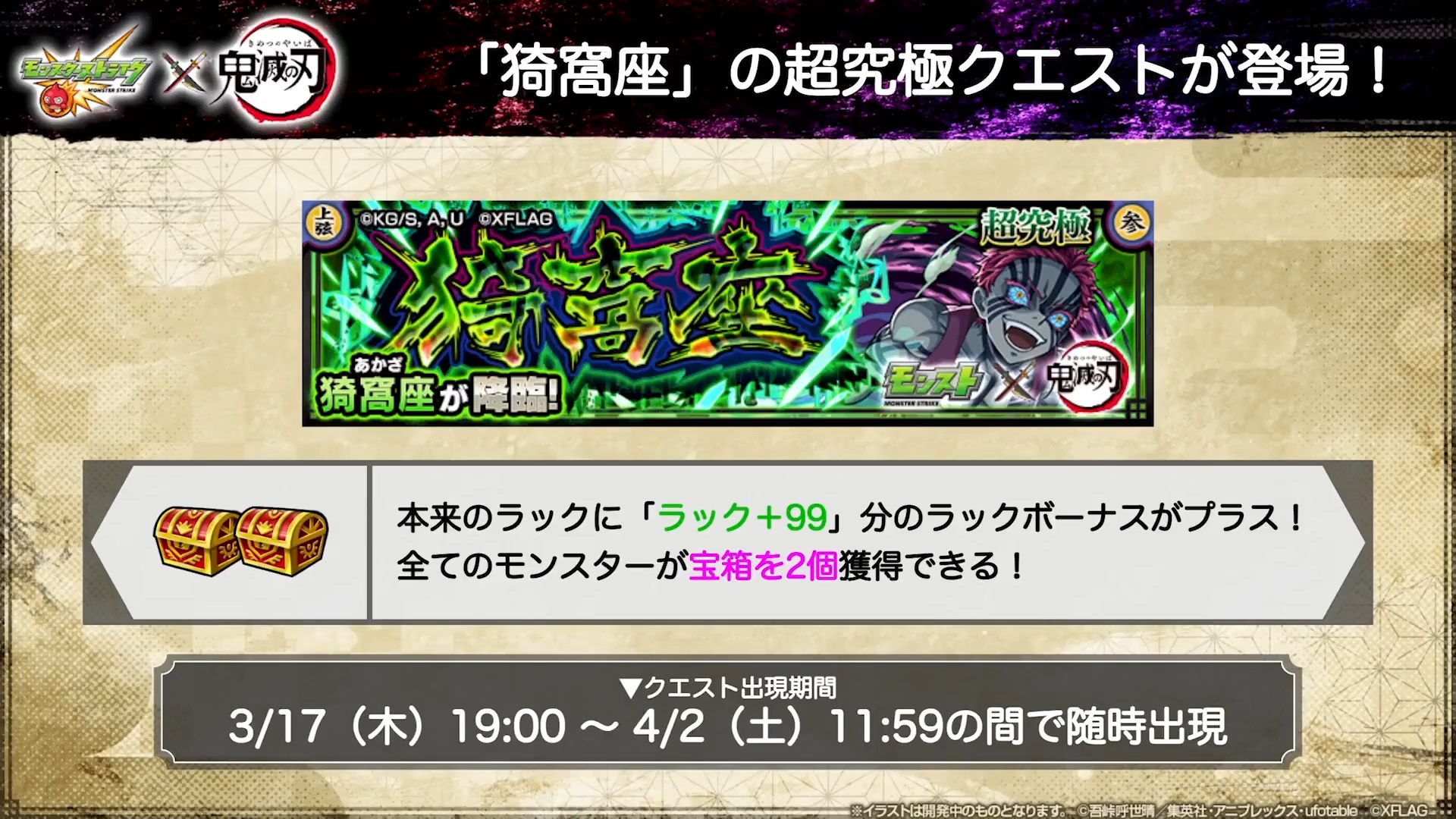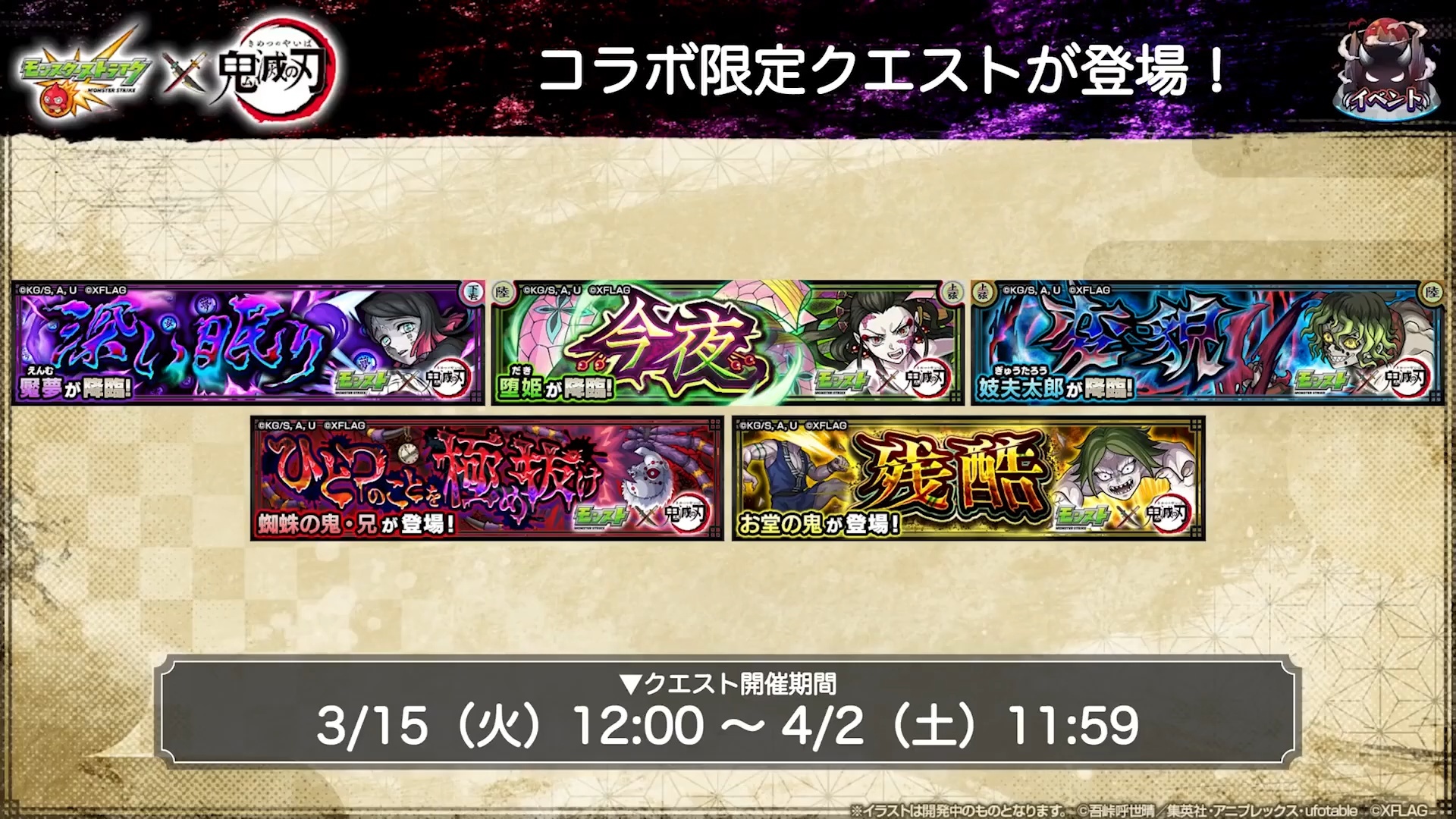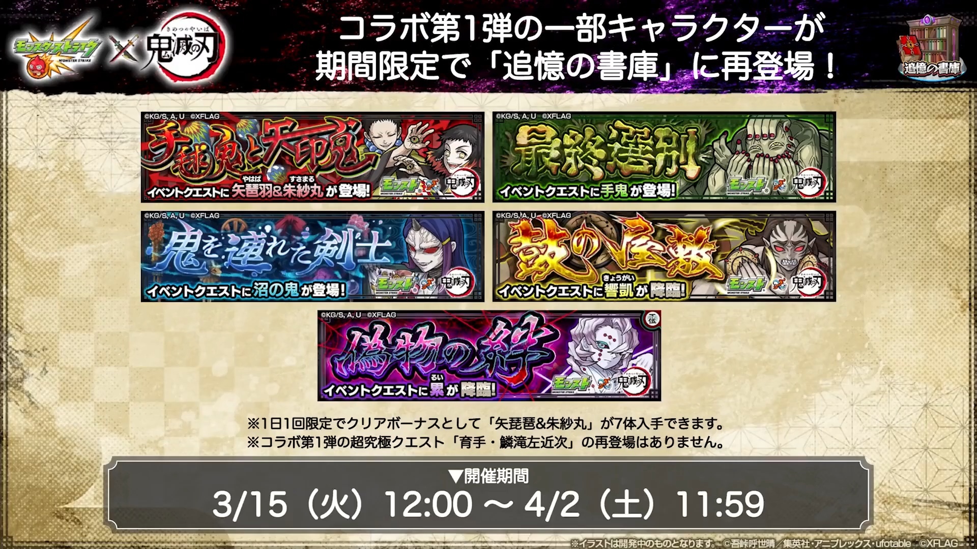 包含「猗窩座」超究極冒險在內的一系列合作限定冒險將於 3 月 15 日至 4 月 2 日陸續舉辦,一部分第 1 彈合作的限定角色也將於「追憶的書庫」再次登場。