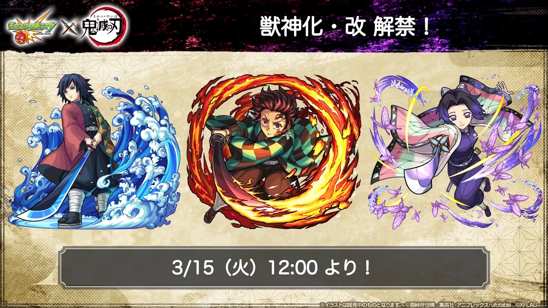 此外,「竈門炭治郎」、「富岡義勇」、「胡蝶忍」三位上次推出的角色將於 3 月 15 日開放獸神化・改。