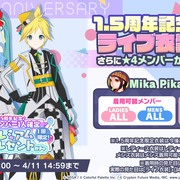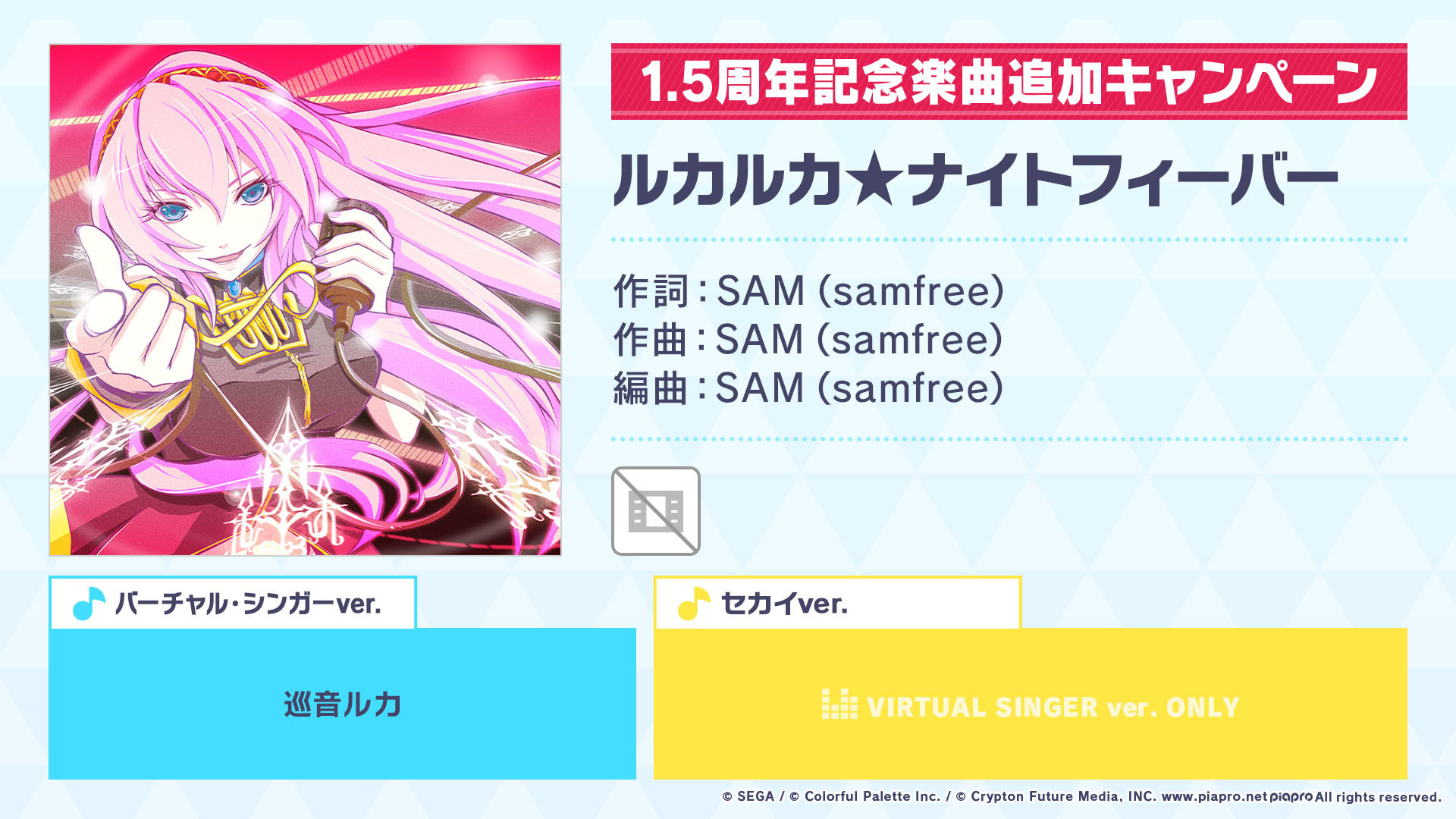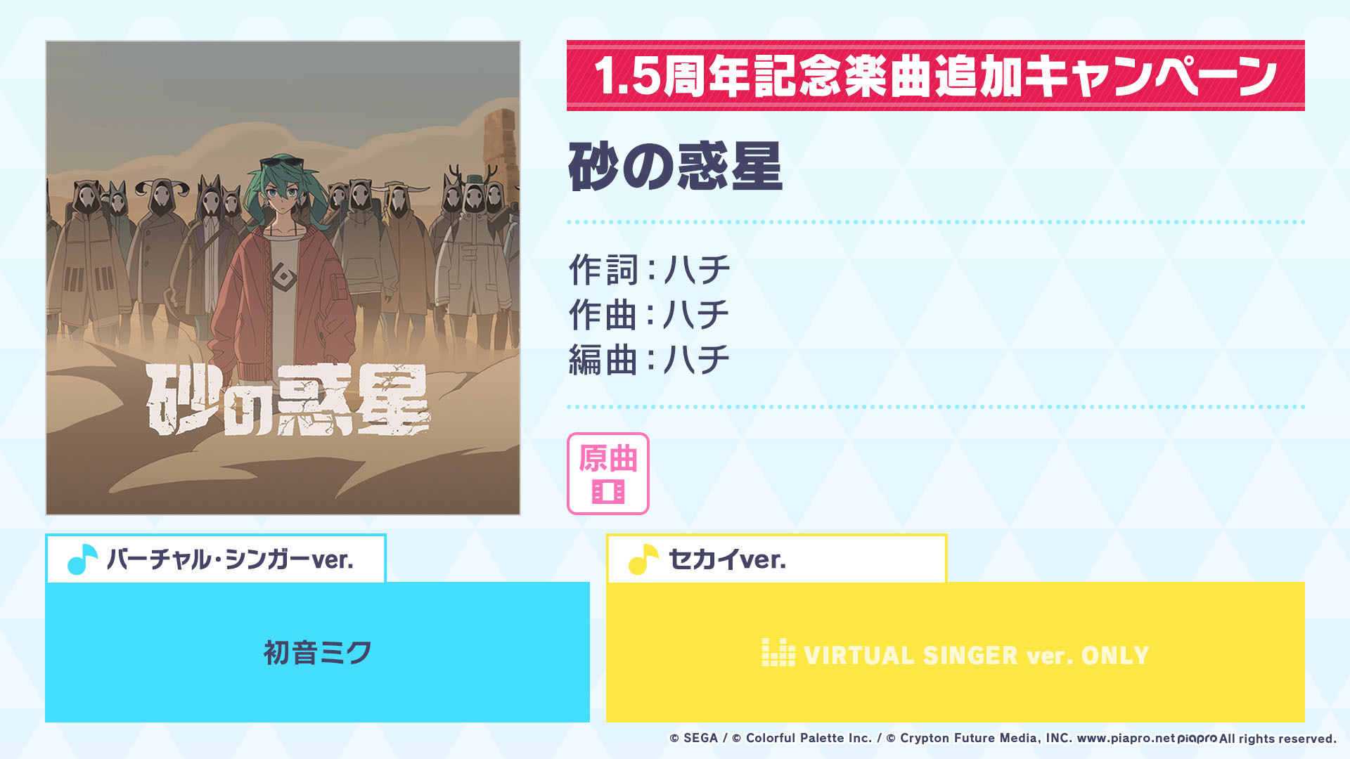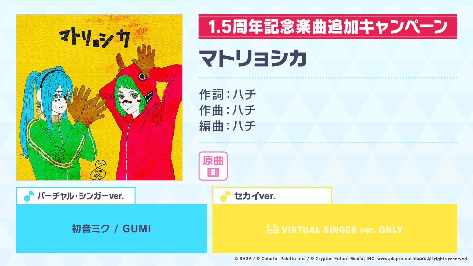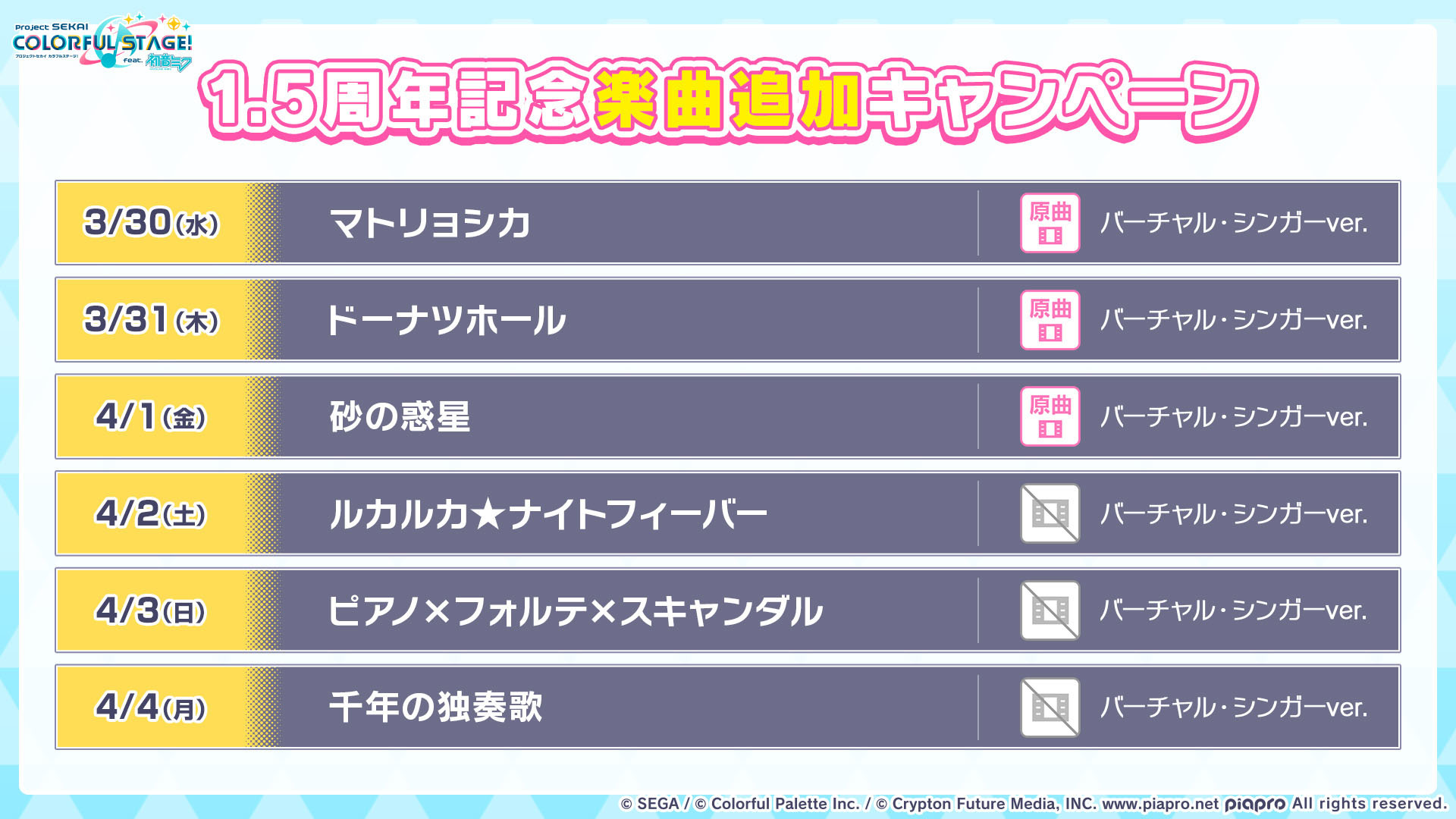 3 月 9 日直播中預告過的「1.5 週年紀念歌曲追加活動」中登場的歌曲也正式公開。本活動將於 3 月 30 日至 4 月 4 日,陸續加入 Hachi(米津玄師)的「マトリョシカ」、「砂の惑星」及 SAM(samfree)的「ルカルカ★ナイトフィーバー」等共 6 首歌。