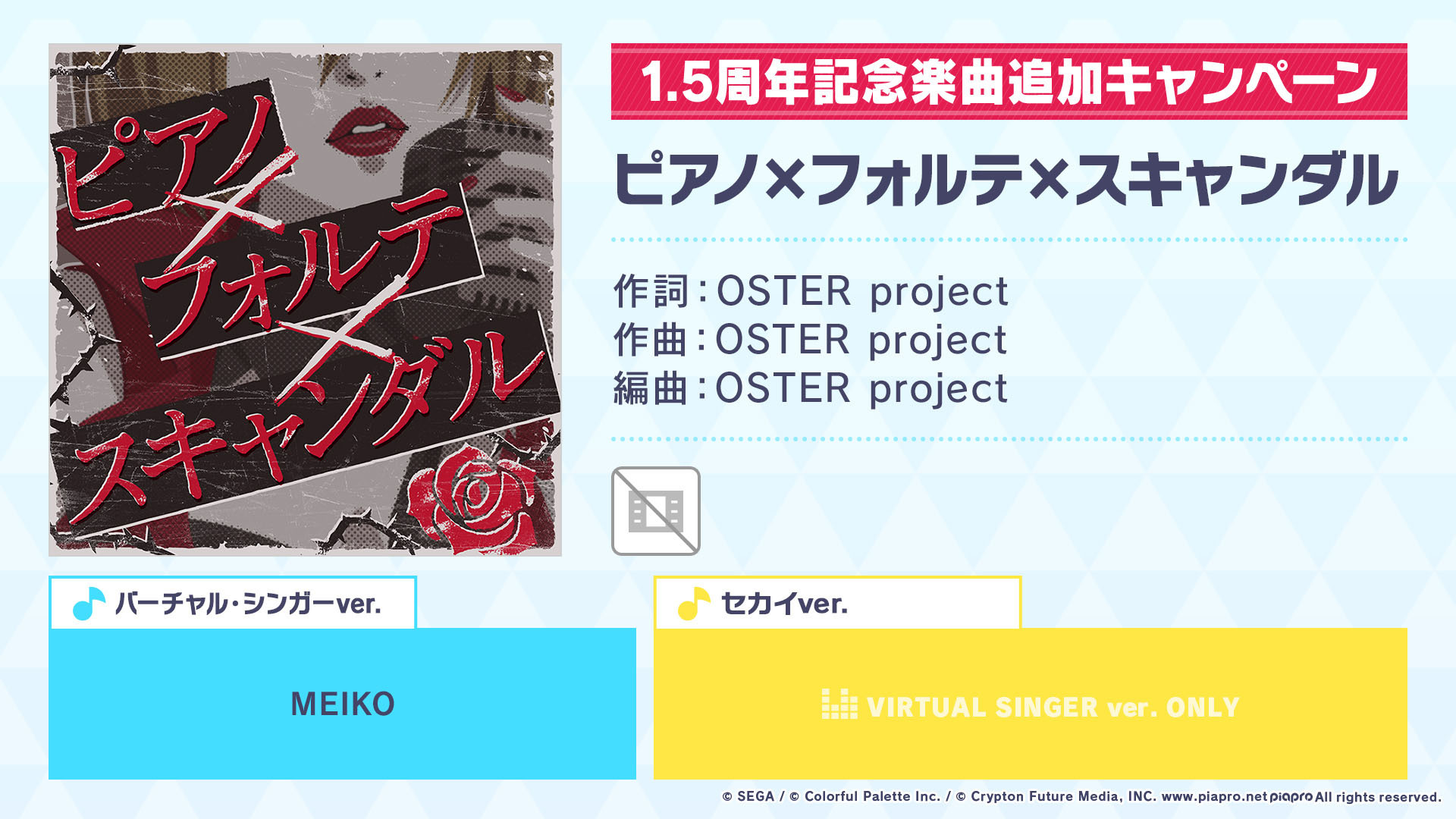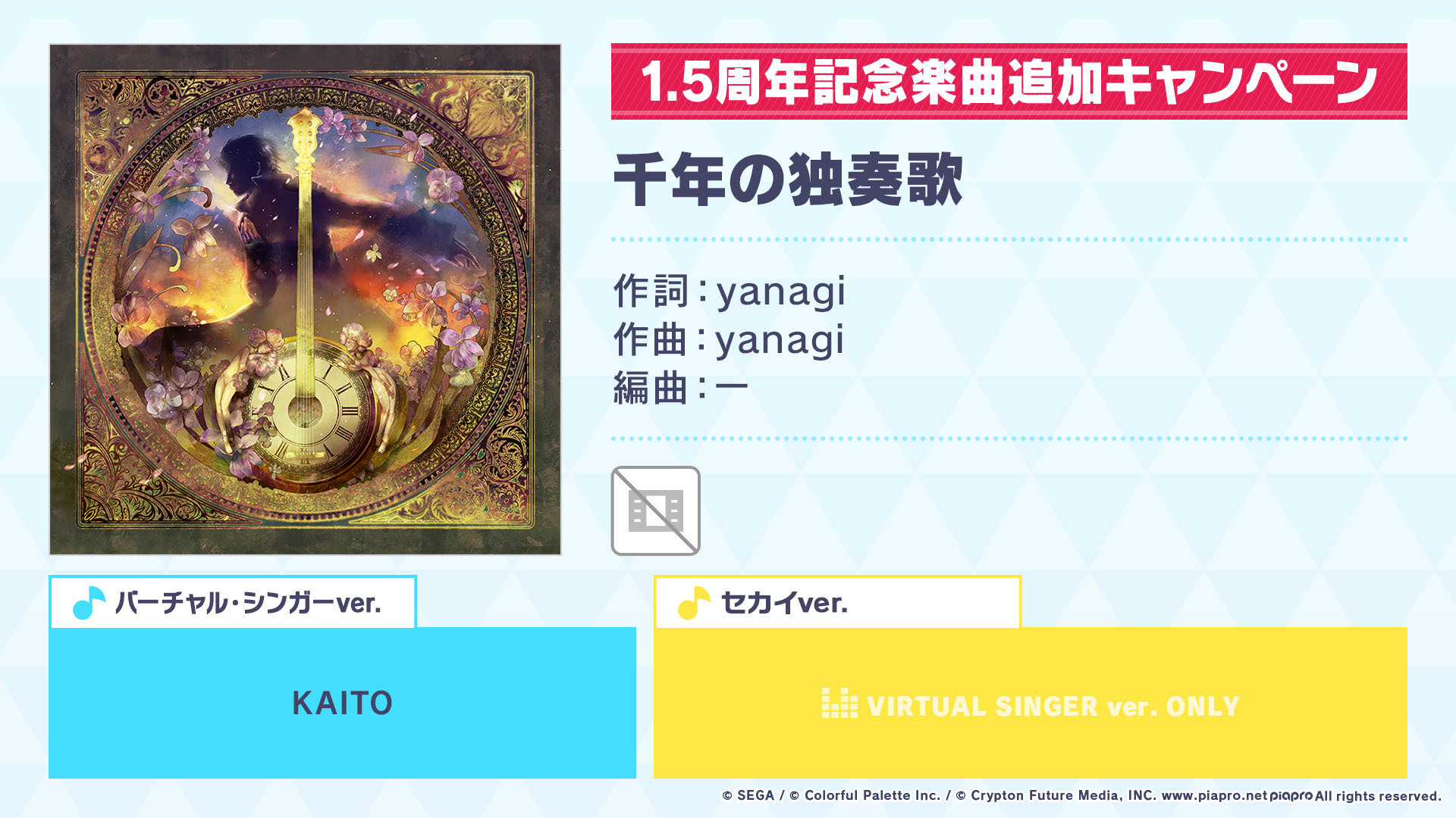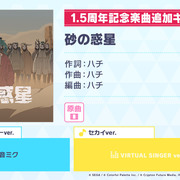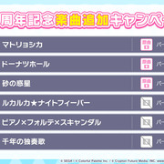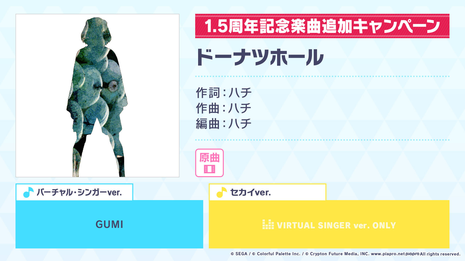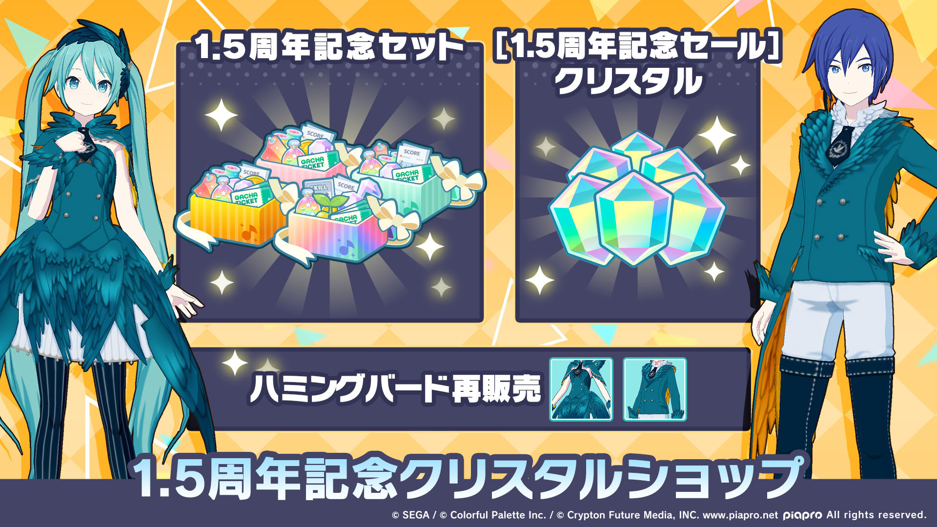 3 月 9 日直播中預告過的「1.5 週年紀念歌曲追加活動」中登場的歌曲也正式公開。本活動將於 3 月 30 日至 4 月 4 日,陸續加入 Hachi(米津玄師)的「マトリョシカ」、「砂の惑星」及 SAM(samfree)的「ルカルカ★ナイトフィーバー」等共 6 首歌。