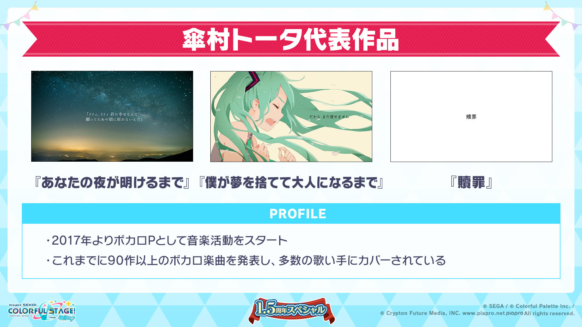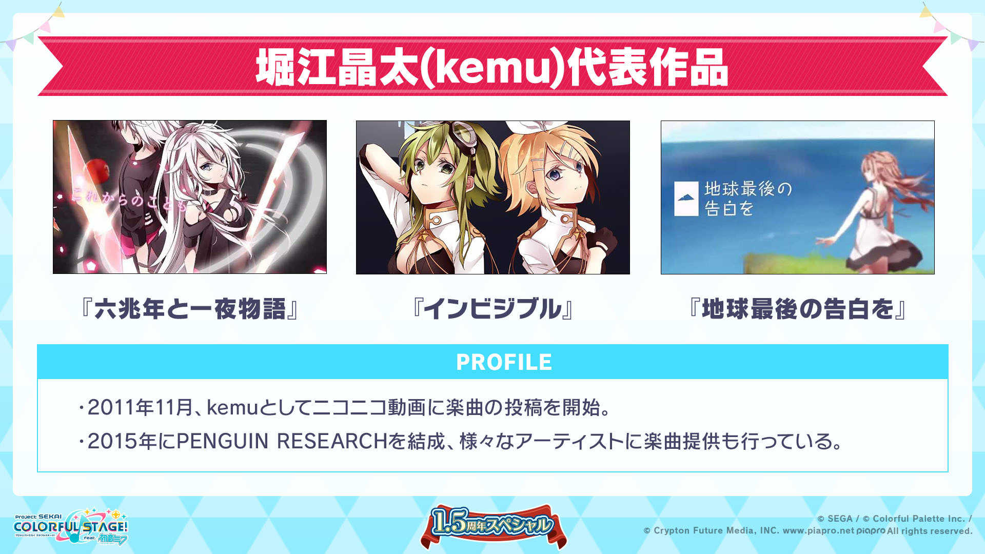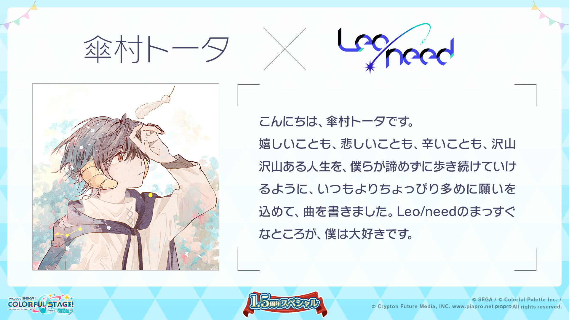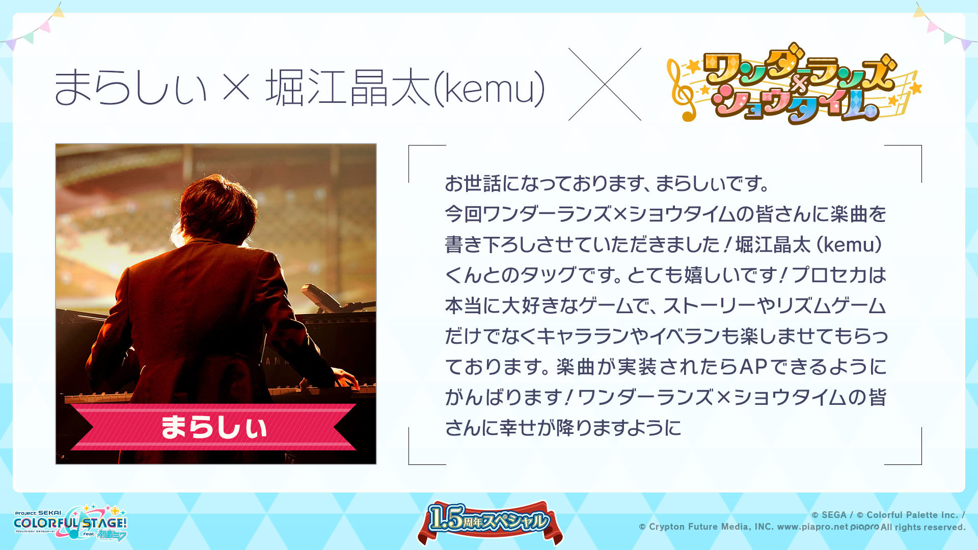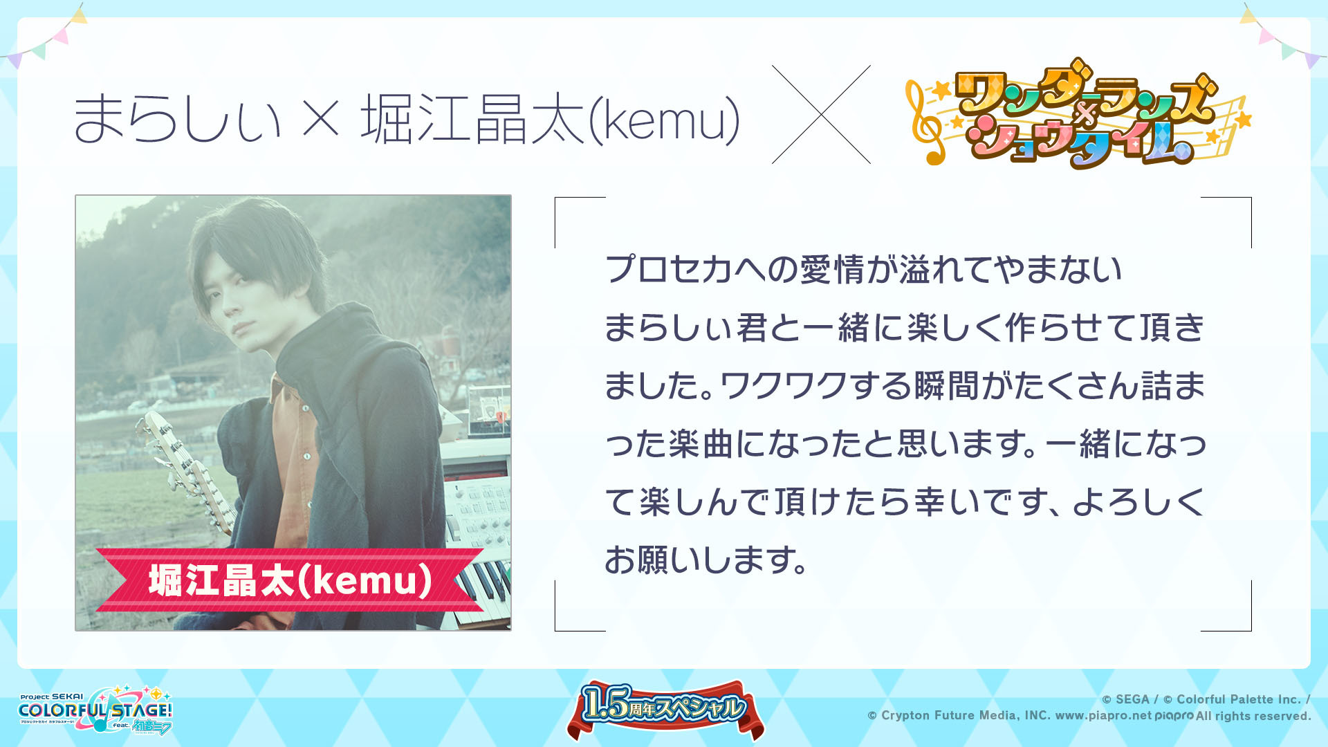 緊接在 1.5 週年情報後的「Proseka News」環節中,發表了全新的歌曲情報。本次公開了堀江晶太(kemu)、傘村トータ兩位全新的創作者,他們將為本作專門打造歌曲,分別為 Wonderlands×Showtime 及 Leo/need 製作團體歌曲。