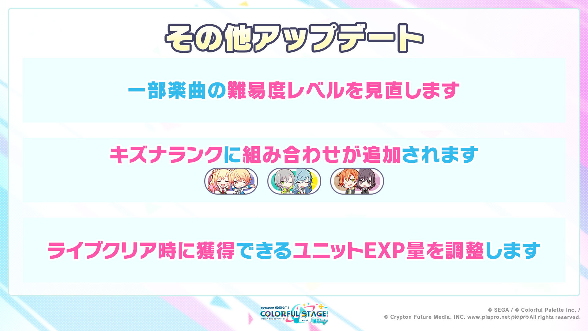 其他還有像是玩家間的對戰內容「Rank Match」、重新審視部分歌曲難易度、下一期活動等,發表了多項未來更新內容。