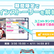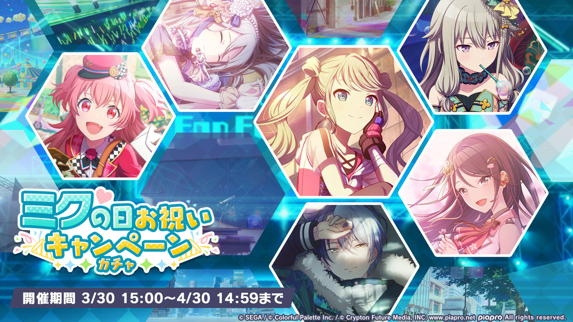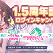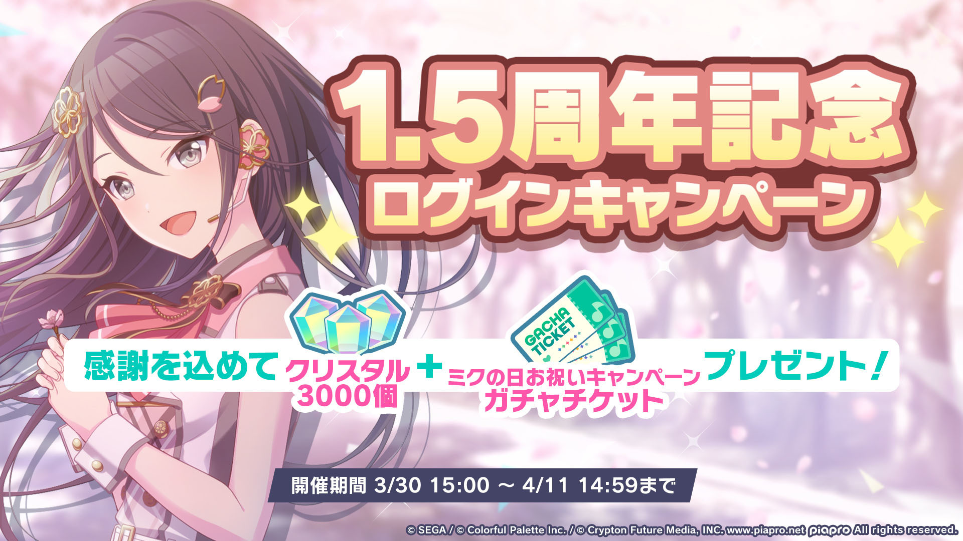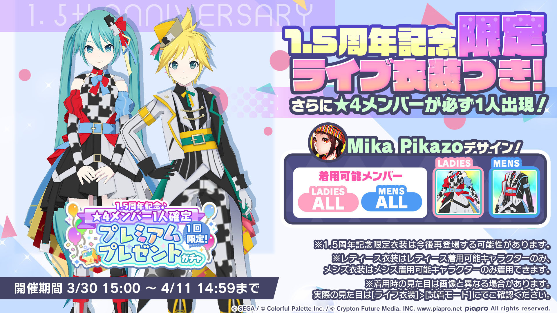 首先是關於「1.5 週年情報」環節中公布的內容。官方宣布,為紀念遊戲上市 1.5 週年,3 月 30 日將實施能獲得「水晶」3000 個、「初音日慶祝活動轉蛋券」的登入活動,以及附帶限定 Live 服裝的「特別禮物轉蛋」。