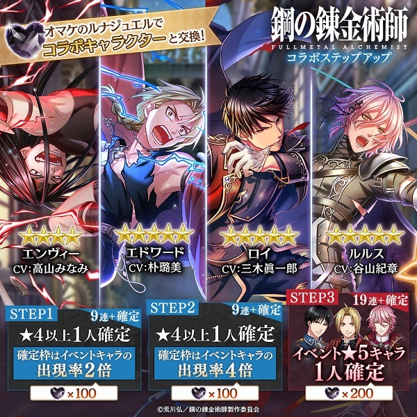 在本次合作中,阿爾馮斯(CV:釘宮理恵)將會在登錄獎勵以及合作活動「鋼鉄纏う緋き心」中登場,愛德華(CV:朴璐美)以及羅伊(CV:三木眞一郎)、恩維(CV:高山みなみ)則會在合作轉蛋及活動內出現。活動獎勵則為阿爾馮斯以及亭普拉 Event Ver.。
