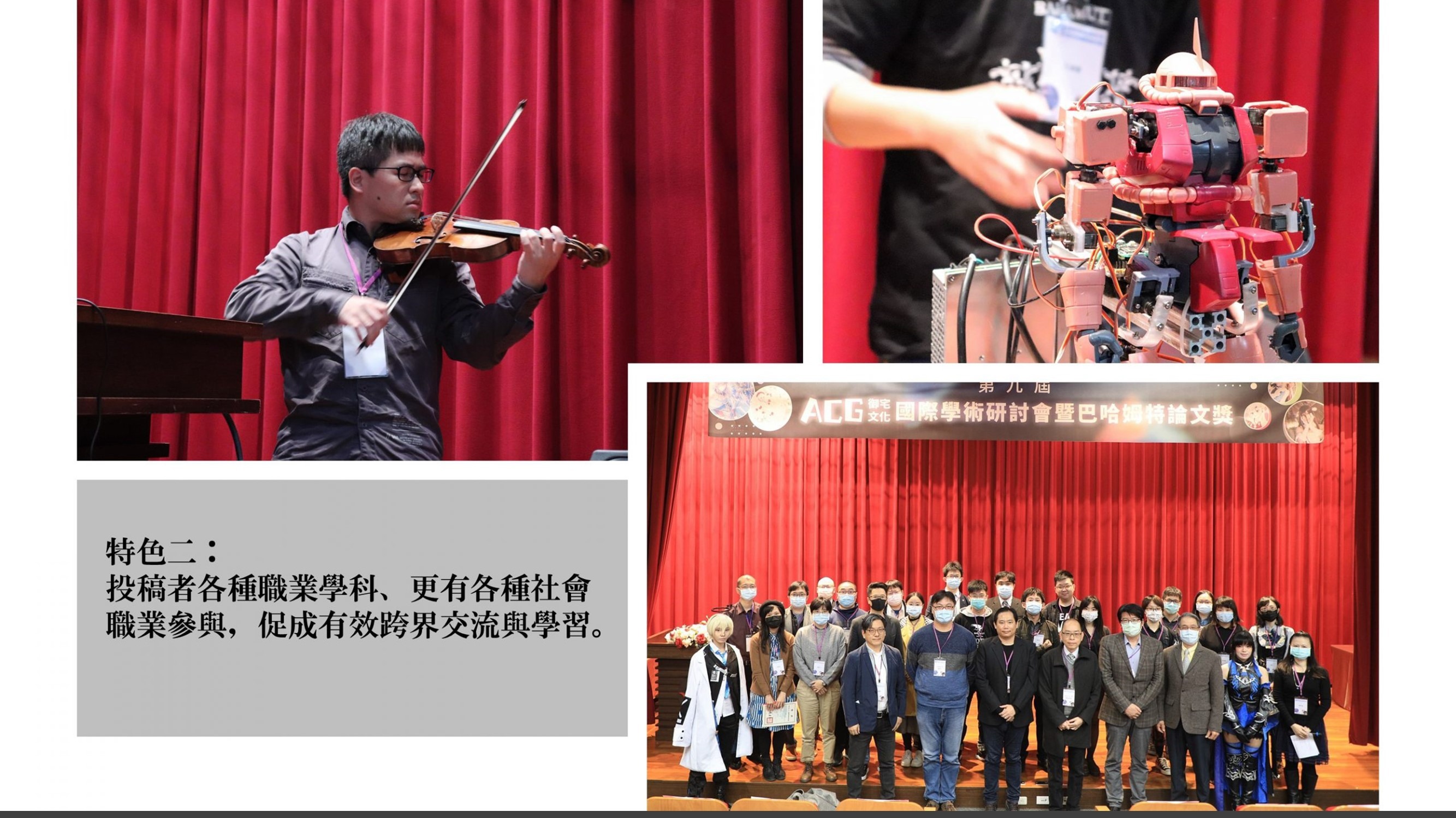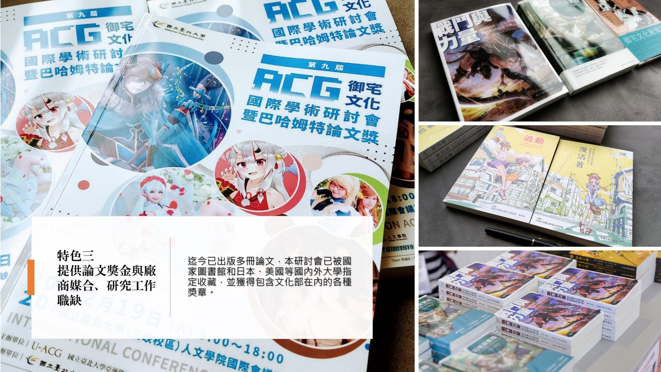 ACG 文化國際學術研討會從 2012 年由國立交通大學數位文創動畫學程創設以來,在主辦人梁世佑老師和多位教授的支持和努力之下,已經成為國內,乃至於亞洲廣義流行娛樂與產業中最重要的研討會。