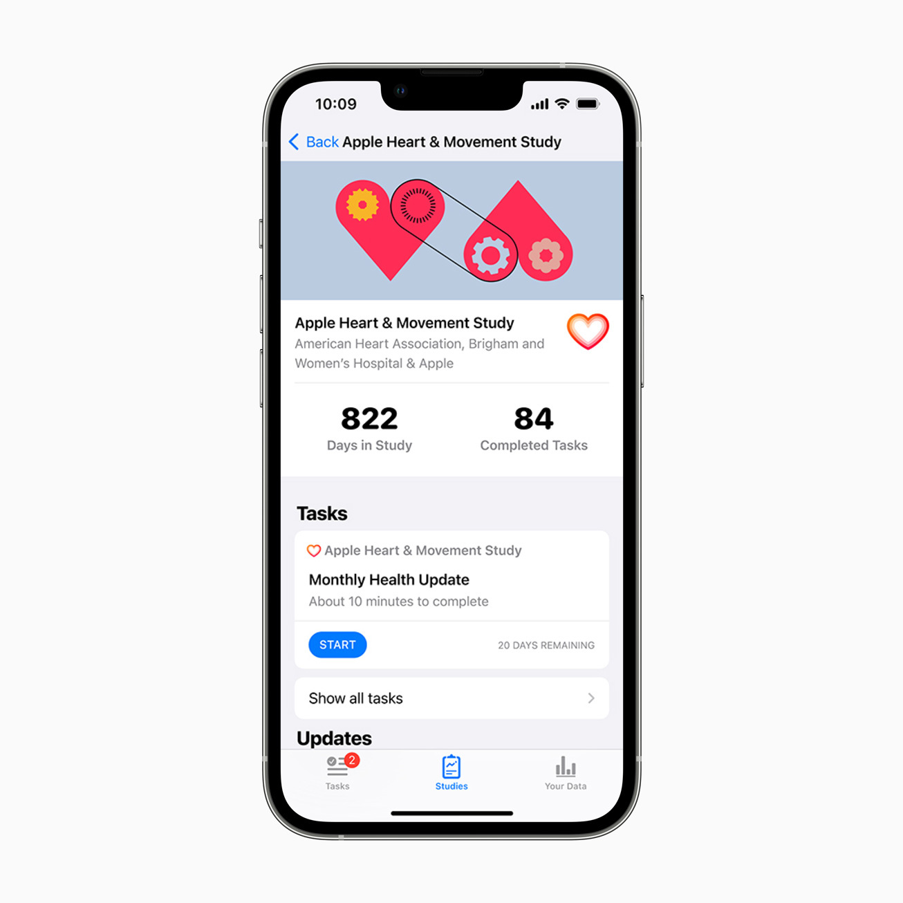 ResearchKit 框架讓研究人員有機會從龐大的 iPhone 和 Apple Watch 使用者群中招募研究參與者,並讓參與者選擇分享健康資料以幫助推進科學發展。透過「研究」app,Apple 與哈佛大學陳曾熙公共衛生學院合作和美國國家環境衛生科學研究所、布萊根婦女醫院和美國心臟協會、密西根大學和世界衛生組織合作,提供美國各地的使用者參與三項首屈一指的研究的機會:「Apple 女性健康研究」、「Apple 心臟和運動研究」以及 「Apple 聽力研究」。報告中顯示這些研究的初期發現,以及 Apple 支持的其他研究相關資訊,例如與 University Health Network 合作的「心臟衰竭研究」和與加州大學洛杉磯分校合作的「數位心理健康研究」。