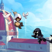 下行專屬動作 ─ 埃齊歐躍入空中,使用他的伊甸蘋果投射出白鳥,當他落下時,會在四散的鳥群中用袖劍砍向對手。