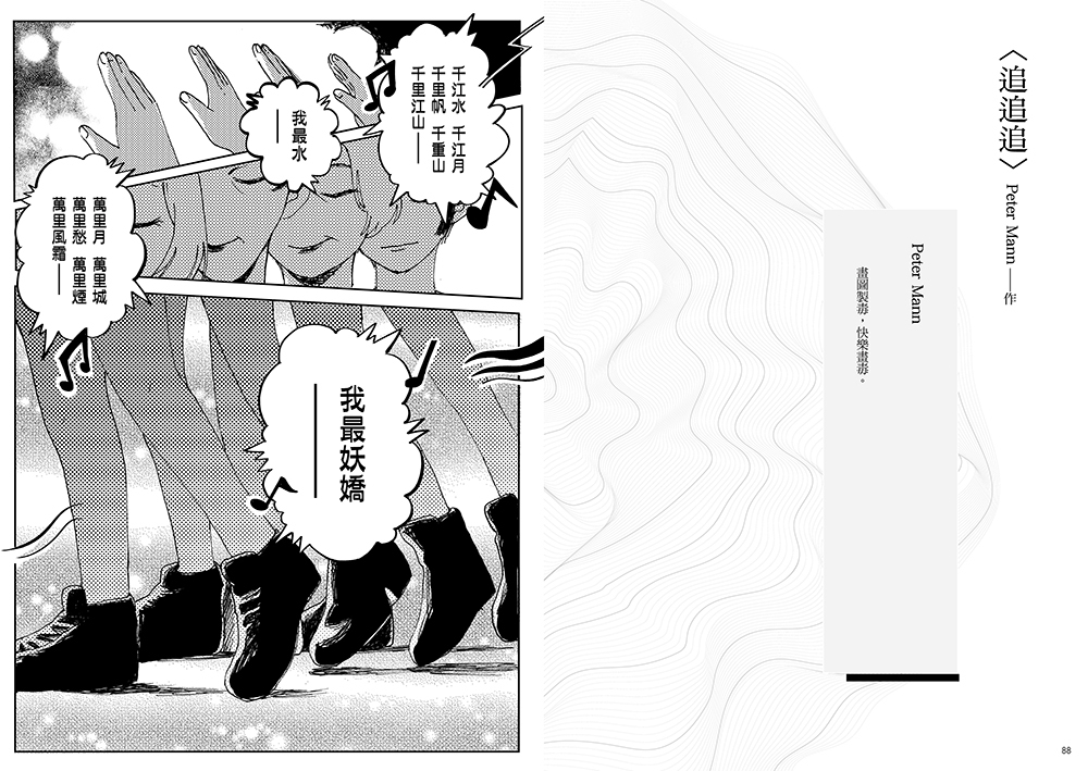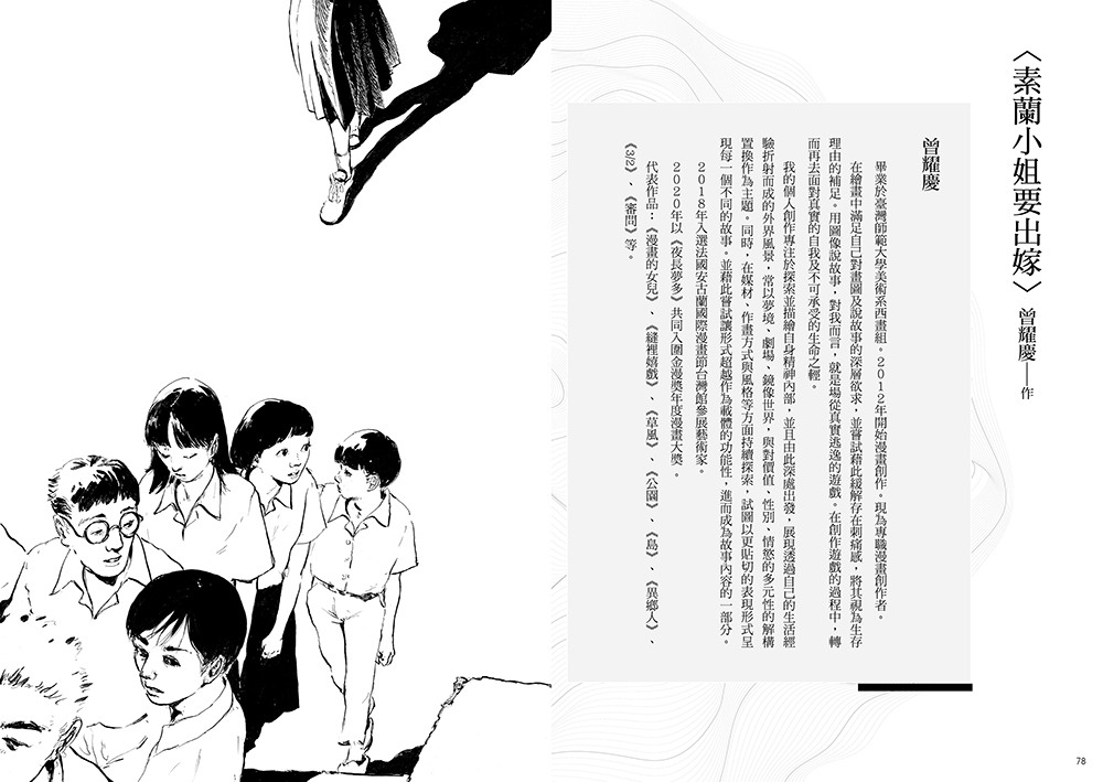 漫畫家曾耀慶則選擇了耳熟能詳的〈素蘭小姐要出嫁〉,他也深入研究歌曲起源,「最早這是北海道居民工作時唱的歌,也曾是日本運動會或健康操的音樂,因為節奏明快,很適合振奮精神或提高群體協調性。後來歌謠流傳進台灣,為了搭配電影情節而加入歌詞,才成為我們熟悉的情愛版本。」在曾耀慶的故事裡,他串起了高中生、謠言、女孩要出嫁等三個要素,打造了一個關於曖昧謠言的故事。