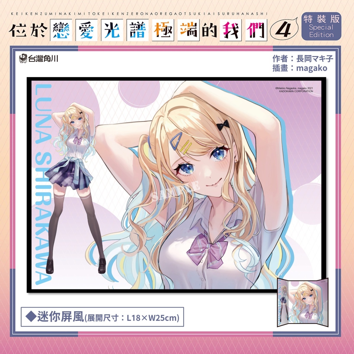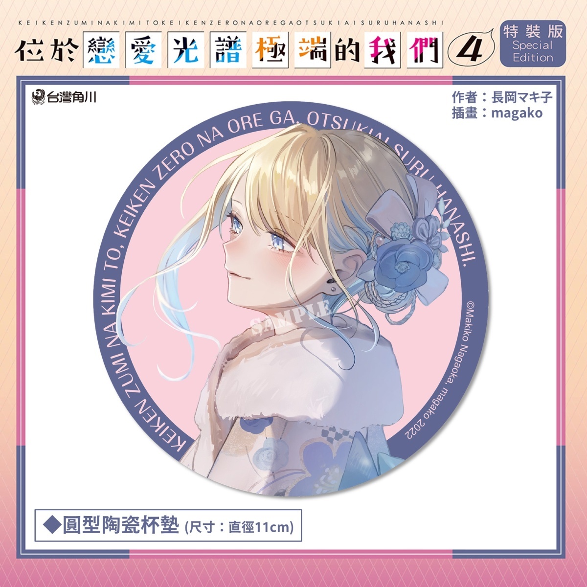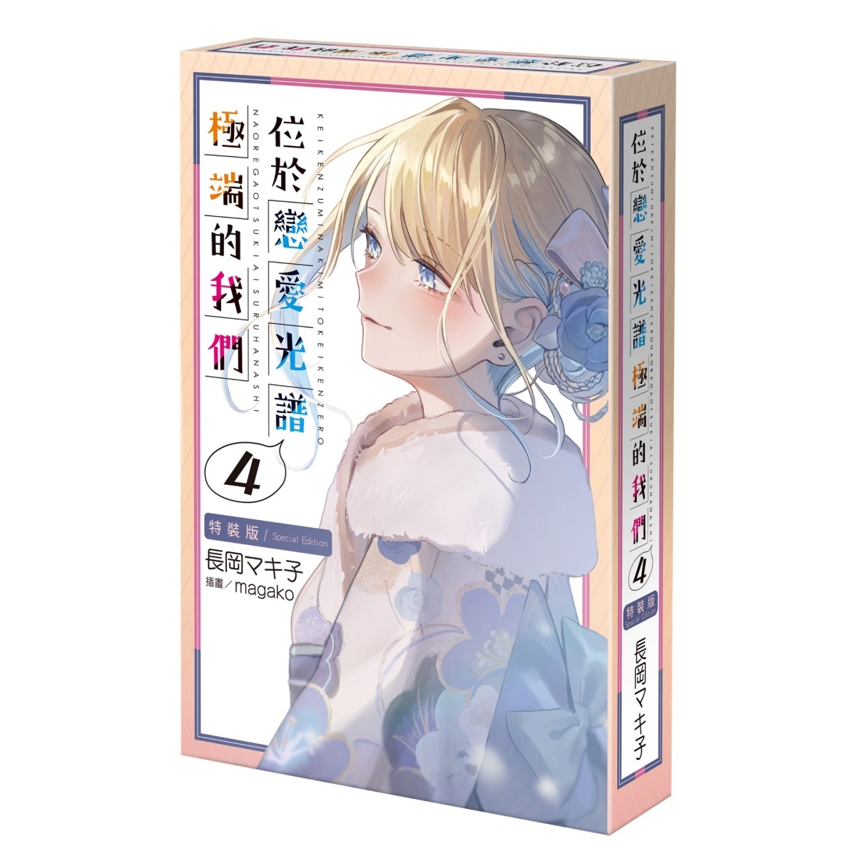 位於戀愛光譜極端的我們 (4)》特裝版規劃以月愛為主題的多款特典:「迷你屏風」及「圓型陶瓷杯墊」分別收錄月愛的青春活力制服造型及唯美和服優雅造型;「限定 4P 小冊子」收錄精彩短篇故事。