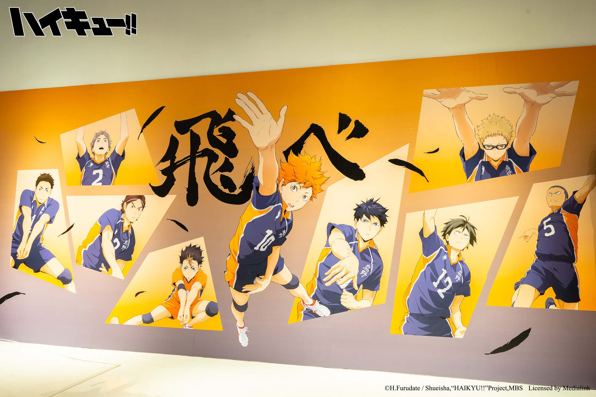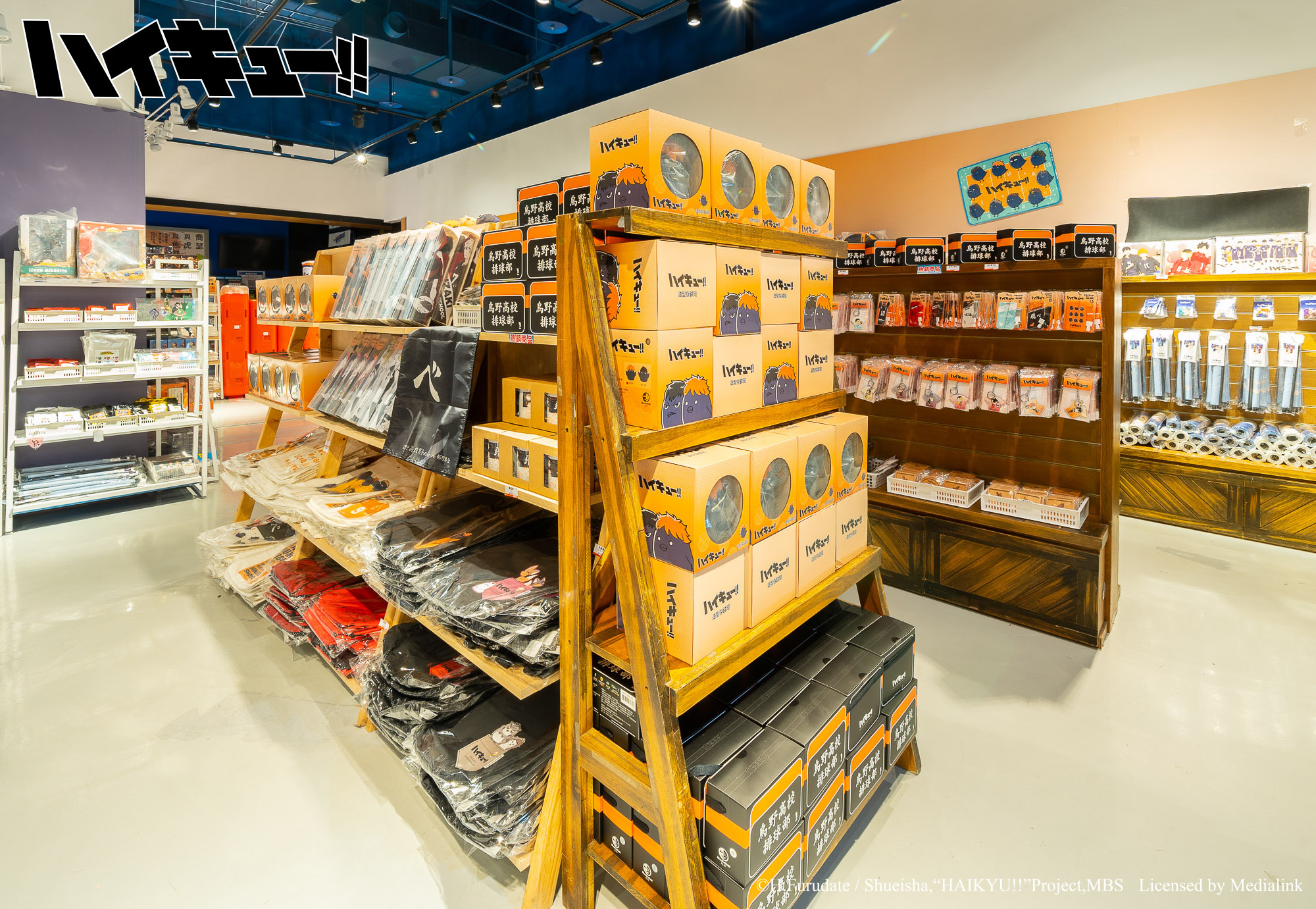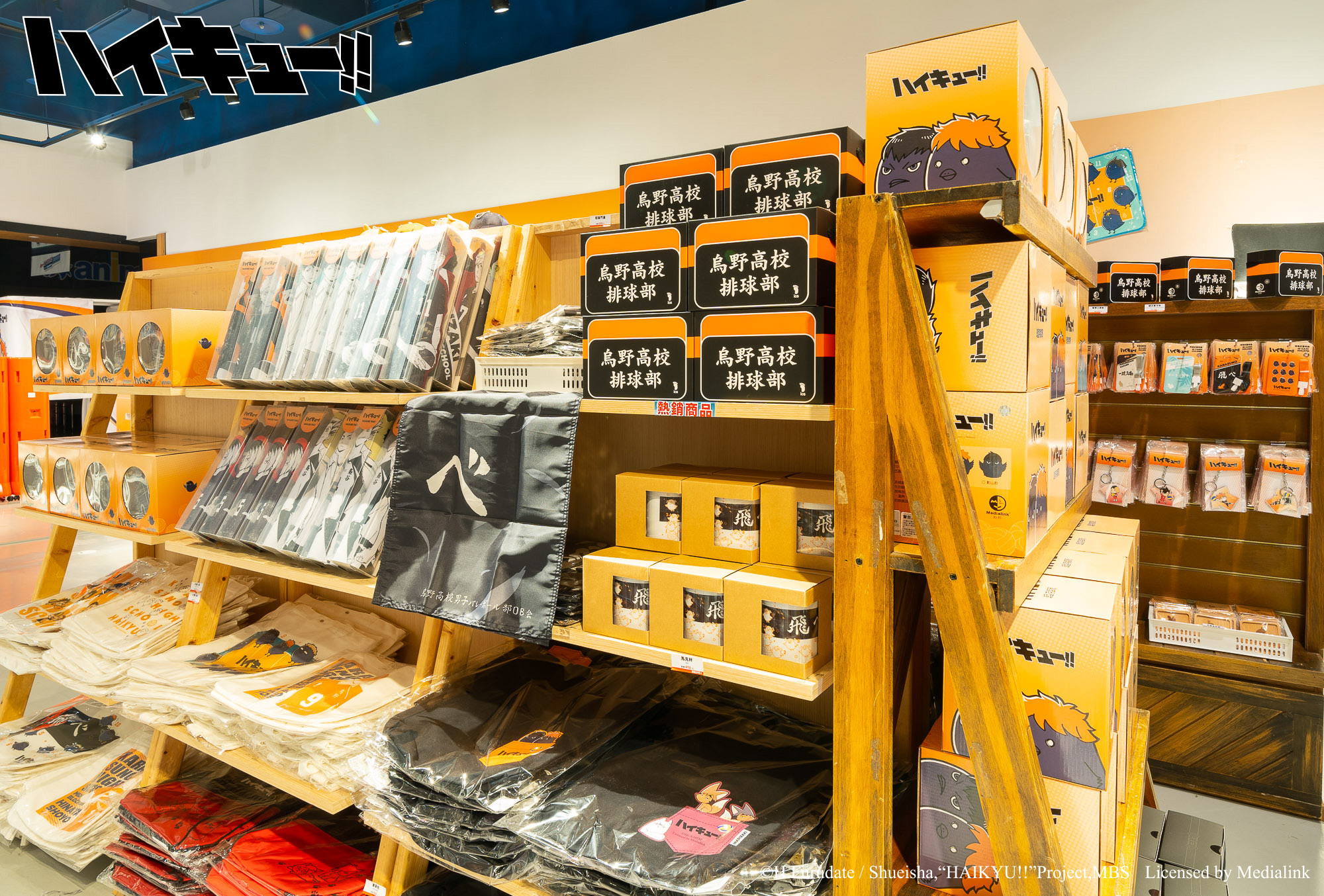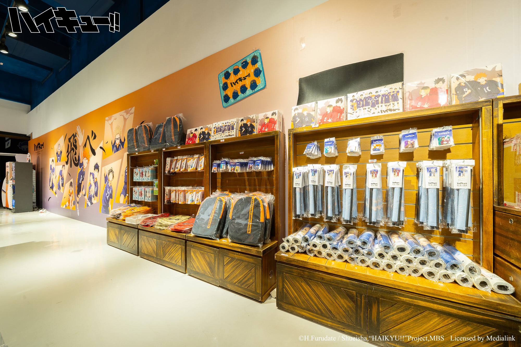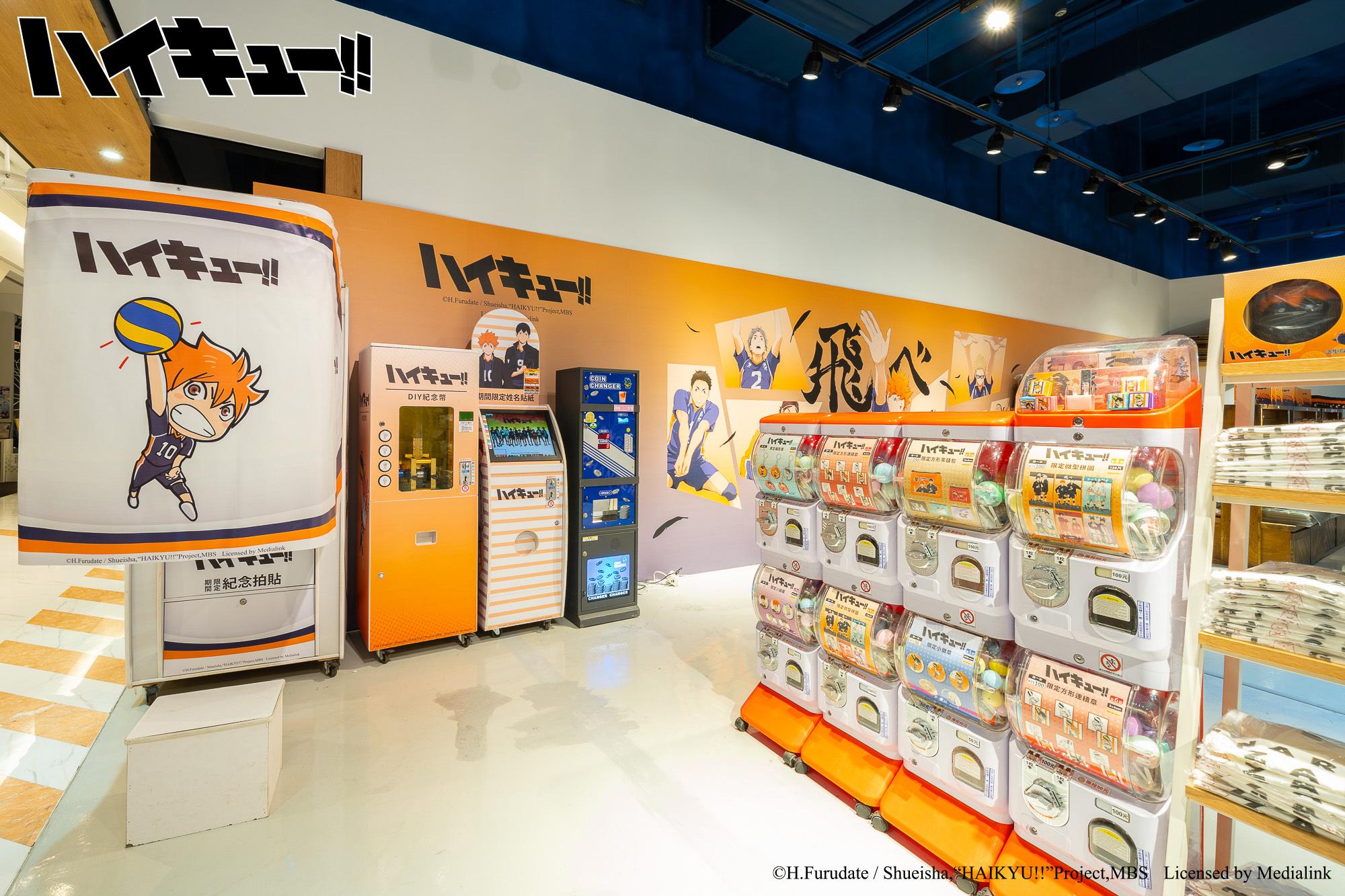 排球少年!!》主題快閃店特別將「飛べ主題牆」加長至超過 10 米外,還有日向影山、月島山口雙人立牌。快閃店也再次推出「排球巨型扭蛋機」,內含公仔、各校標語旗幟等週邊。此外,還有日向、影山小烏鴉「造型存錢筒」、「飛べ標語短版門簾」等超過 30 款全新週邊,更有角色、Q 版角色、各校標語以及各校代表動物等多種圖樣週邊商品。