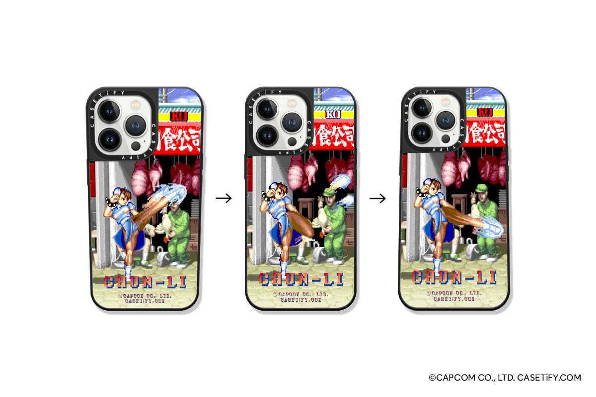 除此之外,聯名系列中特別推出限量版透鏡式手機殼,以街頭格鬥女王春麗為主角,重現她的經典招式「百烈腳」,此招式可讓玩家在短時間內不斷踢腿攻擊,且因操作簡單而成為《快打旋風》系列遊戲中最受玩家喜愛的招式之一。Street Fighter x CASETiFY 限量透鏡式手機殼期望透過動態立體圖像效果展現出百烈腳的神威,消費者亦可透過左右傾斜手機,欣賞春麗的英姿。限量版透鏡式手機殼售價為新台幣 1,850 元起。