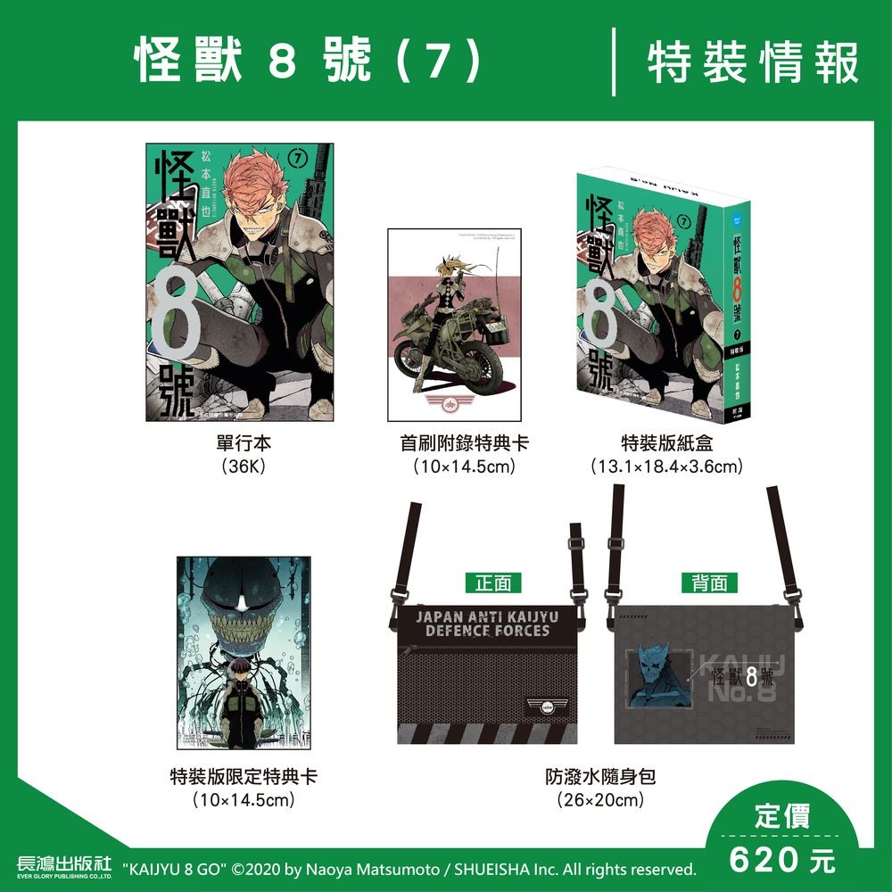 松本直也《怪獸8號(7)》怪獸9號前來搶奪防衛隊長官‧四之宮功持有的怪獸2號之力。儘管功在激烈戰鬥後將9號逼入絕境,卻用盡力量沒能給他最後一擊,使2號之力落到9號手中。隨後卡夫卡、琪歌露,以及鳴海也抵達現場,與打倒長官並與其融合的9號展開戰鬥,但…?!特裝版帶來怪獸8號防潑水隨身包+特裝版限定特典卡!