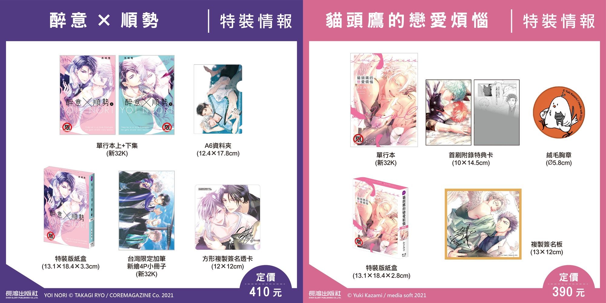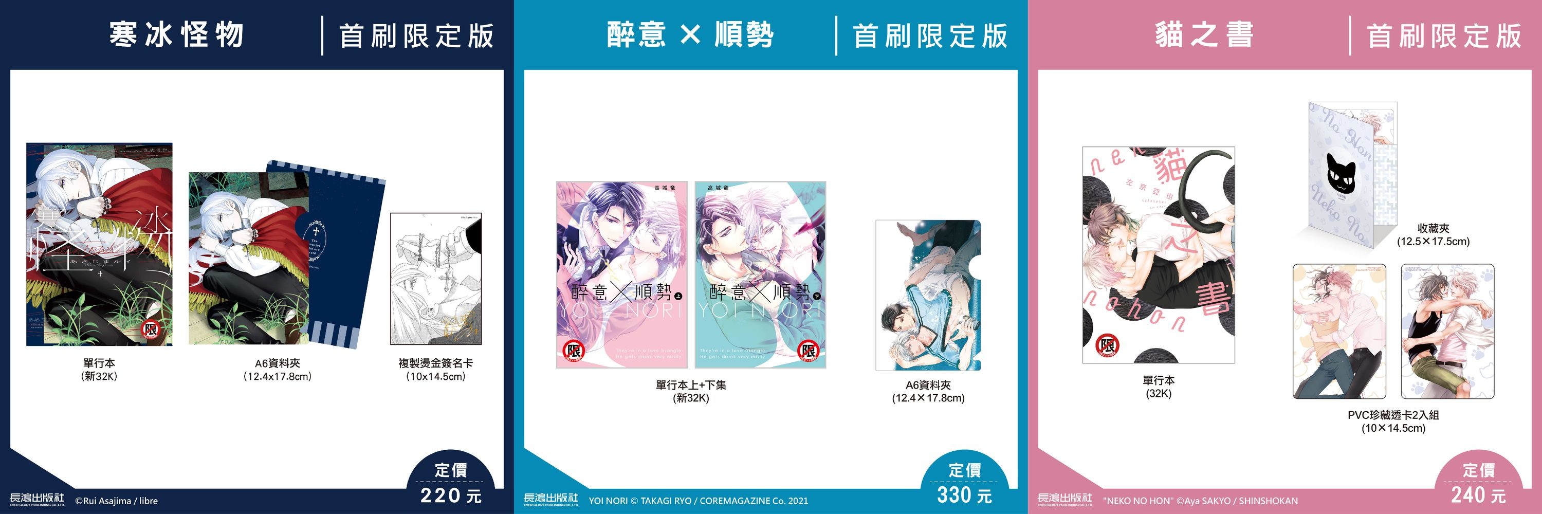 度過漫長歲月的吸血鬼╳淫亂又孤獨的神父,あさじまルイ《寒冰怪物》限定版,推出A6資料夾與複製燙金簽名卡等首刷限定內容;《醉意×順勢》與《貓之書》也有推出首刷限定版供讀者選購。