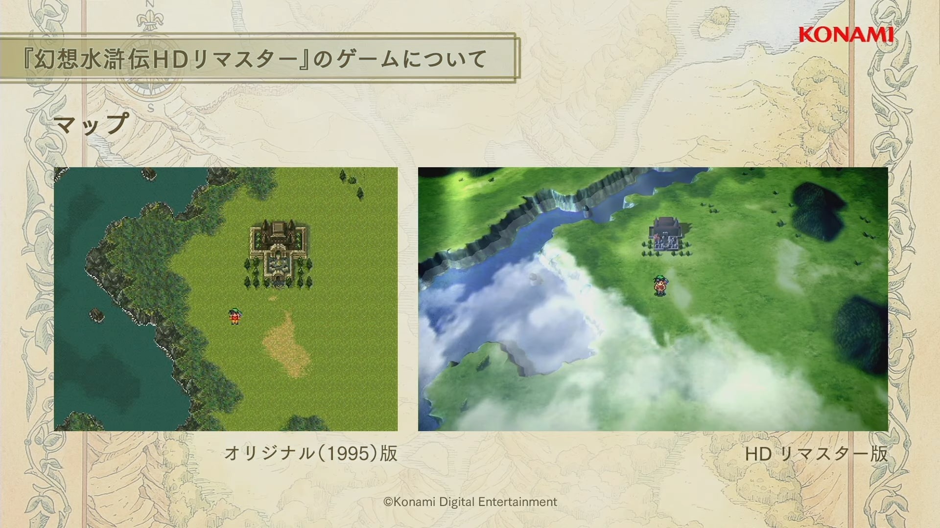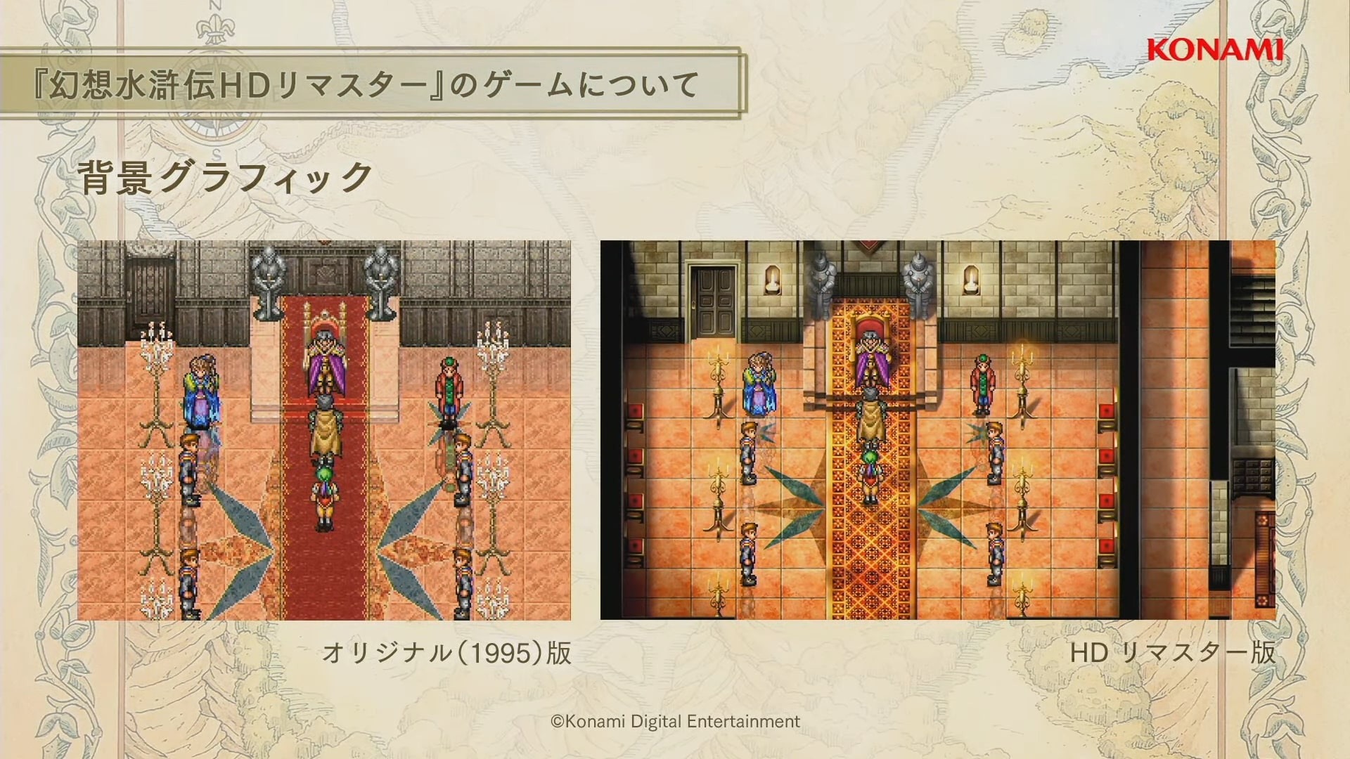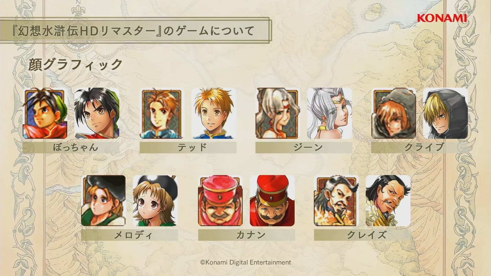 幻想水滸傳》為 KONAMI 代表性原創 RPG 系列的第一部作品,以中國古典小說《水滸傳》為原型,描述寄宿著「紋章」之人其宿命的故事,遊戲裡收集 108 位夥伴與描述家人、夥伴之間羈絆的感人故事受到全世界玩家的好評。1995 年首次於 Play Station 平台推出,2006 年也登陸 Play Station Protable 平台。