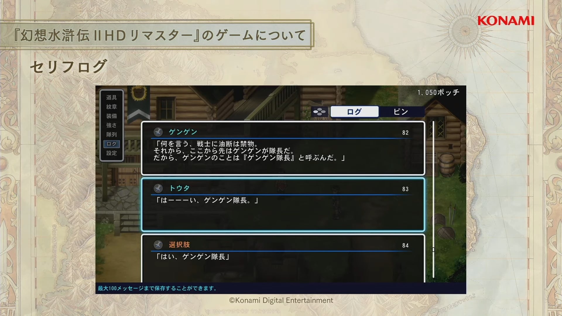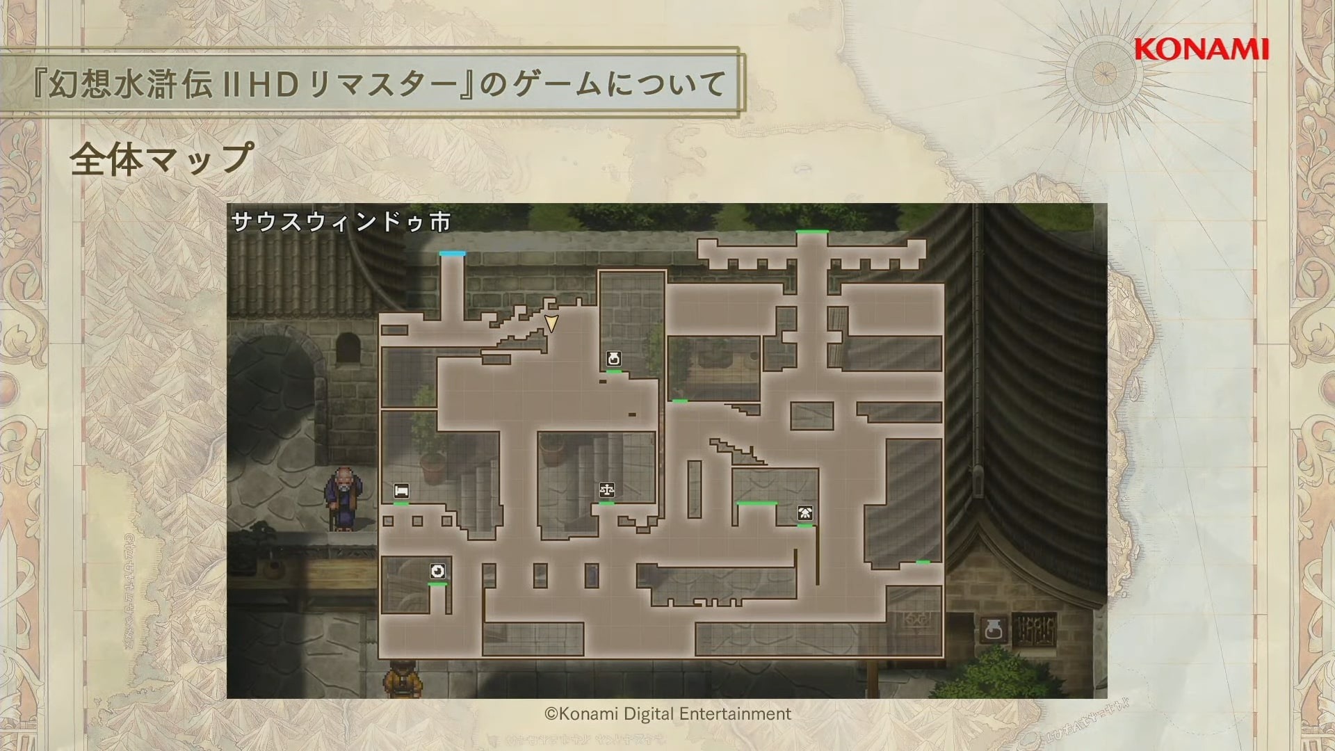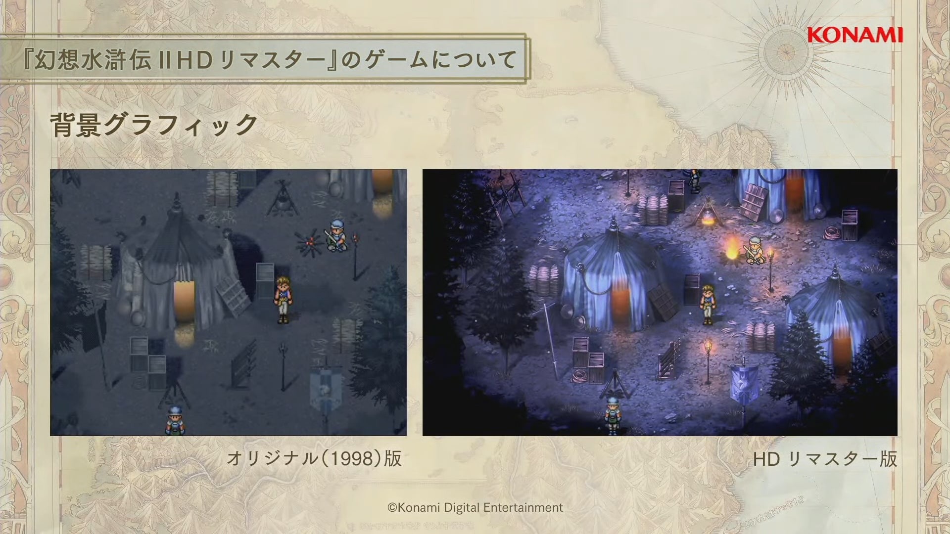 幻想水滸傳》為 KONAMI 代表性原創 RPG 系列的第一部作品,以中國古典小說《水滸傳》為原型,描述寄宿著「紋章」之人其宿命的故事,遊戲裡收集 108 位夥伴與描述家人、夥伴之間羈絆的感人故事受到全世界玩家的好評。1995 年首次於 Play Station 平台推出,2006 年也登陸 Play Station Protable 平台。