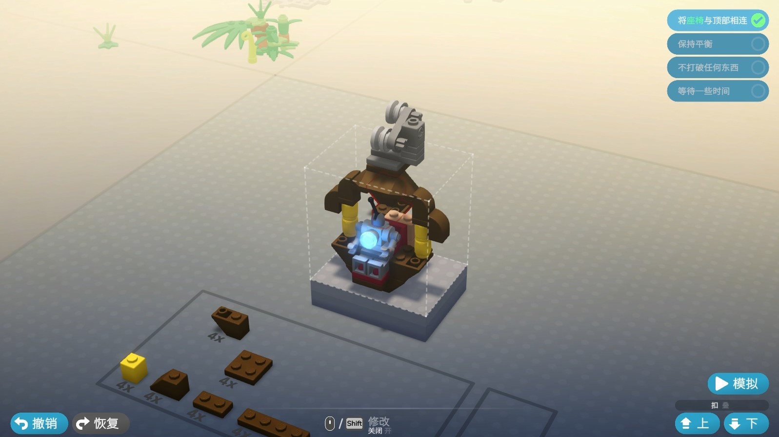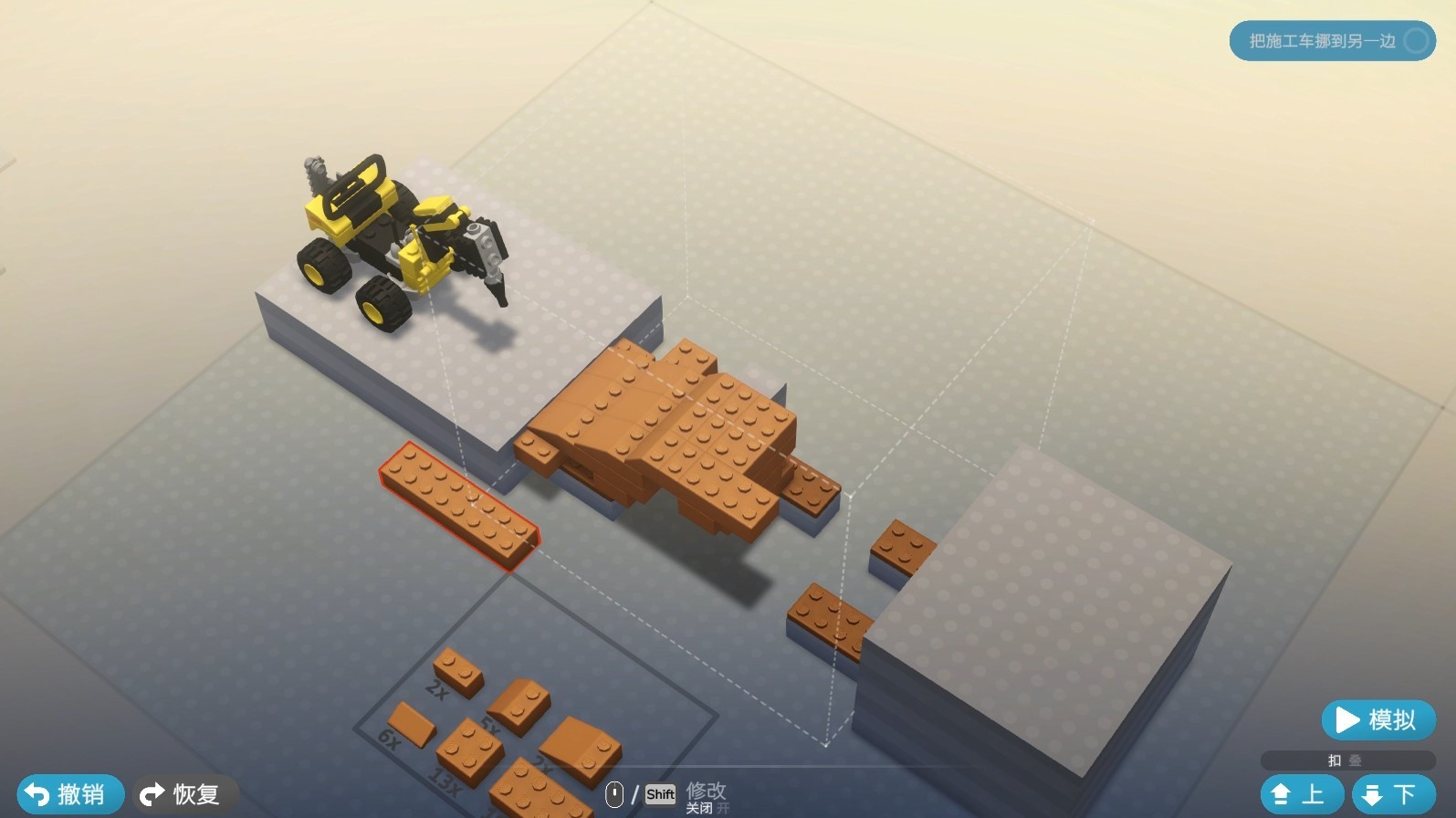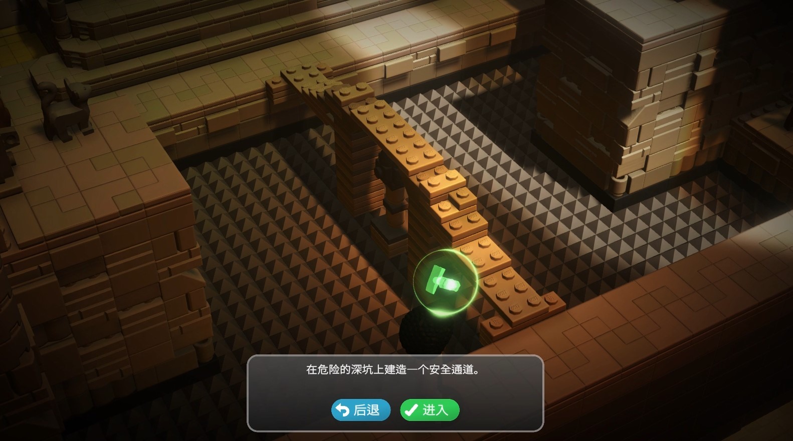 遊戲主要玩法就是透過地圖上的槌子圖案,也就是「建造」來冒險,像是造橋、重建同樣的石像,甚至是建造纜車等特殊的交通工具,利用這些方式通過各種地形與考驗。需要透過玩家的想像力跟空間能力、甚至是動用到了物理概念,才能順利地遊玩,而在建造時,整個建造場景是可以 360 度旋轉、縮放的,而積木會透過陰影、錨點等方式輔助玩家確認位置並進行放置,比較可惜的是建造時積木的素材區域是固定的,所以當轉換視角時,很難去拿取積木填補建築物的空缺。只講求趕快通關的話,最快也要 5 分鐘才能蓋好,而且還要零失誤直接通關,簡直難上加難。每次建造時,筆者彷彿在觀賞機器人跌倒搞笑全集一樣(笑)。
