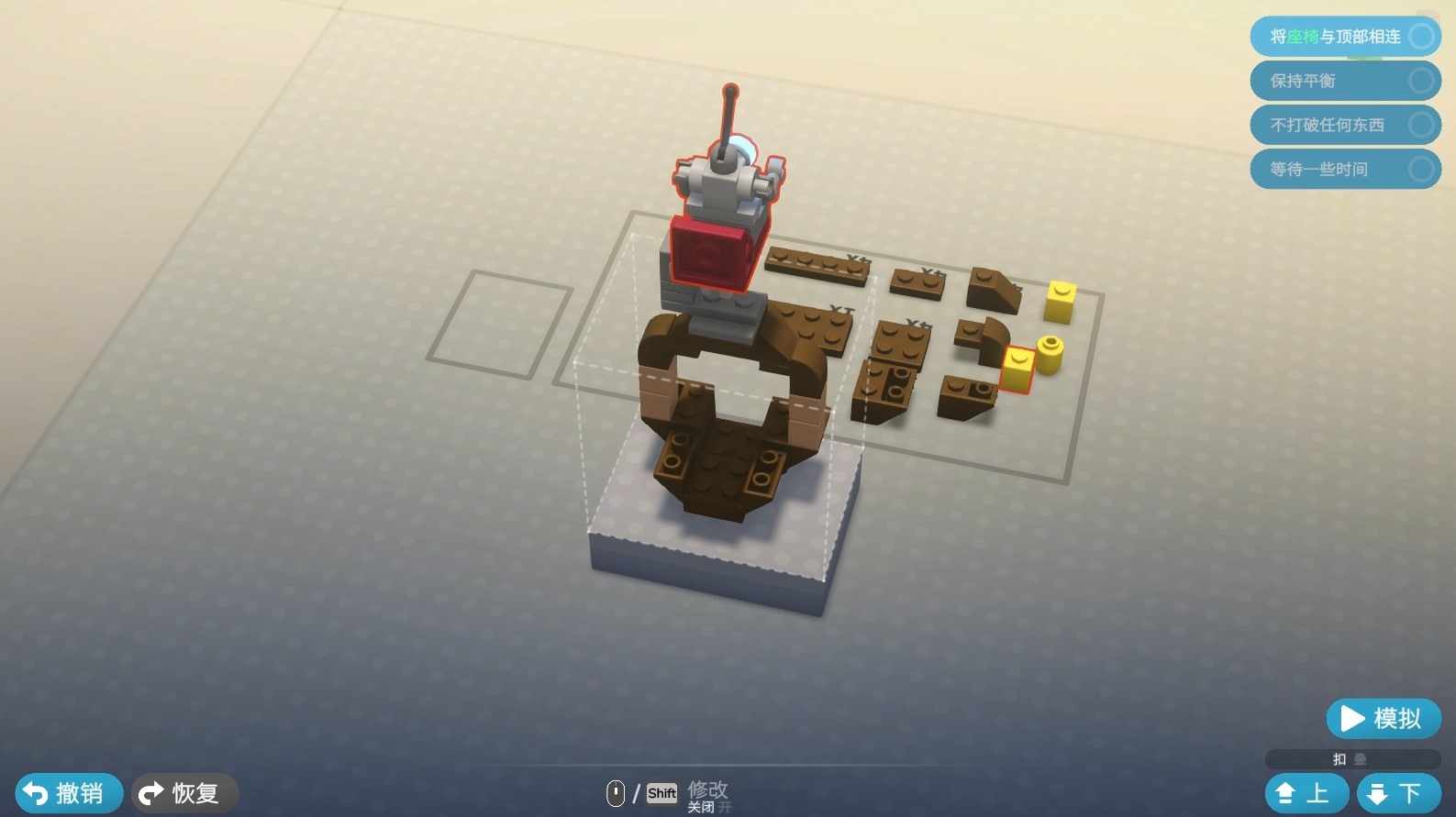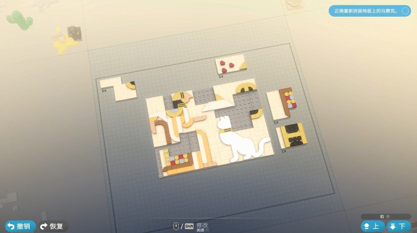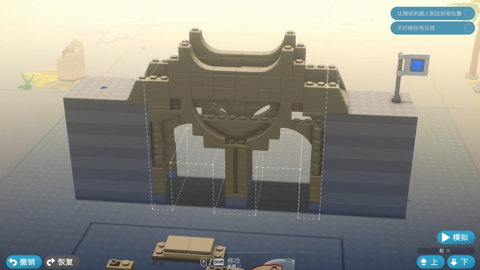 遊戲主要玩法就是透過地圖上的槌子圖案,也就是「建造」來冒險,像是造橋、重建同樣的石像,甚至是建造纜車等特殊的交通工具,利用這些方式通過各種地形與考驗。需要透過玩家的想像力跟空間能力、甚至是動用到了物理概念,才能順利地遊玩,而在建造時,整個建造場景是可以 360 度旋轉、縮放的,而積木會透過陰影、錨點等方式輔助玩家確認位置並進行放置,比較可惜的是建造時積木的素材區域是固定的,所以當轉換視角時,很難去拿取積木填補建築物的空缺。只講求趕快通關的話,最快也要 5 分鐘才能蓋好,而且還要零失誤直接通關,簡直難上加難。每次建造時,筆者彷彿在觀賞機器人跌倒搞笑全集一樣(笑)。