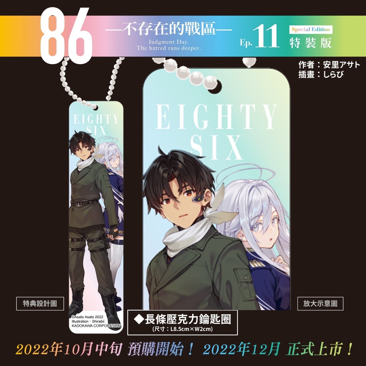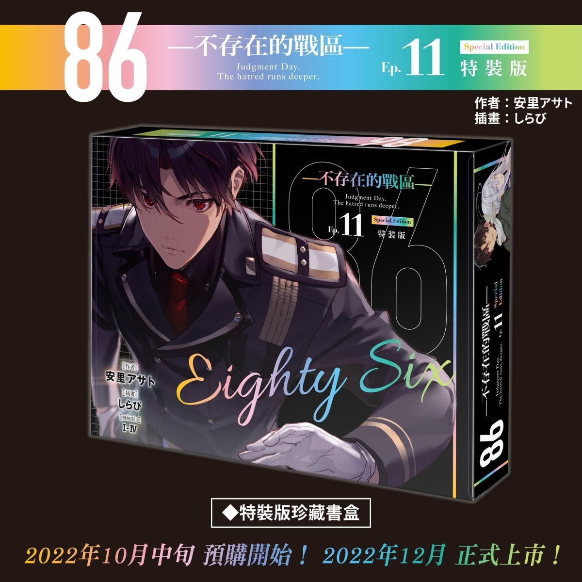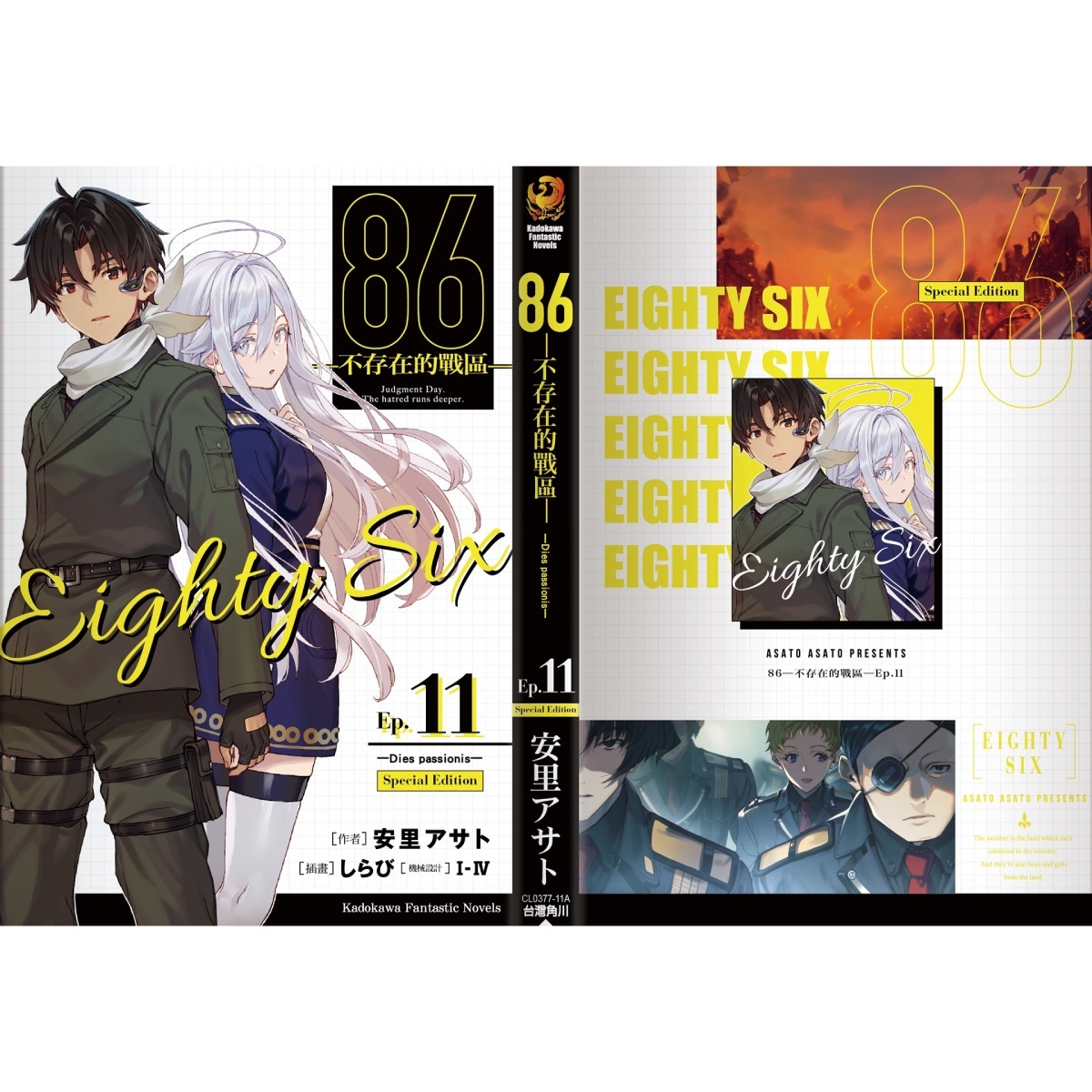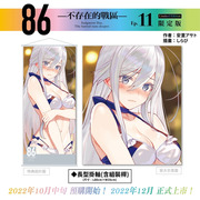 86-不存在的戰區-(Ep.11)》特裝 & 限定雙版本──以帥氣軍服辛為主題的【特裝版】收錄特典「特製萬用墊」、「長條壓克力鑰匙圈」及「特裝版紙質杯墊」,可於官網及全台指定書店預購;以穿著性感泳裝的羞澀蕾娜為主題的【限定版】則收錄特典「蕾娜長型掛軸(附桿)」、「造型皮革吊飾」及「限定版紙質杯墊」,僅開放台灣角川官網與博客來網路書店進行預購,雙版本皆收錄「本集小說 with 特別版書衣」。兩款特殊版本也將於 12 月特別活動會場正式開賣。