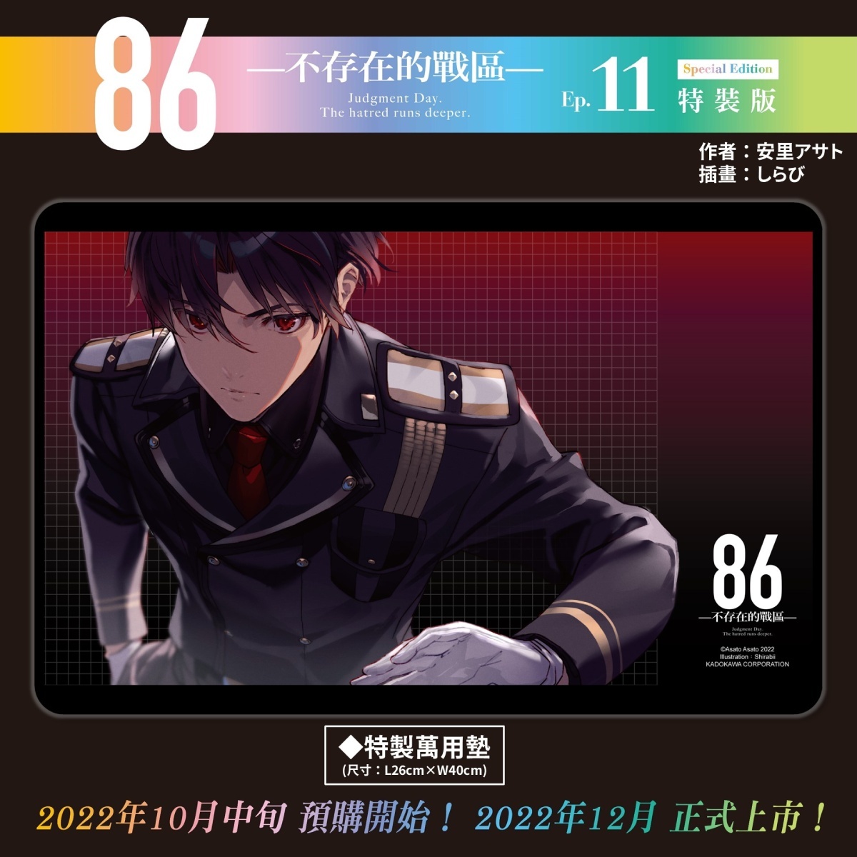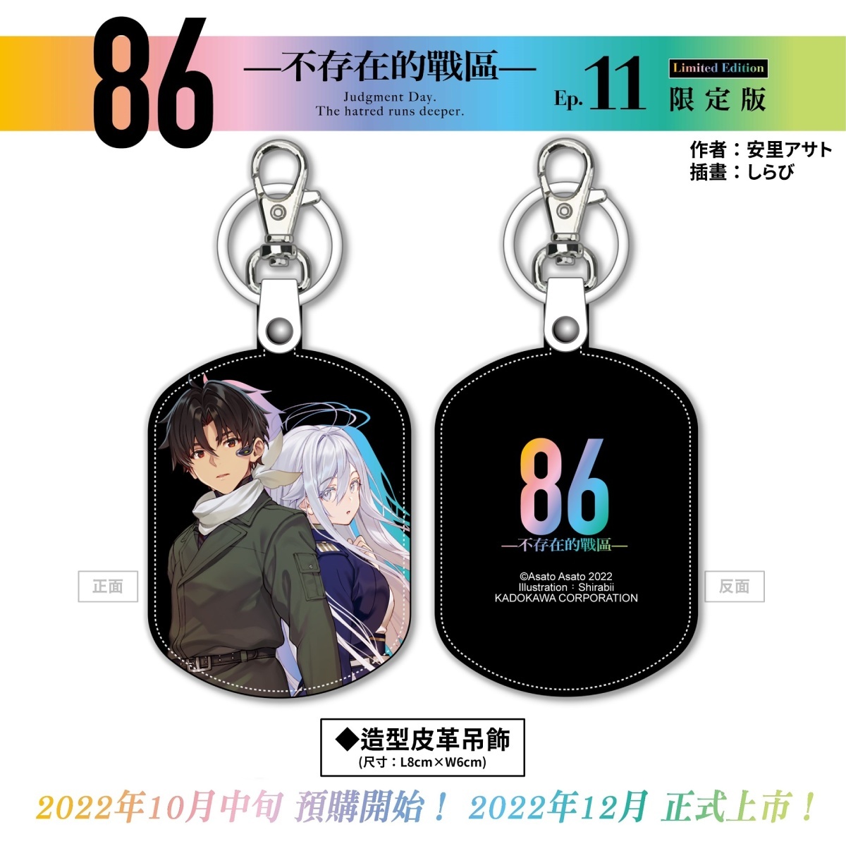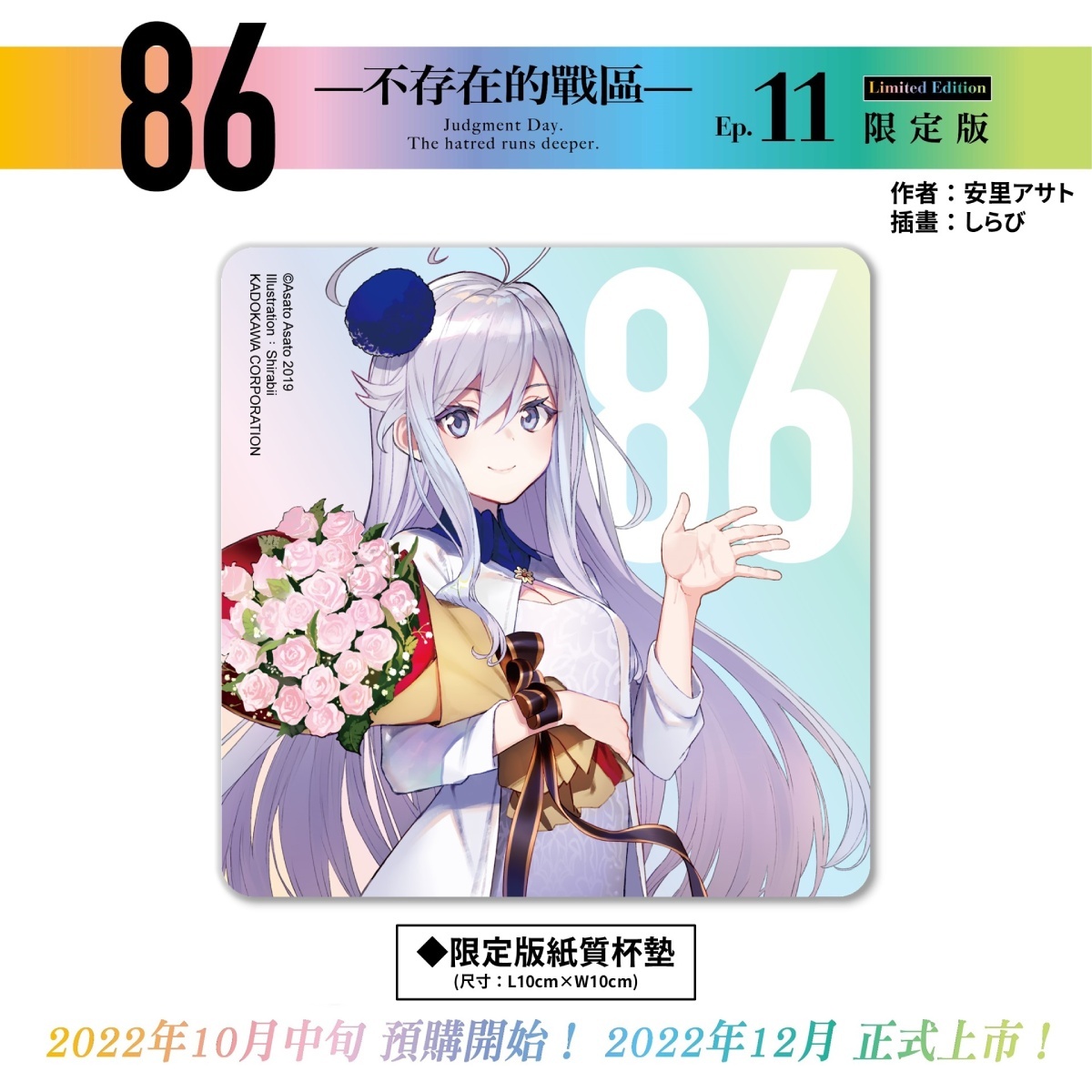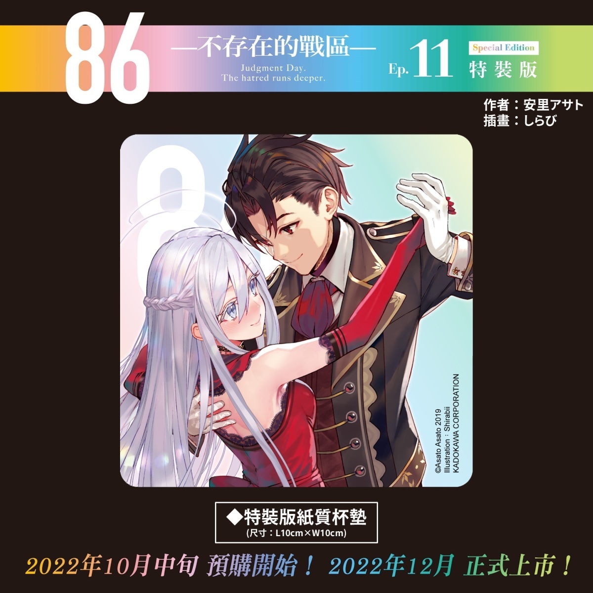 86-不存在的戰區-(Ep.11)》特裝 & 限定雙版本──以帥氣軍服辛為主題的【特裝版】收錄特典「特製萬用墊」、「長條壓克力鑰匙圈」及「特裝版紙質杯墊」,可於官網及全台指定書店預購;以穿著性感泳裝的羞澀蕾娜為主題的【限定版】則收錄特典「蕾娜長型掛軸(附桿)」、「造型皮革吊飾」及「限定版紙質杯墊」,僅開放台灣角川官網與博客來網路書店進行預購,雙版本皆收錄「本集小說 with 特別版書衣」。兩款特殊版本也將於 12 月特別活動會場正式開賣。