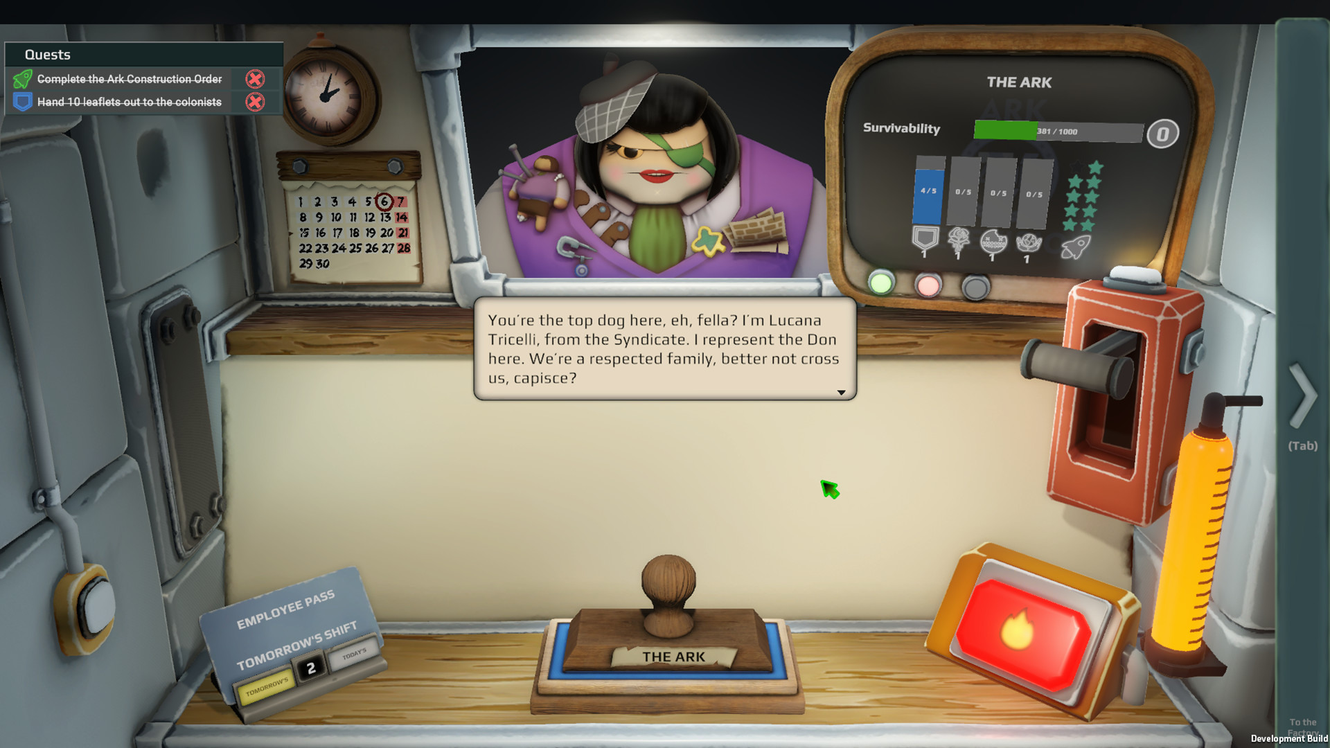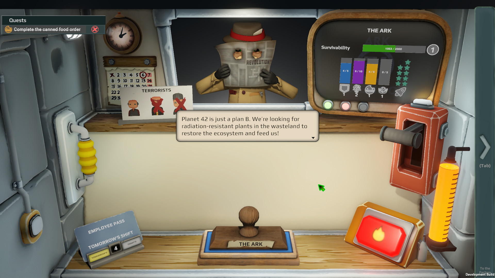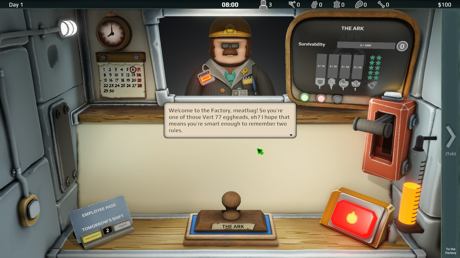 此外,管理工廠樓層、建造新設備、升級研究中心也是玩家的責任,務必確保在太空梭起飛之前,一切都準備完全。而玩家也需達到每周規定的業務量、持續取悅上級機關;想要活命,就要展現出自身的利用價值。