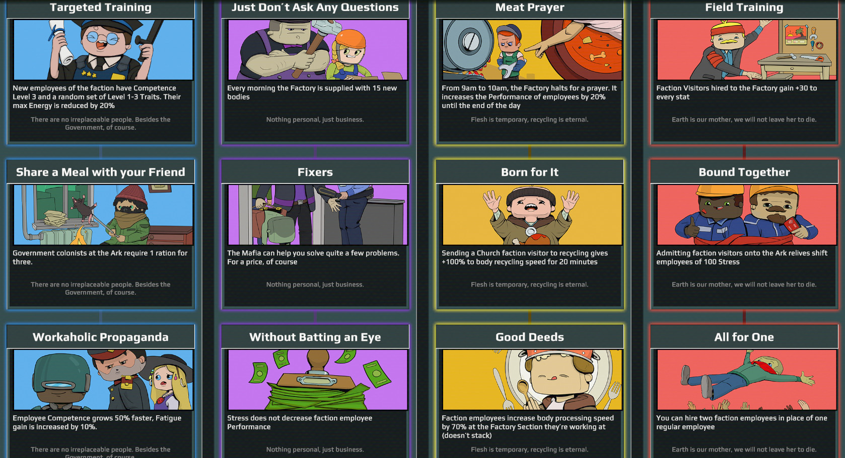 而玩家將於遊戲中決定哪些人可以坐上太空梭逃離地球,還有誰將為了全人類的福祉,犧牲他們的血汗及淚水,如變成罐頭食品、受雇成為人體回收工廠的員工等。官方透露,玩家可以雇用有著獨特僻好、恐懼及偏見的員工,並能讓勤奮工作的員工升職、用舒適的工作環境豢養他們;而至於那些懶散的員工,就可以把他們送去工廠裡最黑暗的特別房間,做成人肉罐頭⋯⋯?