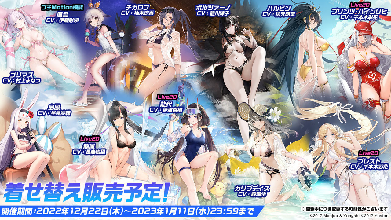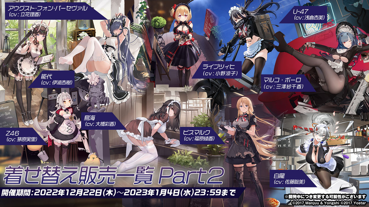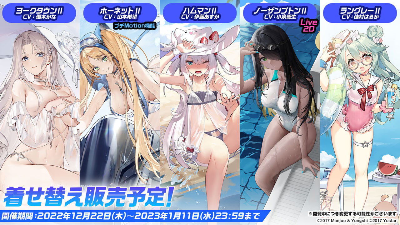 隨著活動情報發布,全新換裝也一併正式公開。本次登場的包含普林斯頓(プリンストン)、貝利(ベイリー)、約克鎮 II(ヨークタウンII)、大黃蜂 II(ホーネットII)、哈曼 II(ハムマンII)、北安普敦II(ノーザンプトンII)、蘭利 II(ラングレーII)、布雷斯特(ブレスト)、普利茅斯(プリマス)、契卡洛夫(チカロフ)、哈爾濱(ハルビン)、海因里希親王(プリンツ・ハインリヒ)、島風、卡律布狄斯(カリブディス)、博爾札諾(ボルツァーノ)、風雲、龍鳳以及能代共 18 名角色,其中普林斯頓、貝利是在日本時間 2022 年 12 月 22 日至 2023 年 1 月 4 日 23:59 發售,其餘角色的換裝則是在 2022 年 12 月 22 日至 2023 年 1 月 11 日 23:59 發售。