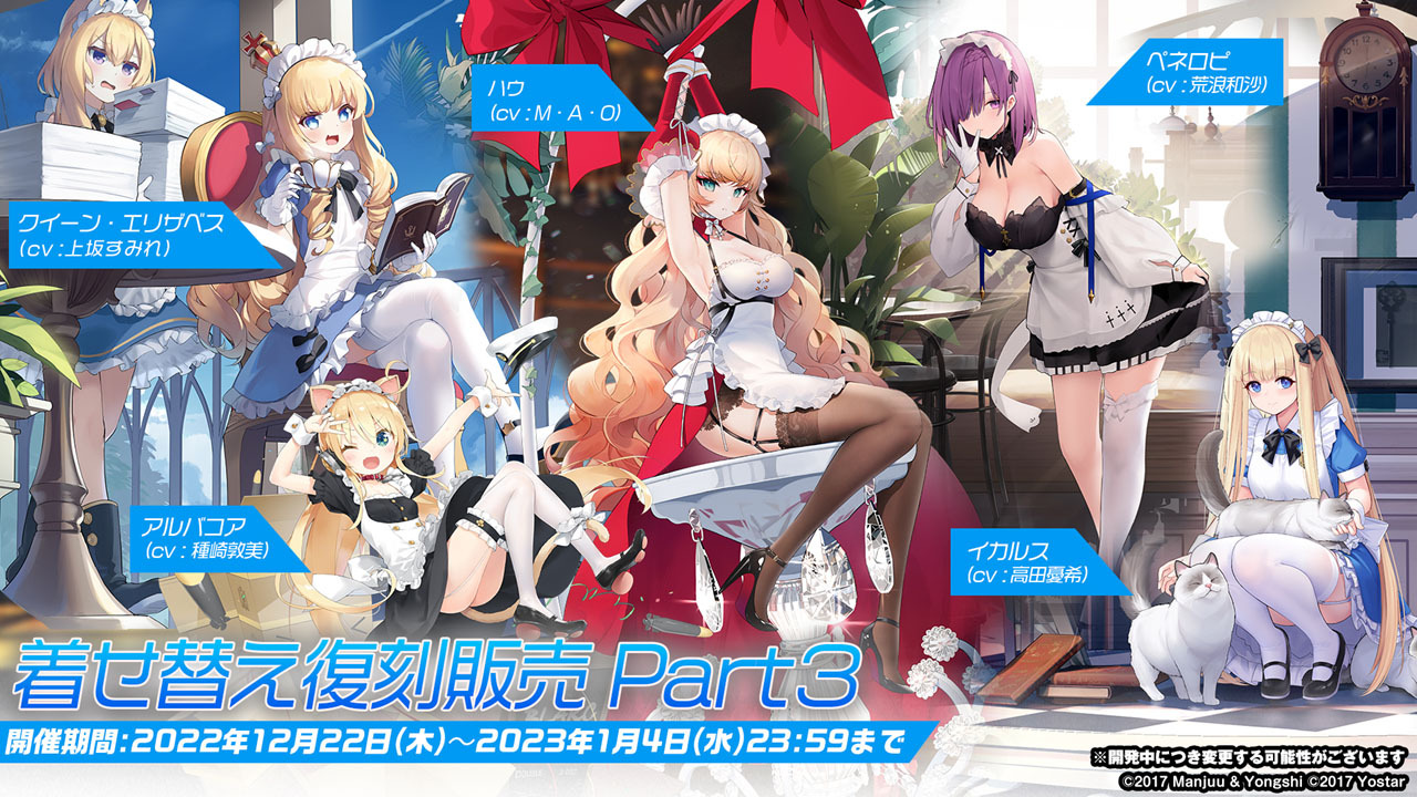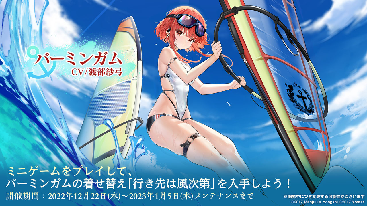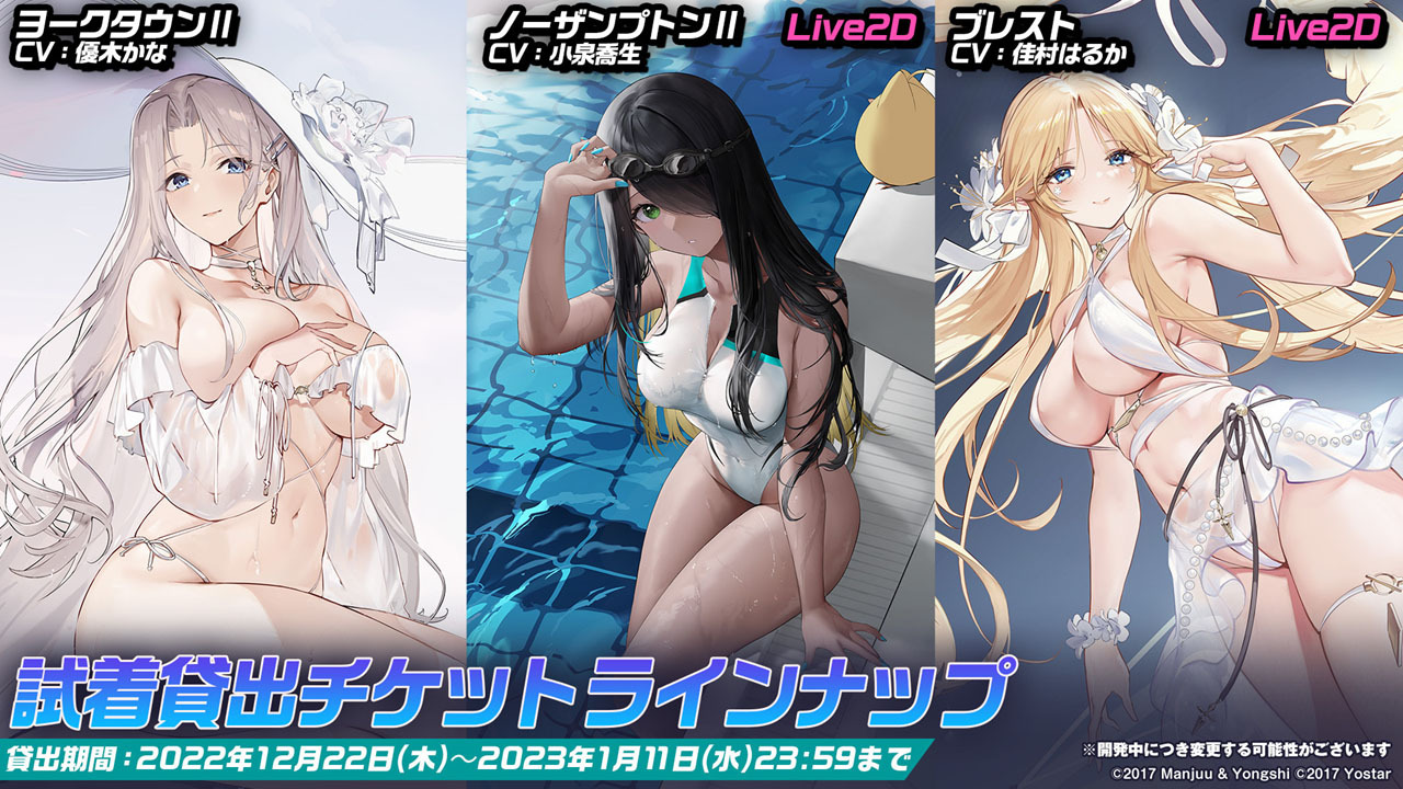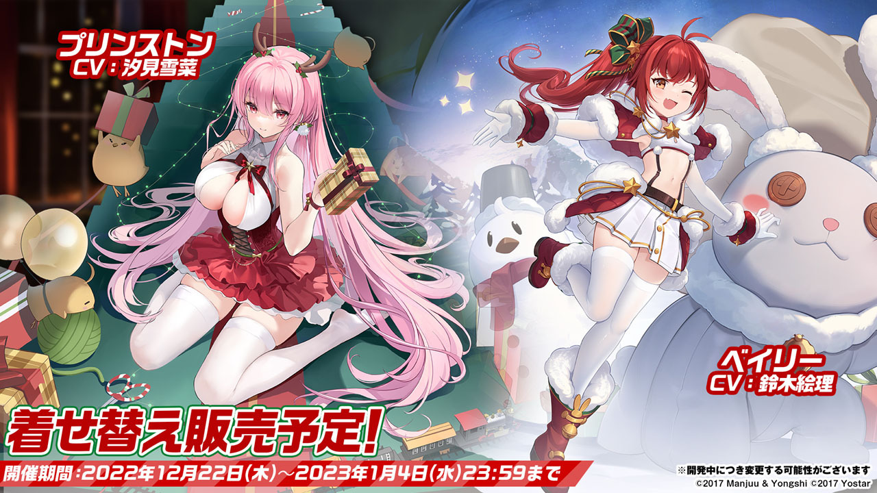 隨著活動情報發布,全新換裝也一併正式公開。本次登場的包含普林斯頓(プリンストン)、貝利(ベイリー)、約克鎮 II(ヨークタウンII)、大黃蜂 II(ホーネットII)、哈曼 II(ハムマンII)、北安普敦II(ノーザンプトンII)、蘭利 II(ラングレーII)、布雷斯特(ブレスト)、普利茅斯(プリマス)、契卡洛夫(チカロフ)、哈爾濱(ハルビン)、海因里希親王(プリンツ・ハインリヒ)、島風、卡律布狄斯(カリブディス)、博爾札諾(ボルツァーノ)、風雲、龍鳳以及能代共 18 名角色,其中普林斯頓、貝利是在日本時間 2022 年 12 月 22 日至 2023 年 1 月 4 日 23:59 發售,其餘角色的換裝則是在 2022 年 12 月 22 日至 2023 年 1 月 11 日 23:59 發售。