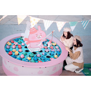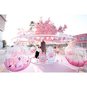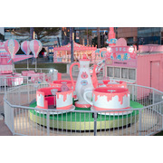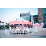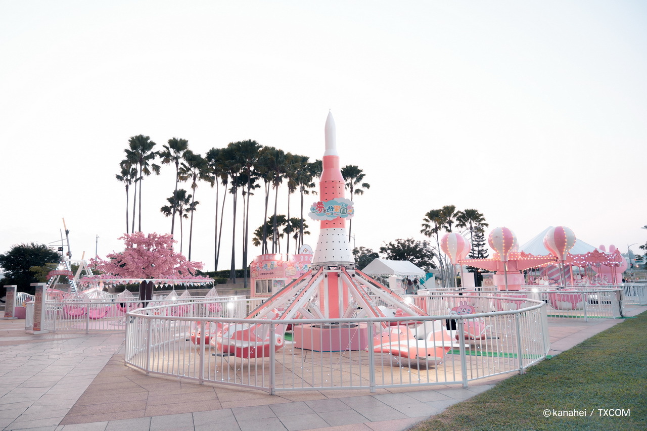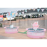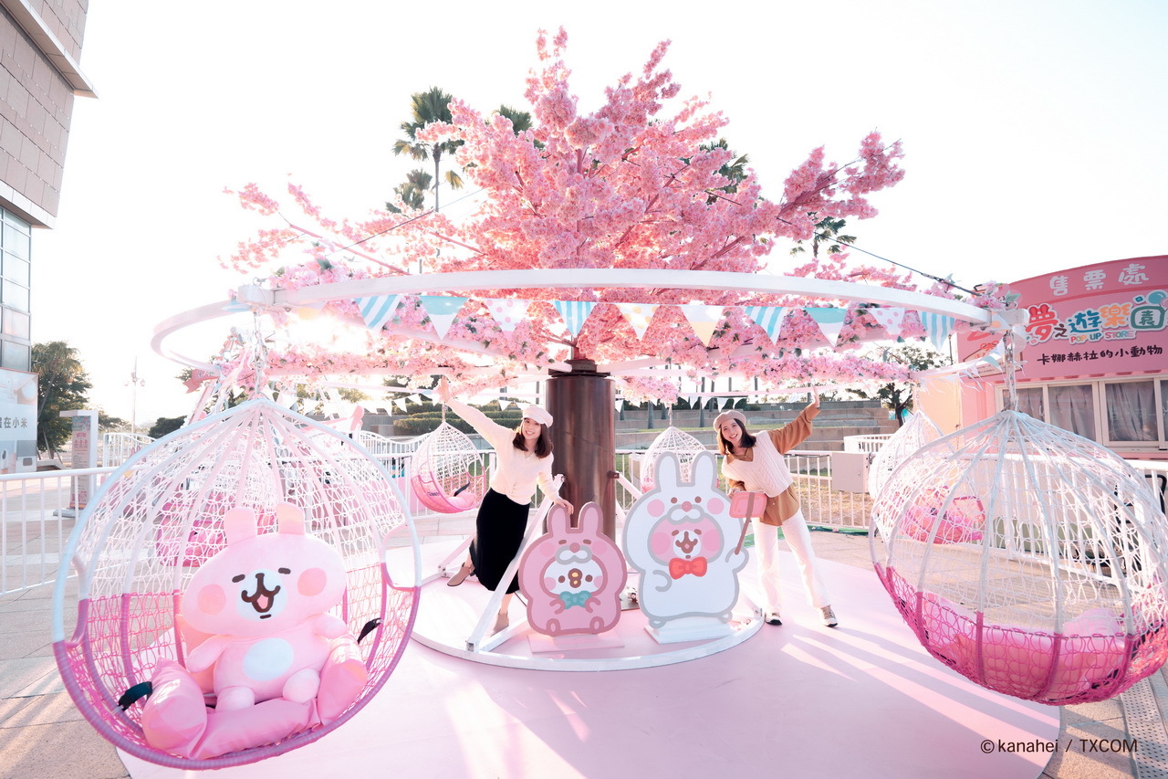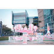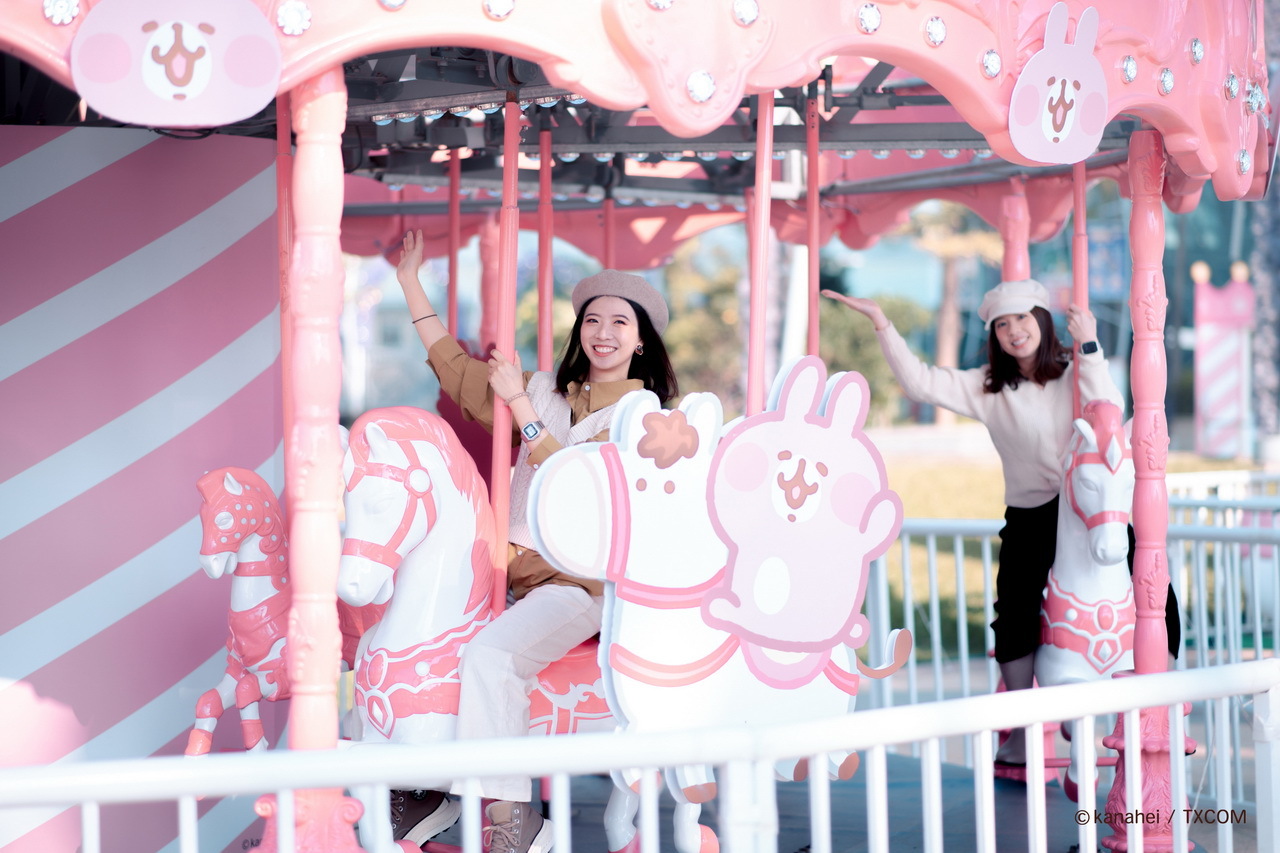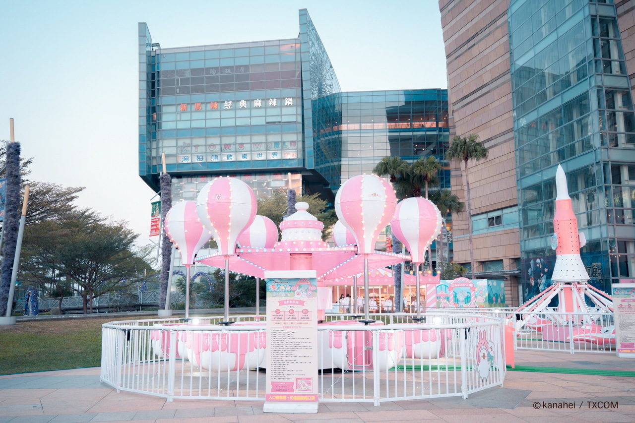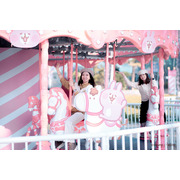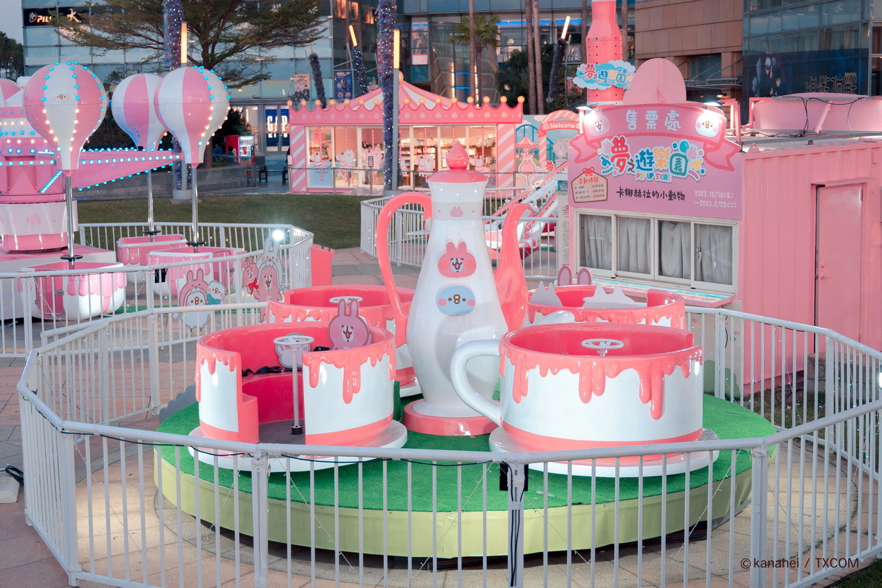「卡娜赫拉的小動物-夢之遊樂園」一進樂園就看見 3 米高巨型粉紅兔兔大氣球坐鎮在小火車中央,接著是隨著音樂上下起伏的旋轉木馬,還有粉紅兔兔造型咖啡壺的旋轉咖啡杯,以及像是釣魚機、盪鞦韆、海盜船、熱氣球還有小飛機等多項遊樂設施。