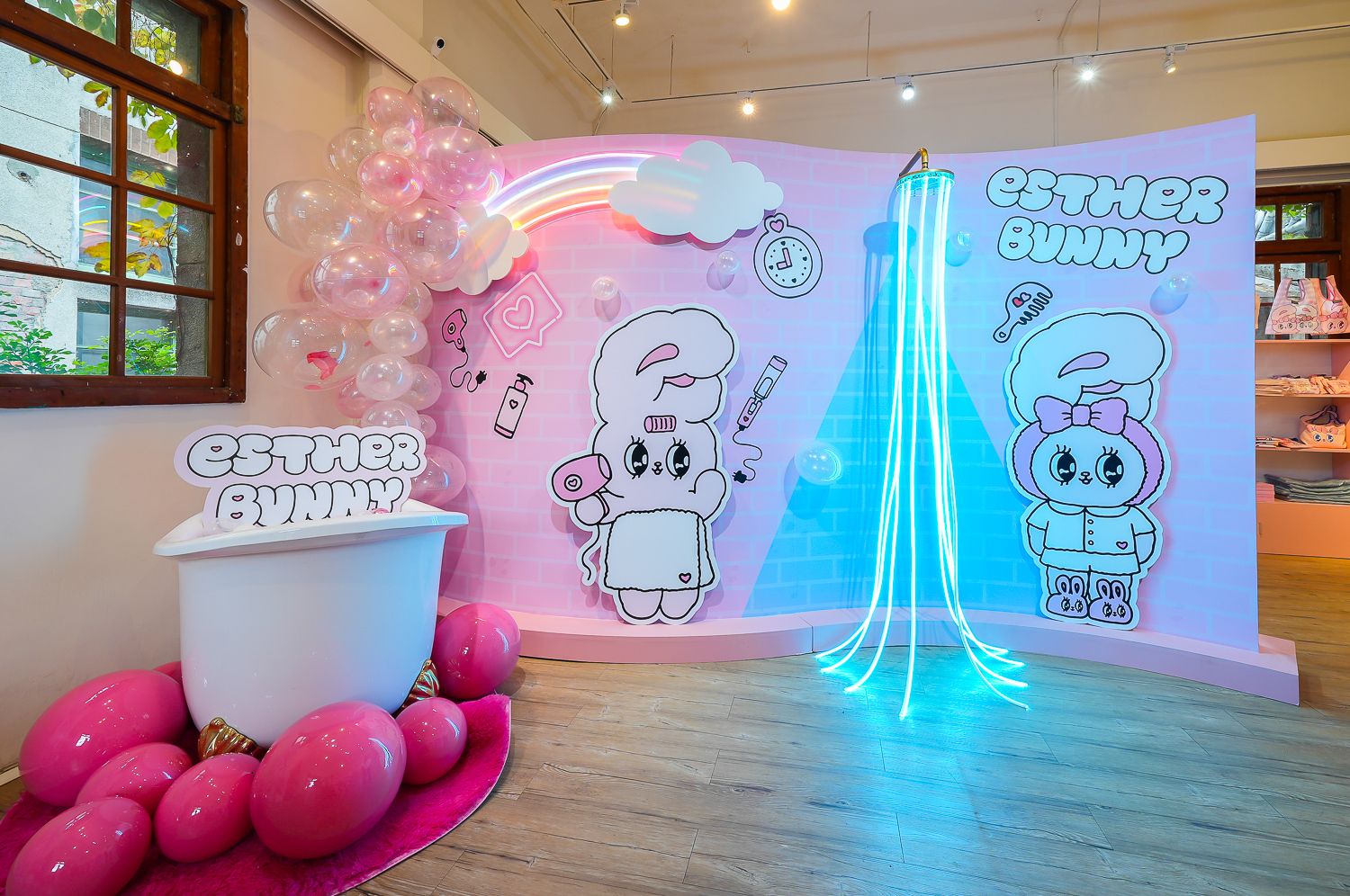 「Esther Bunny 艾絲樂小兔」台北華山期間限定店五大拍照打卡點搶先看!入口處就能看到「粉粉乘涼椅」及「1.8米高的巨型艾絲樂小兔」捧著愛心在門口迎接粉絲,場內重現經典插畫中的夢幻情境區,帶領大家進入到艾絲樂小兔「粉色夢幻房間」!接著來到她的淋浴間,「粉紅泡泡浴」及霓虹燈管製成的花灑,讓粉絲置身在粉色泡泡之中!最後門外的拍照點也千萬不能錯過,艾絲樂小兔穿著花花洋裝推著「Pink 粉粉購物車」,嘟嘴逛街的模樣絕對殺光粉絲底片!