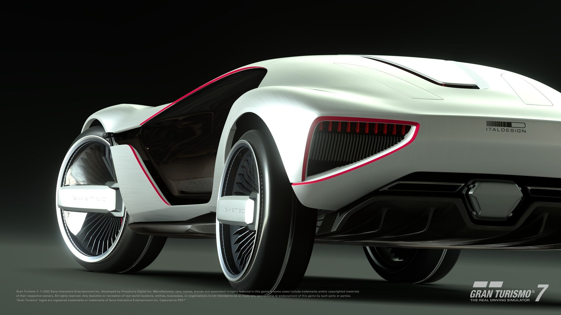 回到未來》三部曲中登場的 De Lorean DMC 12,或是羅傑・摩爾在《007:海底城》裡駕駛的 Lotus Esprit。Italdesign EXENEO Vision Gran Turismo 延續 Gran Turismo 汽車的悠久義大利傳統,同時採用尖端技術進行更新。在設計上受 2013 年款全地形、中置後驅引擎小型 GT Italdesign Parcour 的啟發,這款概念車採用四種不同的底盤設置(賽道、雪地、越野和城市),飆速越野兩相宜。超強 V10 中置引擎搭載兩顆 200 kW(268.2 BHP)電動馬達,確保總輸出動力達 910 kW(1,219.9 BHP),讓 EXENEO VGT 最高跑速可達 236.1 mph,2.5 秒內即可從 0 加速到 62.1 mph。7 段變速箱、單輪驅動(IWD)以及動能恢復系統(KERS)完善了整套動力傳動系統。為確保最大穩定性,智慧型懸吊會自動調整適應不同類型的地形。