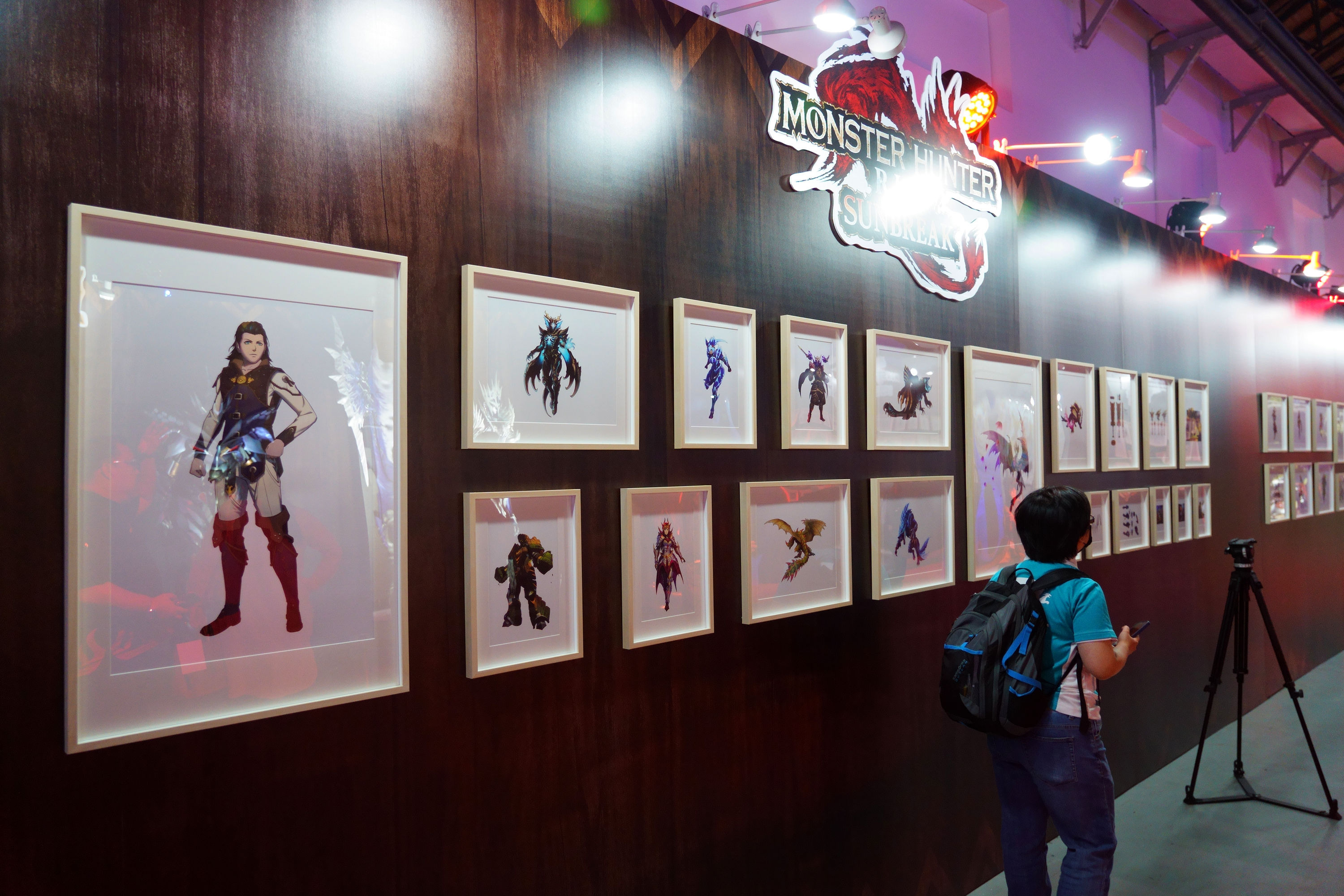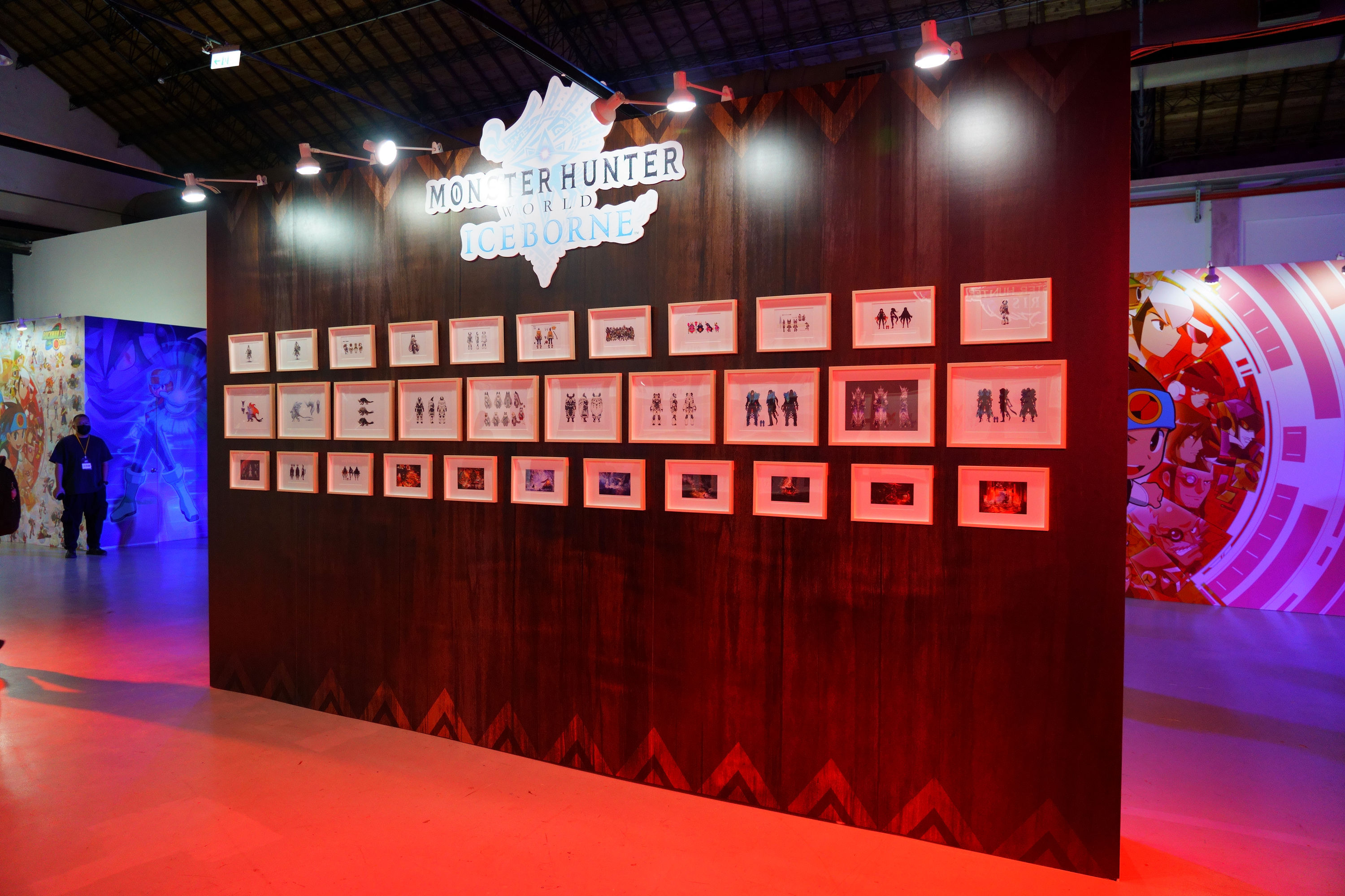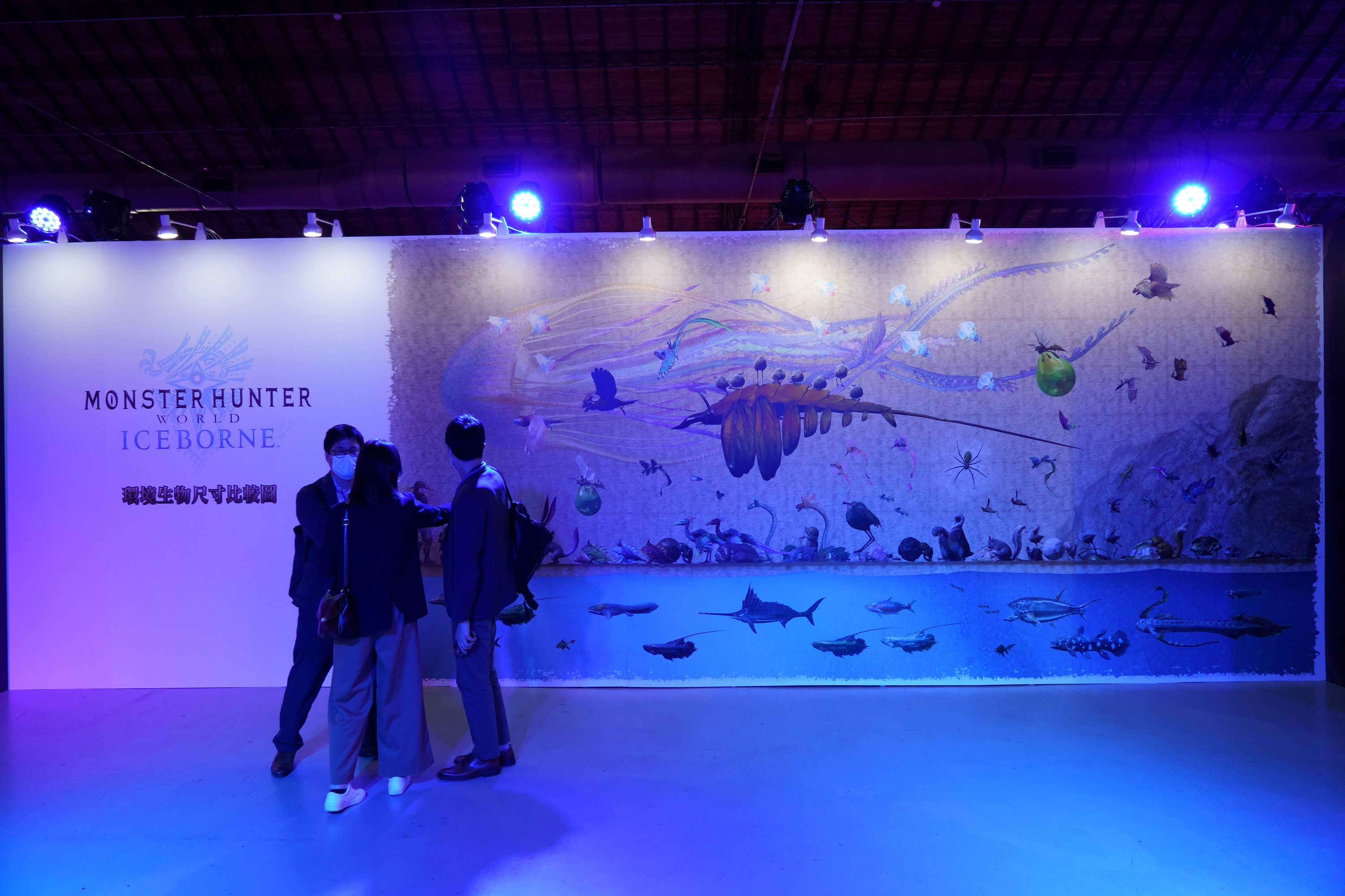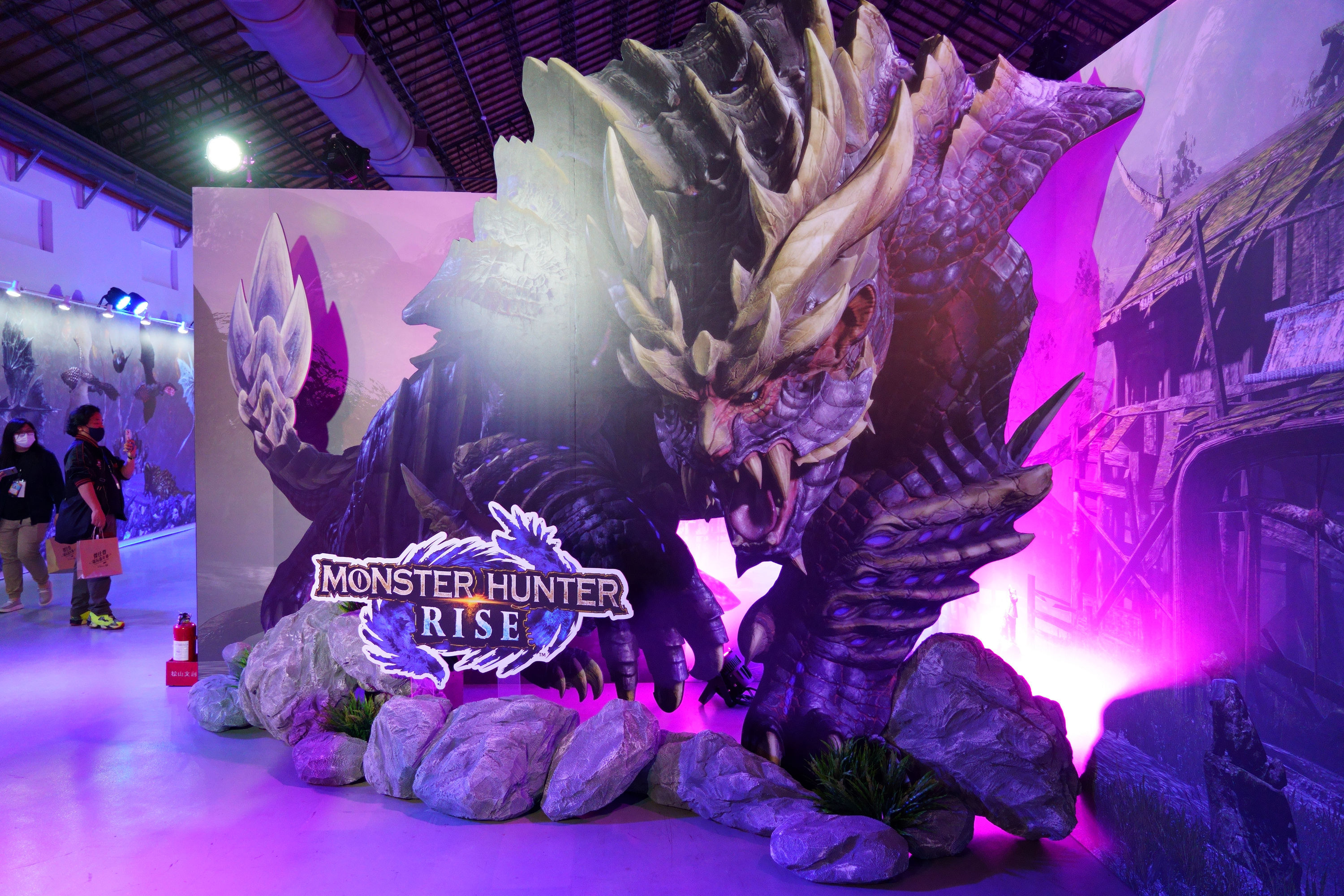 魔物獵人 》的展區內容,請大家見諒(笑)。由於這次是睽違多年再度舉辦的實體活動,所以準備了很多可以拍照打卡的景點,包括等身大的魔物看板,呈現魔物身形比例的展示牆,特地從日本空運來台、包含 5 組盔甲與 2 組武器的 1:1 等身大獵人裝備,以《崛起》為藍本設計的實體集會所還有經典的烤肉場景等。