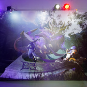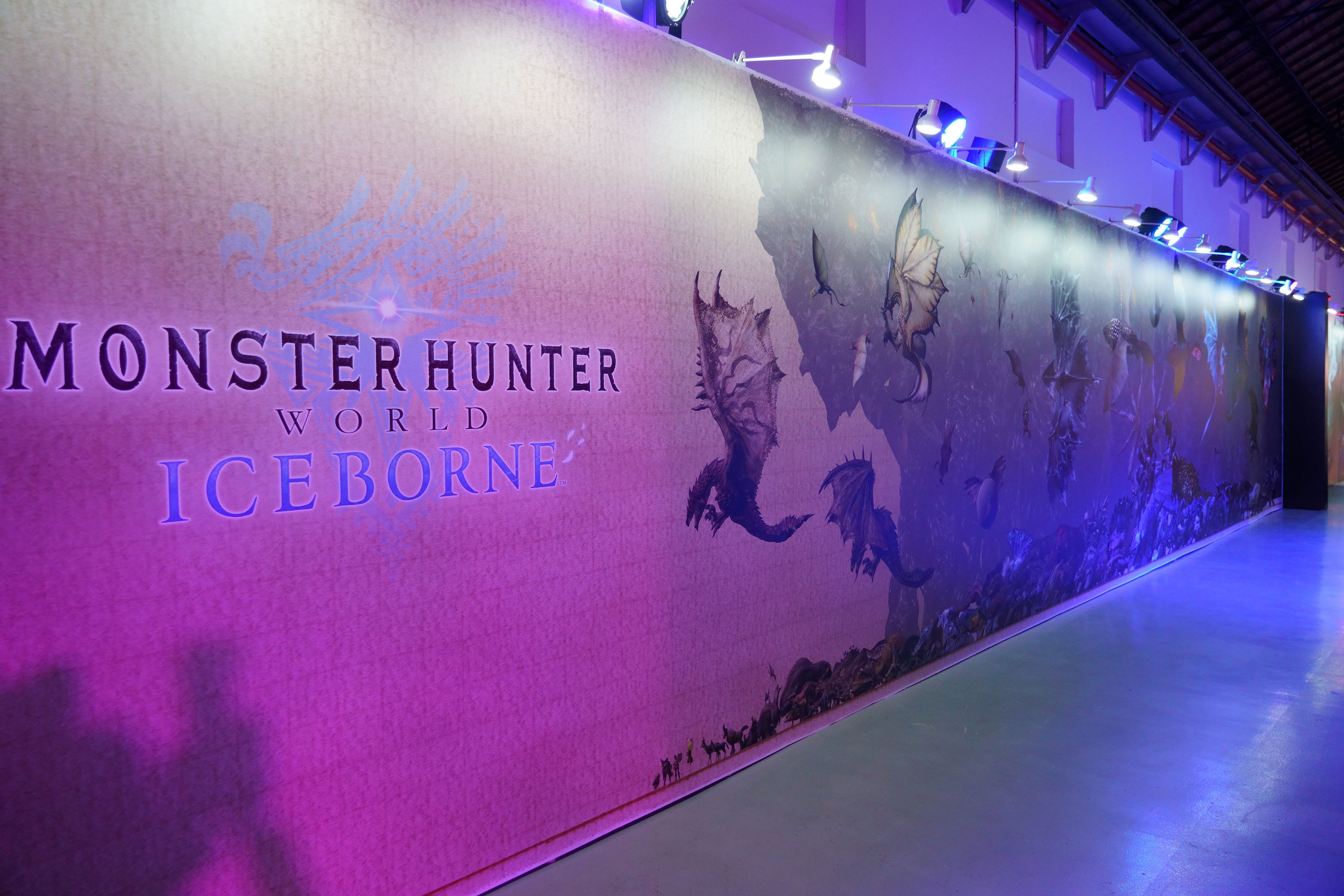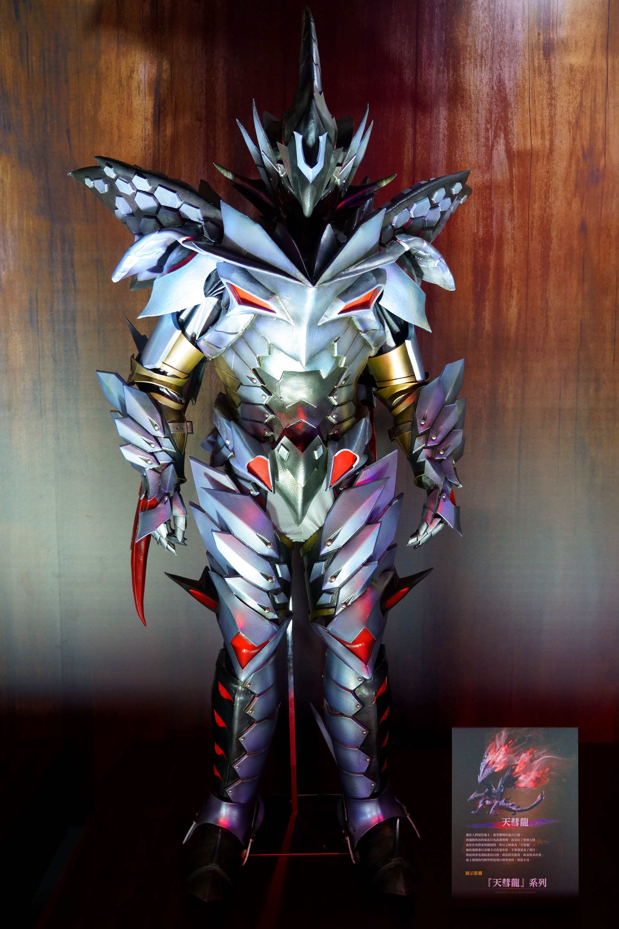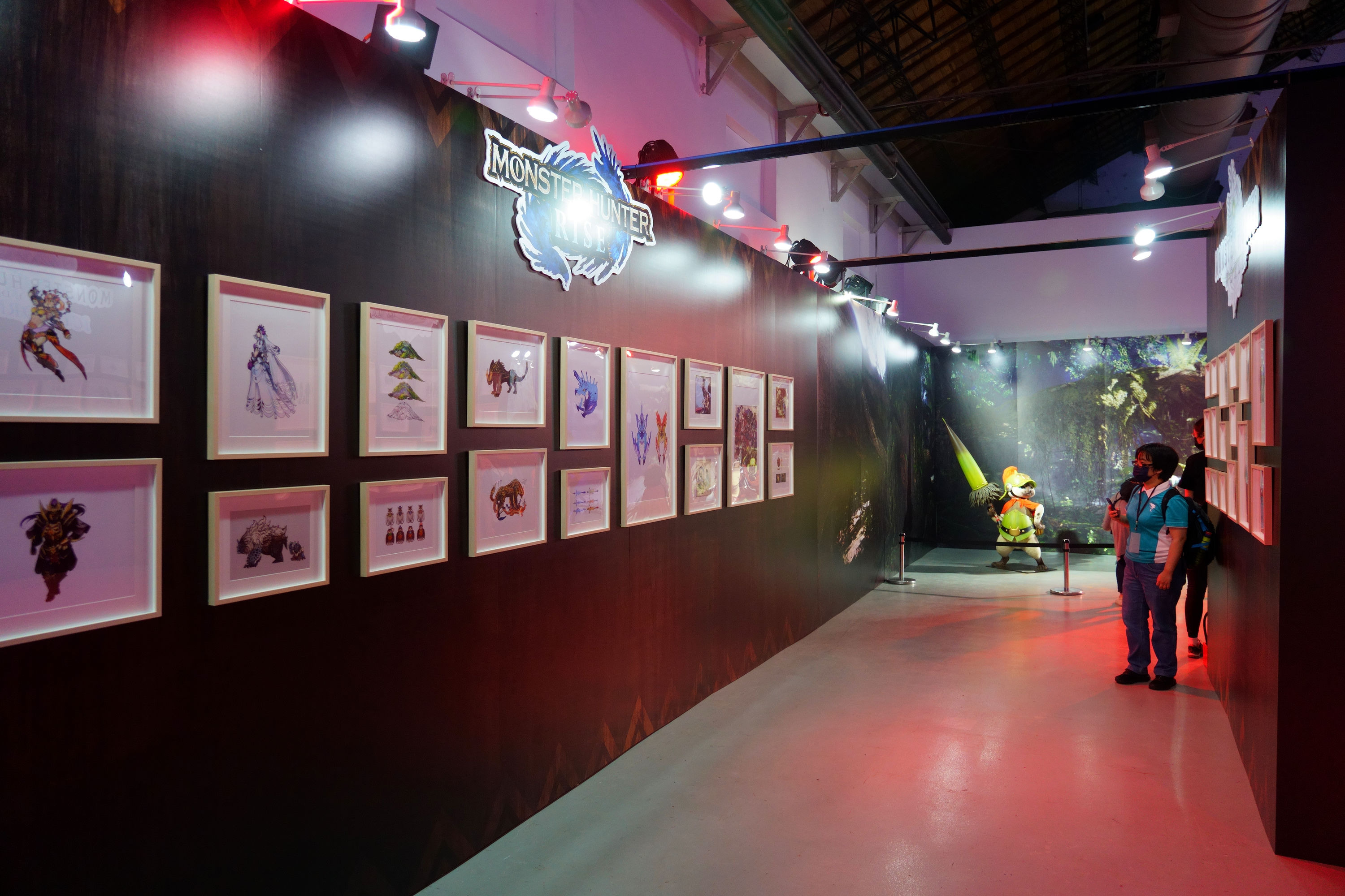 魔物獵人 》的展區內容,請大家見諒(笑)。由於這次是睽違多年再度舉辦的實體活動,所以準備了很多可以拍照打卡的景點,包括等身大的魔物看板,呈現魔物身形比例的展示牆,特地從日本空運來台、包含 5 組盔甲與 2 組武器的 1:1 等身大獵人裝備,以《崛起》為藍本設計的實體集會所還有經典的烤肉場景等。