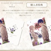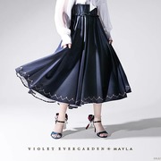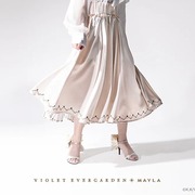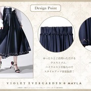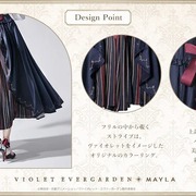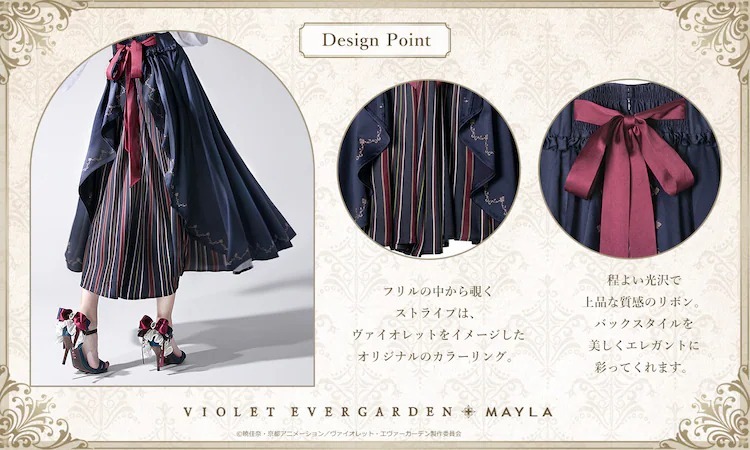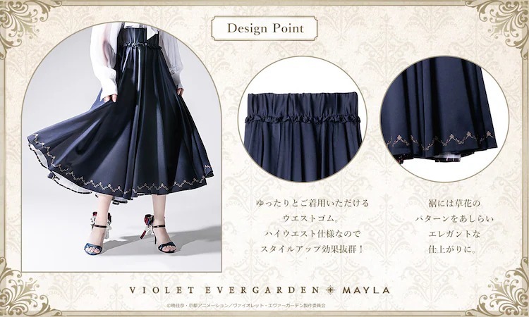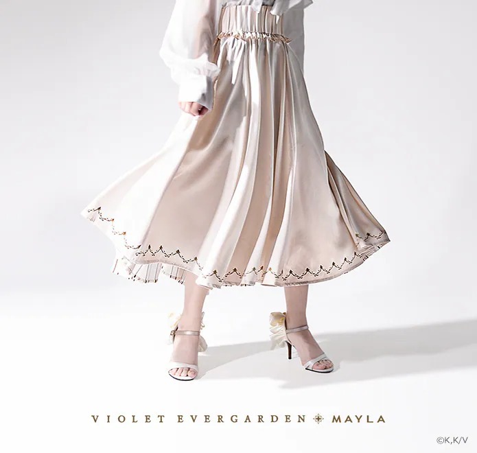 紫羅蘭永恆花園》與 MAYLA 曾多次合作推出聯名服飾以及服飾周邊,這次藉由雙方的再度合作,以主角薇爾莉特為概念,推出了兩款圓裙「Akora」以及「Segen」。兩款裙子分別是以海軍藍以及象牙白作為基礎色調。設計上藉由背面的摺邊以及內側的條紋布料作為設計特點,讓人聯想到女主角薇爾莉特走在路上而裙襬隨著微風飄揚的畫面。