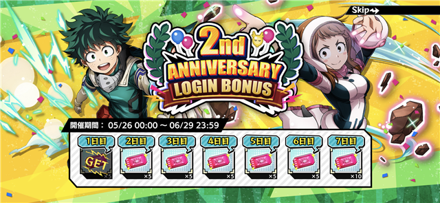 作為紀念活動的一部分,即日起包含 UR「出久綠谷」和「麗日御茶子」兩名角色將以慶祝典禮之造型登場,舉辦「衝擊慶典 Pick 轉蛋~綠谷出久&麗日御茶子~(インパクトフェス 祝典ピックアップガシャ~綠谷出久&麗日お茶子~)」轉蛋活動,此外也一併推出了最多可免費獲得 100 次特殊轉蛋券的 2 週年紀念活動。