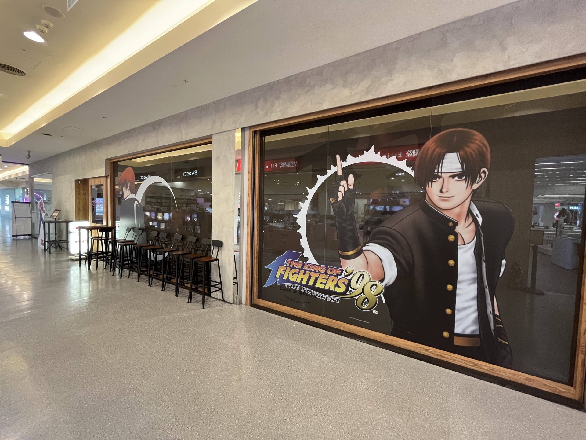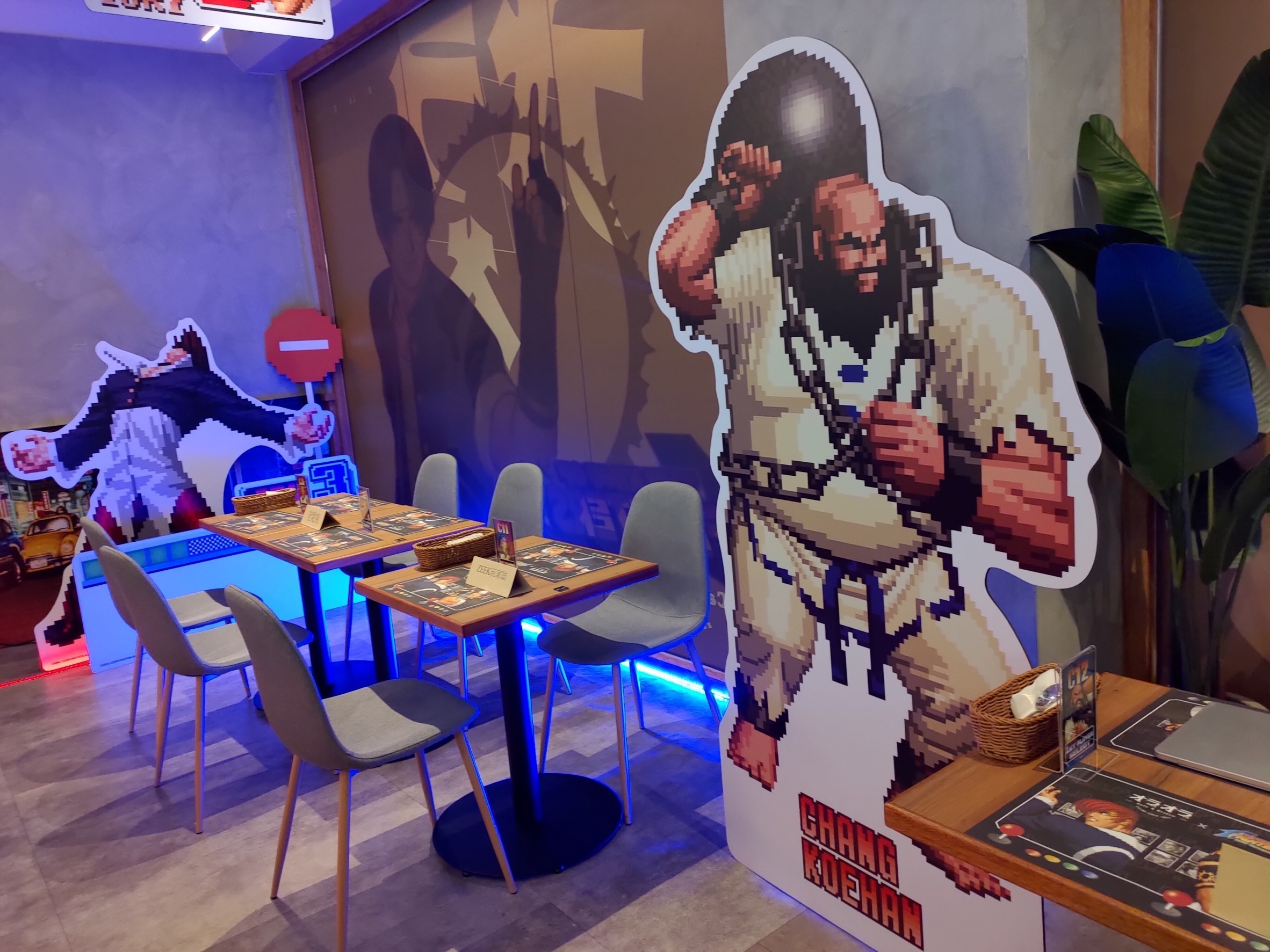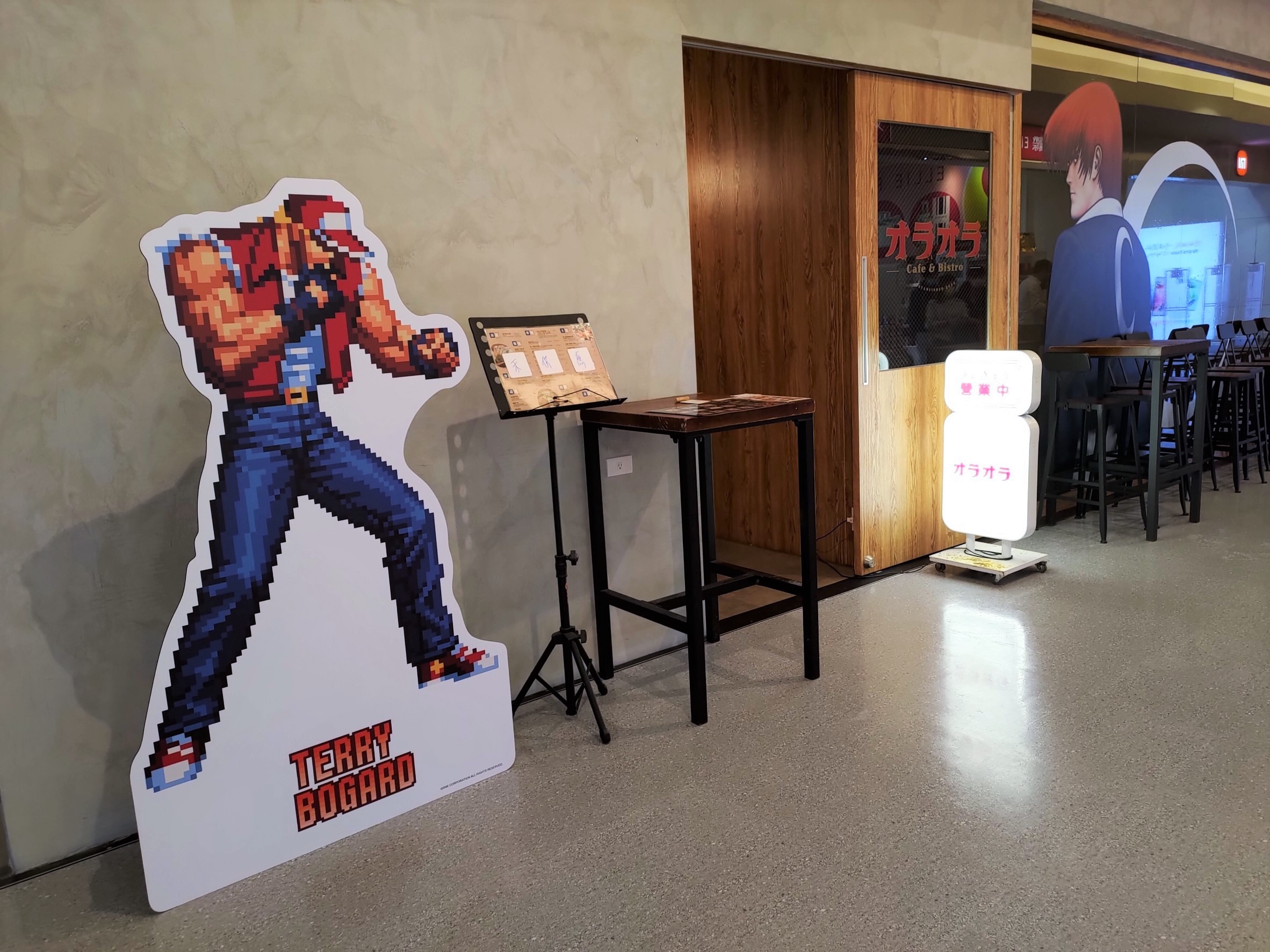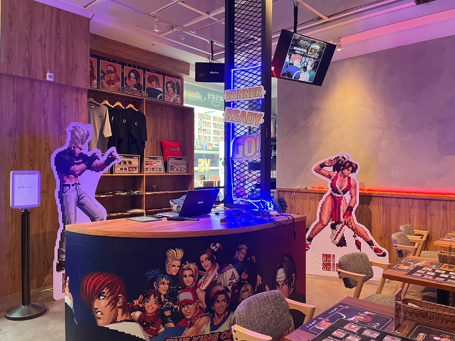 遊戲機台旁有草薙京坐鎮,往內走還有雅典娜、不知火舞、二階堂紅丸等角色人形立牌供來場玩家拍照打卡。在餐酒館的深處,更藏著巨大的遊戲畫面場景,不但可以化身遊戲內的角色與場景合影,還有月之夜大蛇之血狂瘋庵跟覺醒莉安娜的立牌坐鎮。
