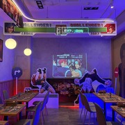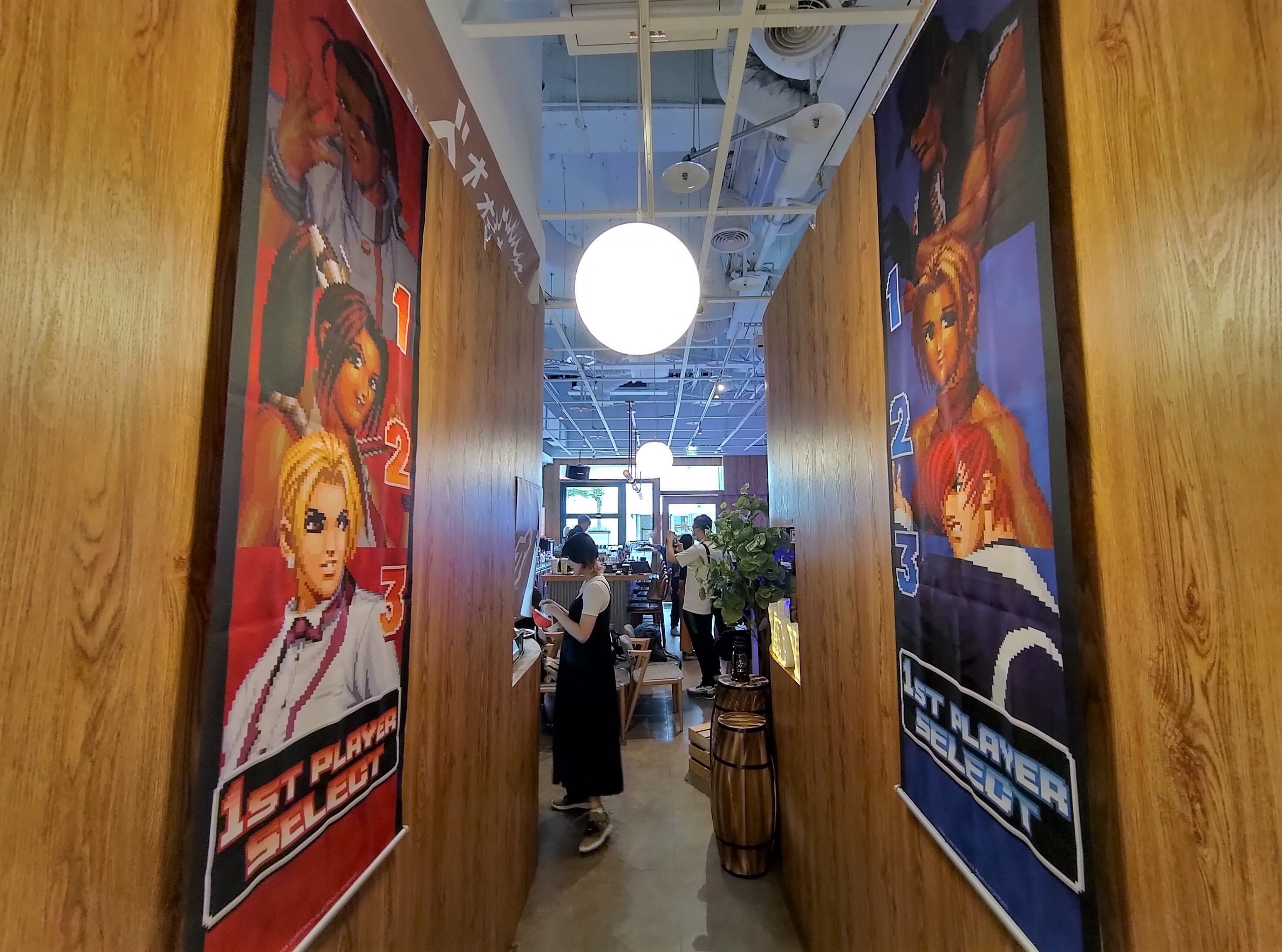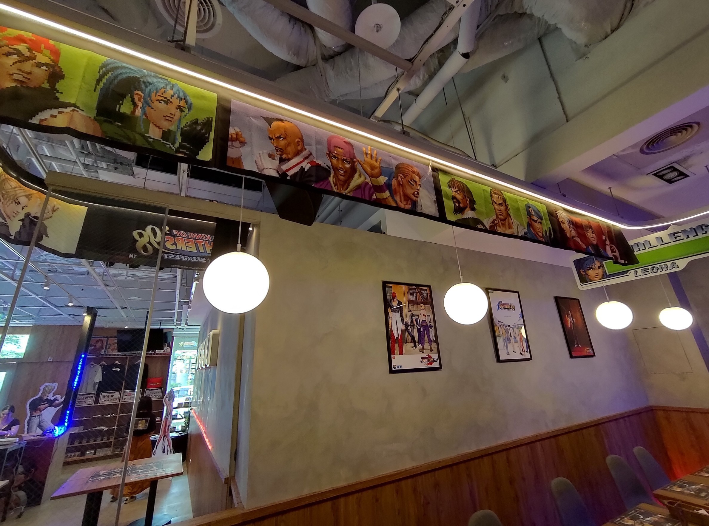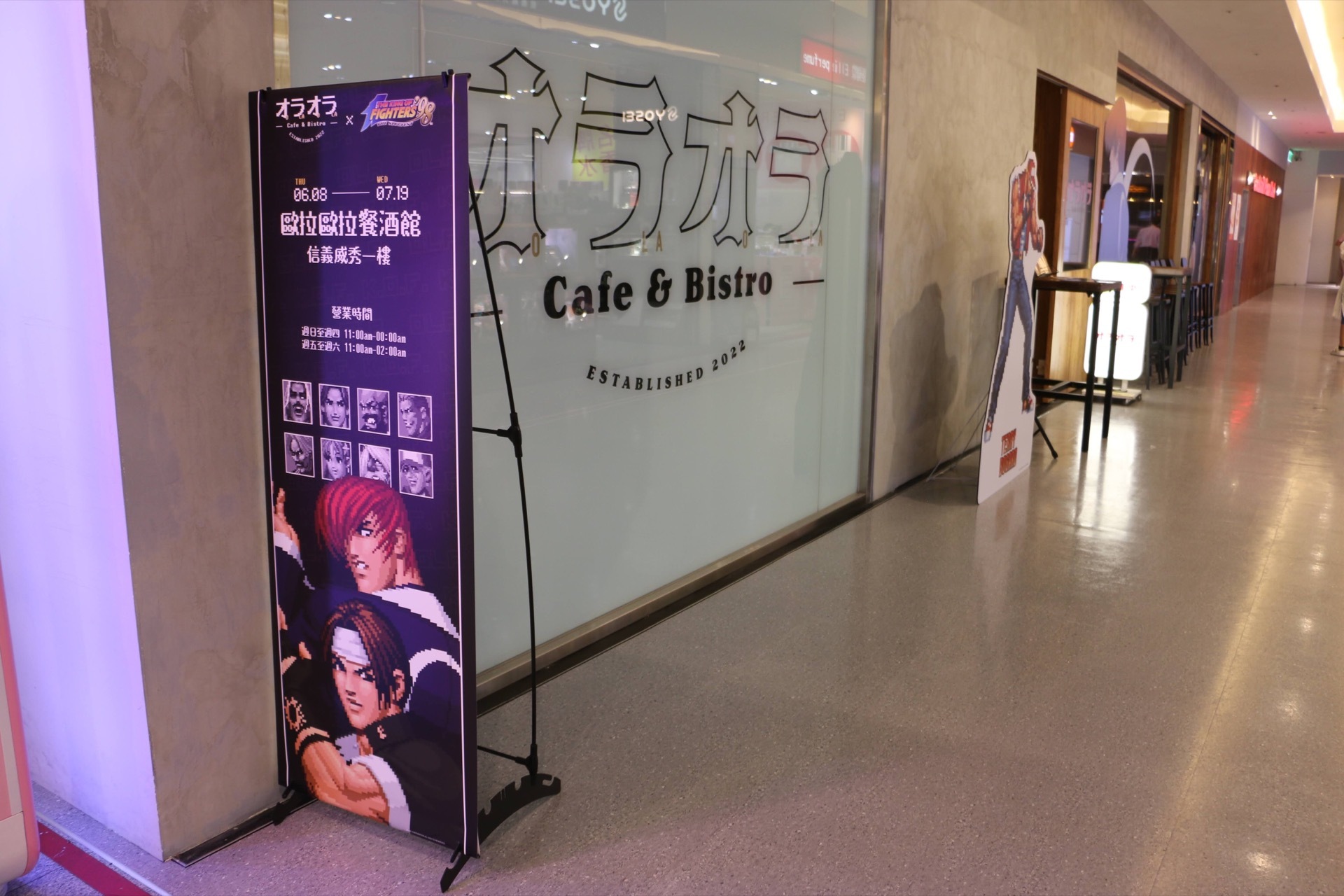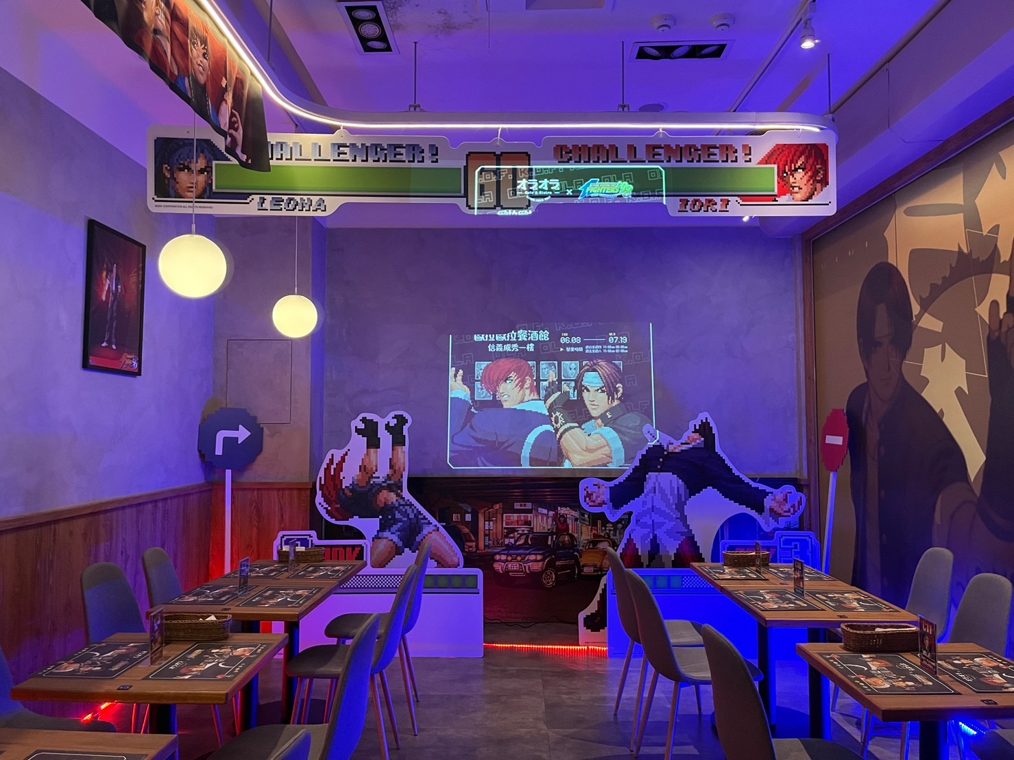 遊戲機台旁有草薙京坐鎮,往內走還有雅典娜、不知火舞、二階堂紅丸等角色人形立牌供來場玩家拍照打卡。在餐酒館的深處,更藏著巨大的遊戲畫面場景,不但可以化身遊戲內的角色與場景合影,還有月之夜大蛇之血狂瘋庵跟覺醒莉安娜的立牌坐鎮。