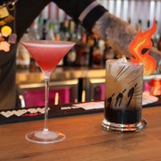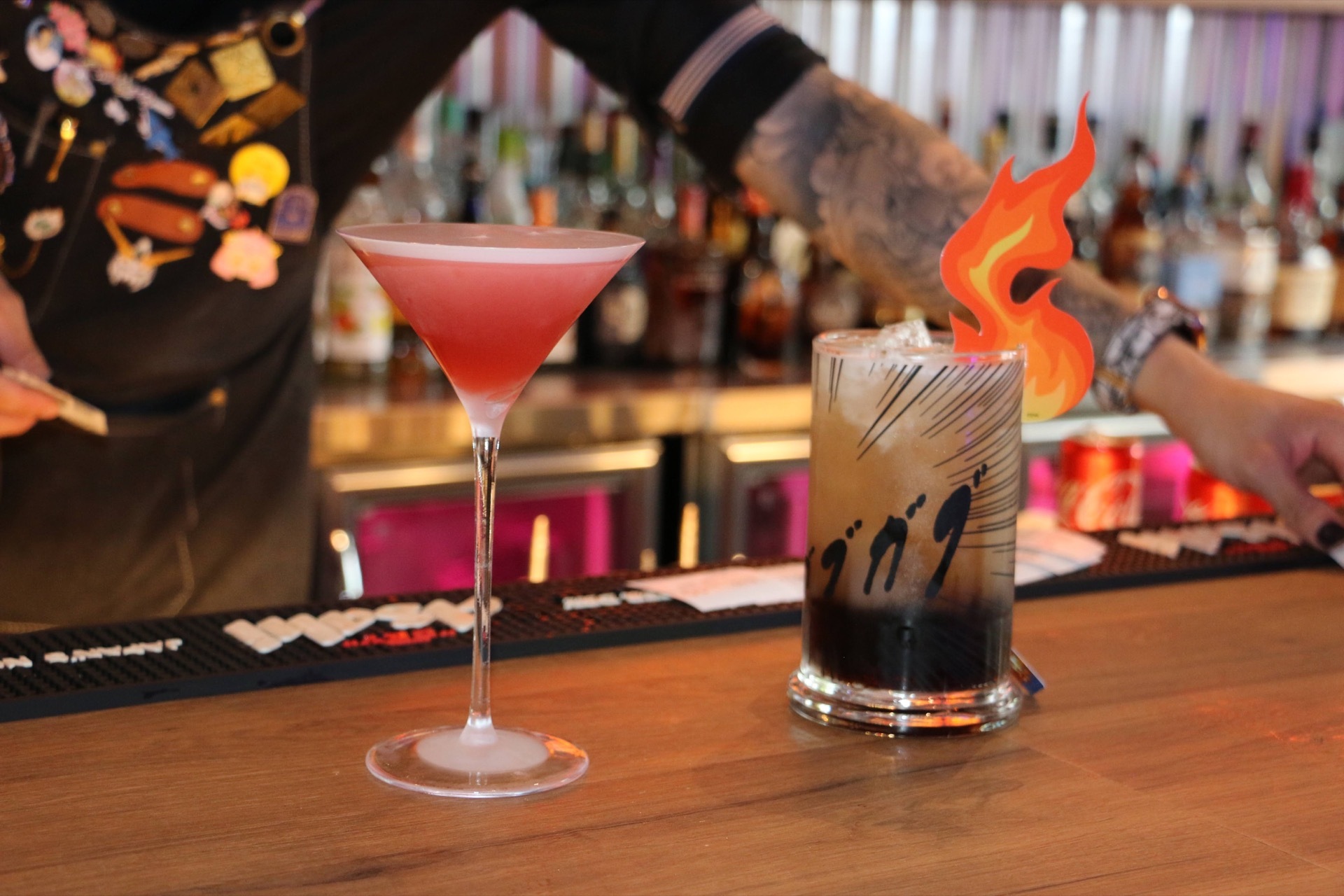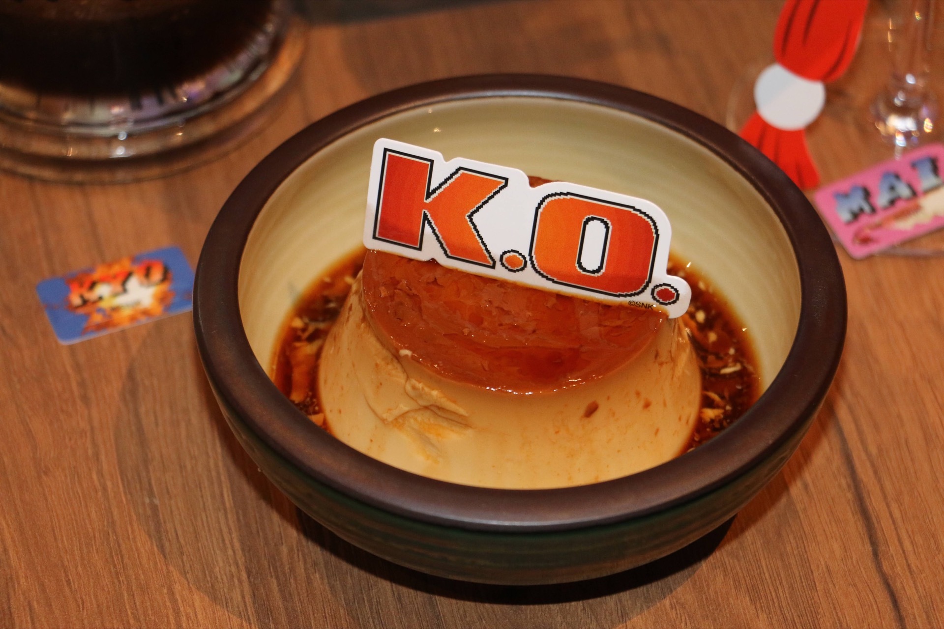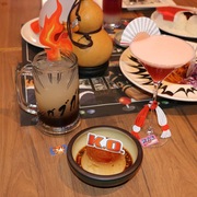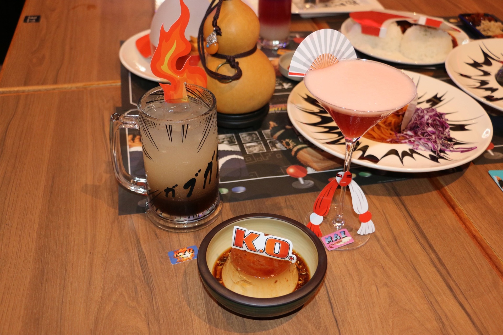 甜點的部分,則有著整排紫色泡泡糖點綴的「麻宮雅典娜 藍莓起士蛋糕」以及「K.O. 日式布丁」。特調部分則是包含以苦橙、木梨為基底加上蔓越莓充滿少女感的「不知火舞」,有著招牌酒葫蘆以威士忌及紹興酒為基底和鳳梨、梅酒調合的「鎮元齋的葫蘆美酒」,還有以蘭姆酒為基底,加上蔓越莓可爾必思的「裏百八式・八酒杯」,點火的橙皮十分適合拍照打卡。最後是伏特加為基底加上可樂、荔枝、白葡萄蘆薈和附加火焰插卡效果的「猛炎的傳承者」,此款也有提供無酒精版本,不喝酒的玩家們也可以前來體驗。