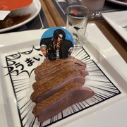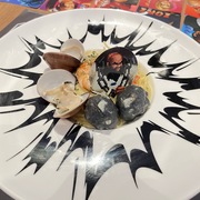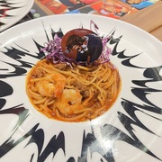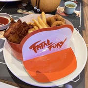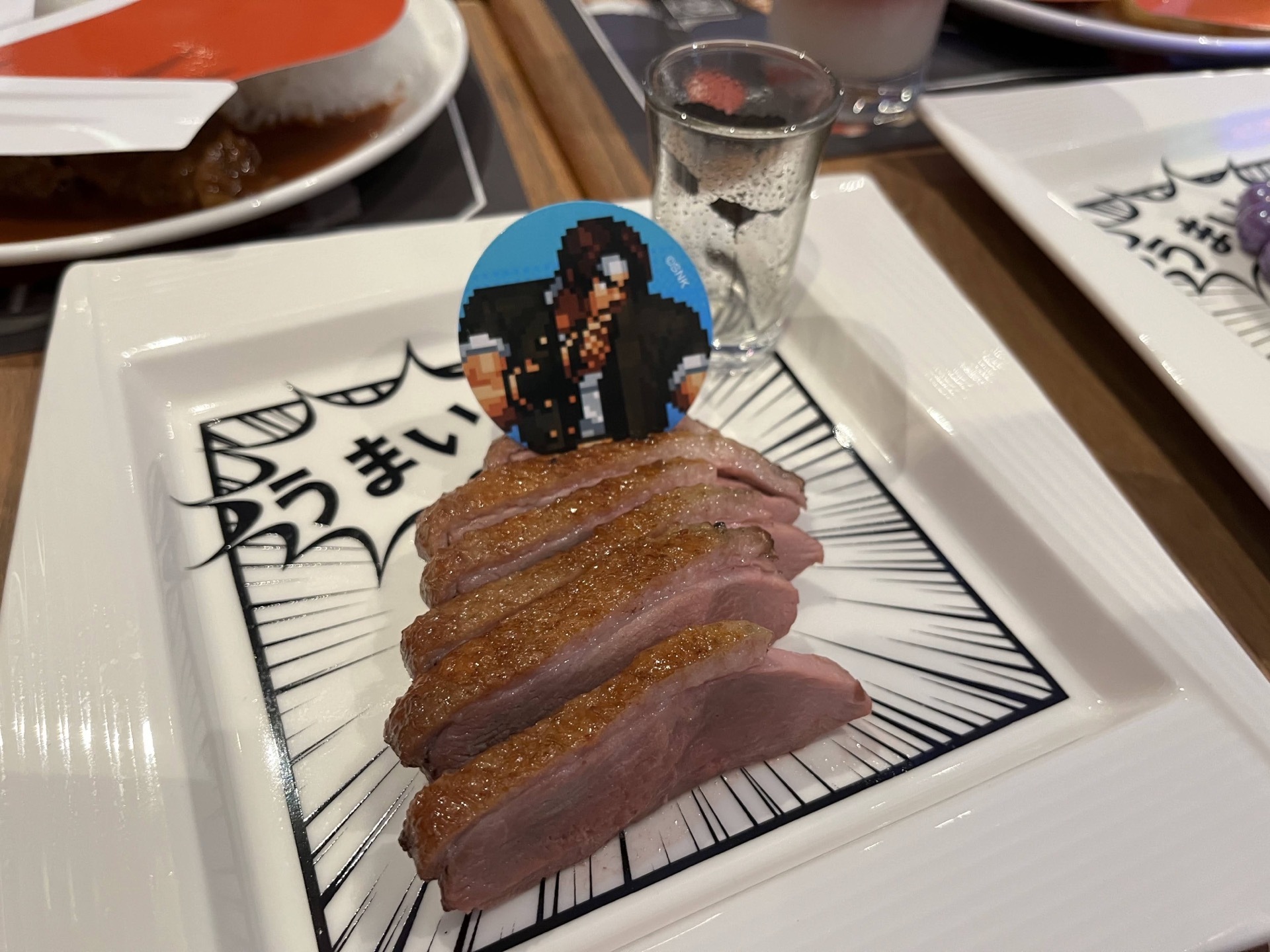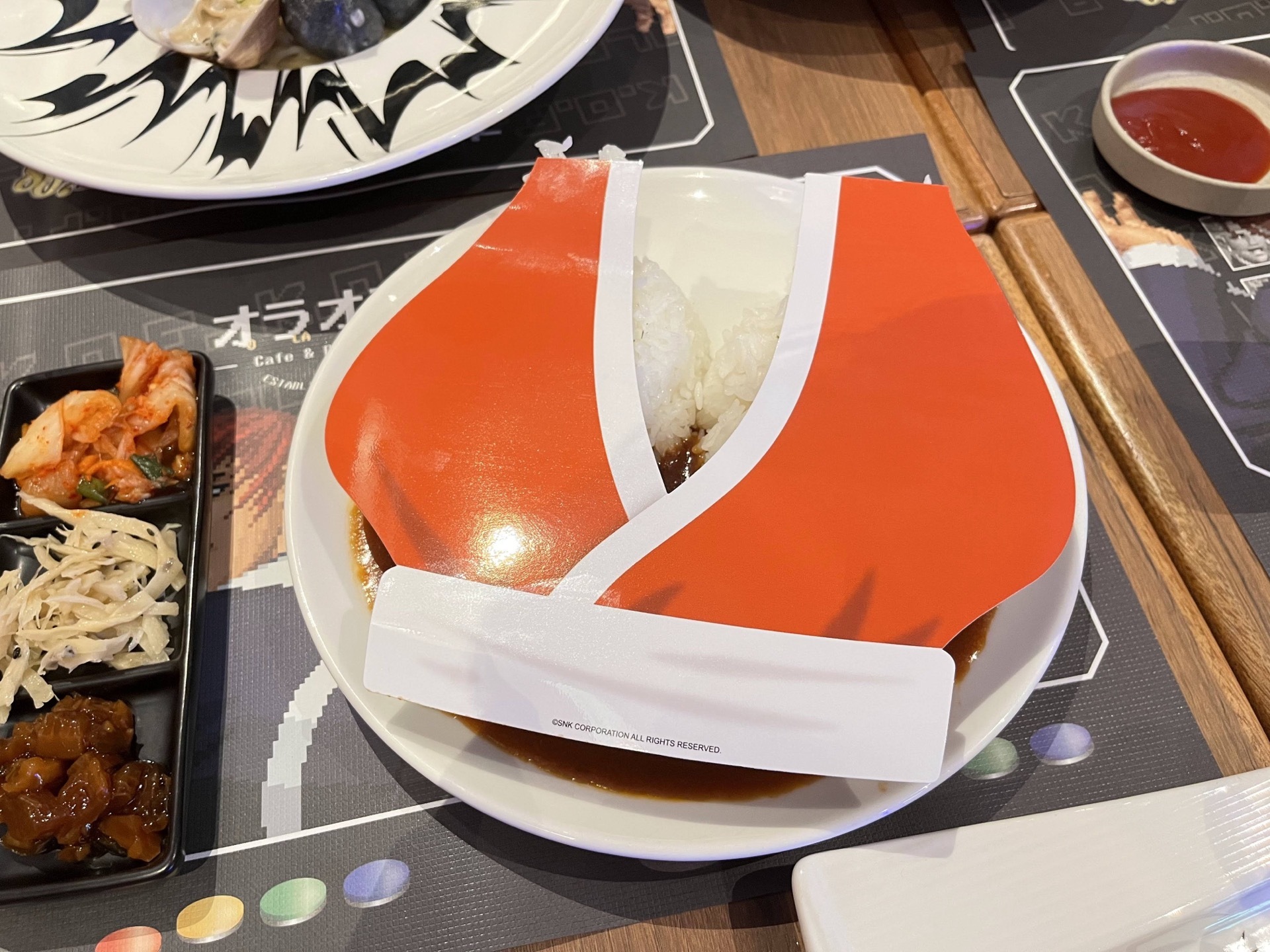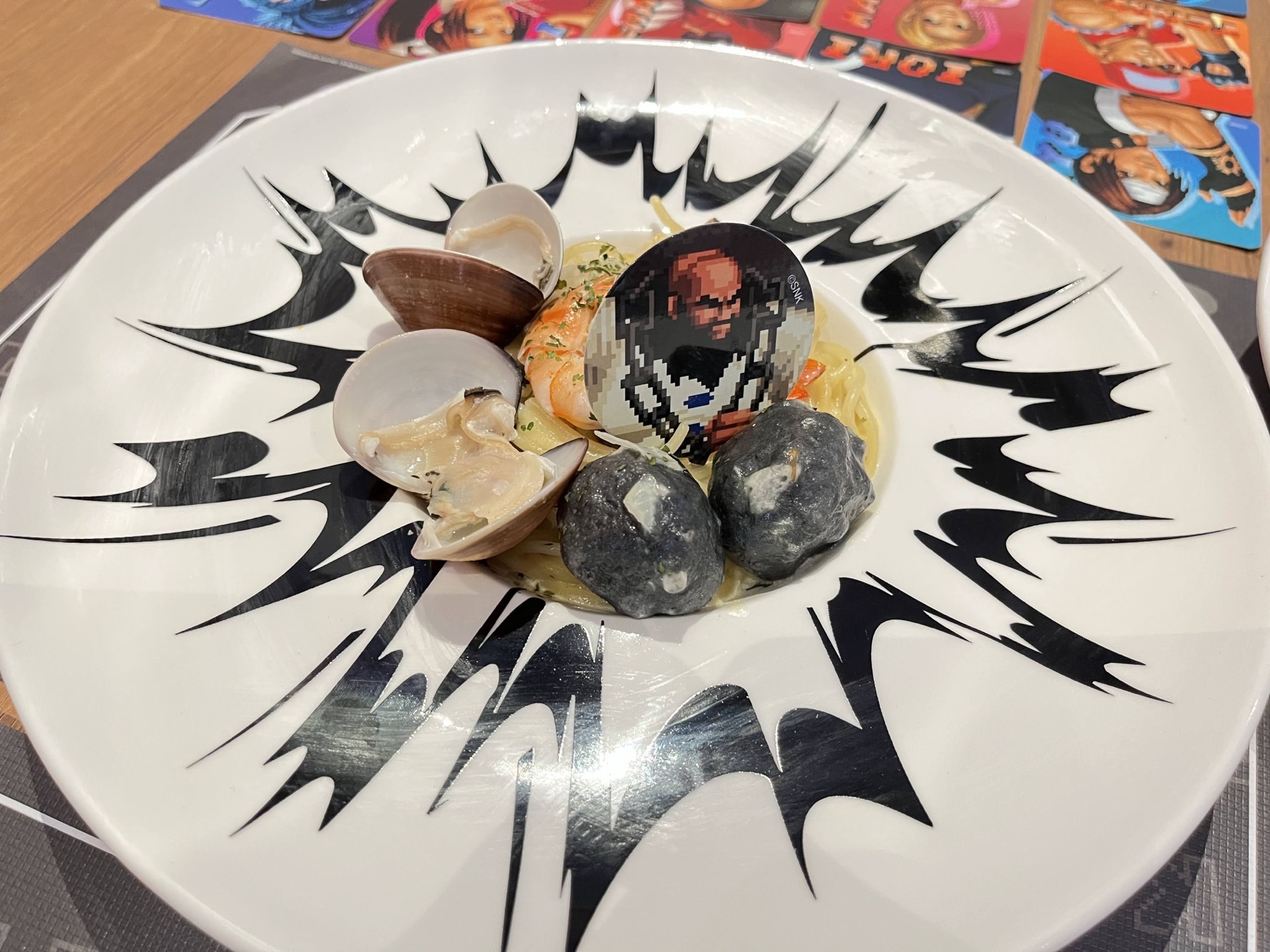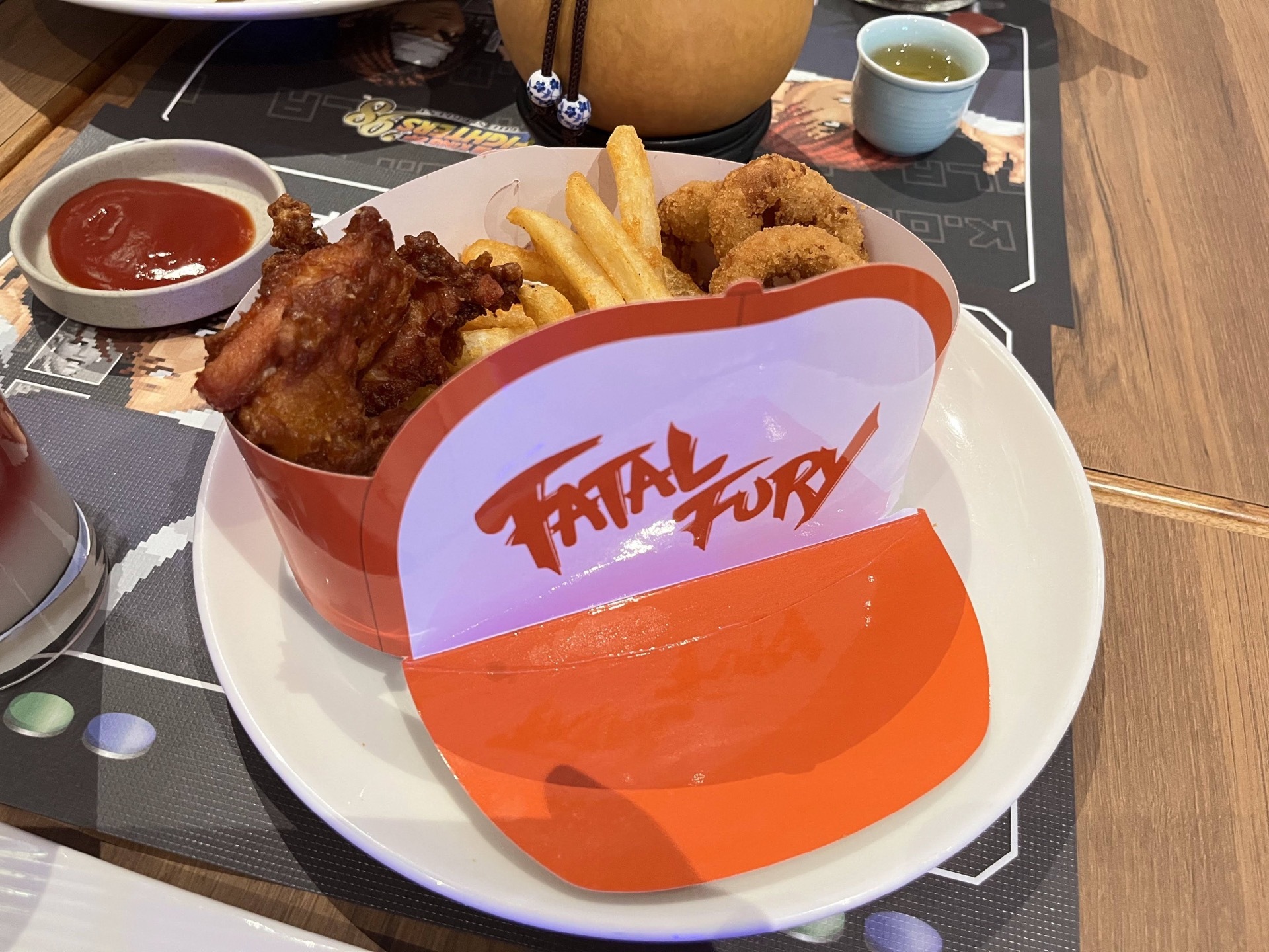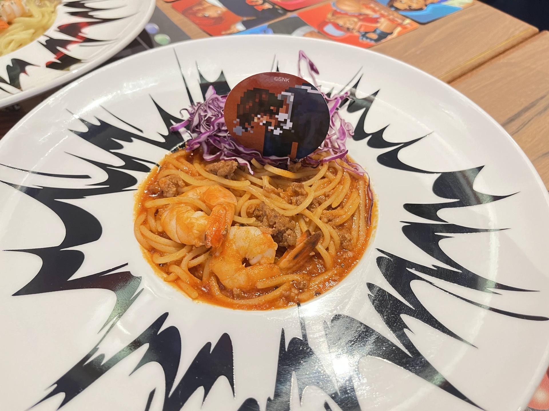 主題餐點部分,這次共推出了五道主餐、兩樣甜點及四款特調酒精飲品。主餐有戴著招牌帽子裝飾的「特瑞・博加德美式炸物拼盤」、用紫色高麗菜絲點綴的「月之夜大蛇之血狂瘋庵番茄義大利麵」、將墨魚丸重現兩顆鐵球造型的「陳國漢・鐵球粉碎擊墨魚丸子白醬麵」,以及放上不知火舞的服飾裝飾的「不知火舞的誘惑 番茄牛腩飯」。另外還有重頭戲「草薙赤炎 迷迭香熟成鴨胸」,上餐後工作人員會現場使用特殊道具點火,重現出草薙京的火焰招式,視覺效果相當驚人。