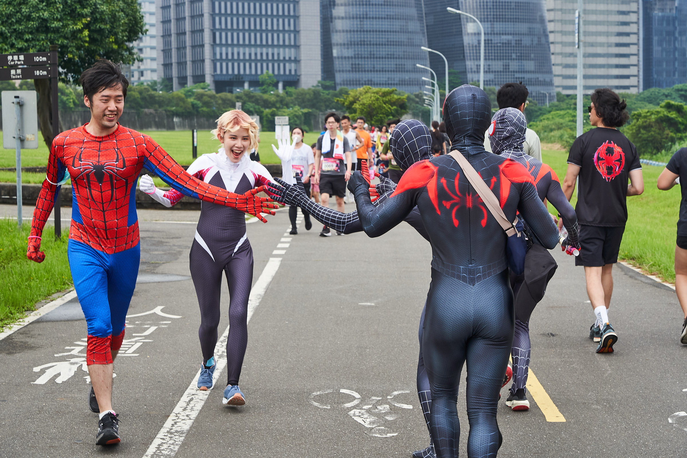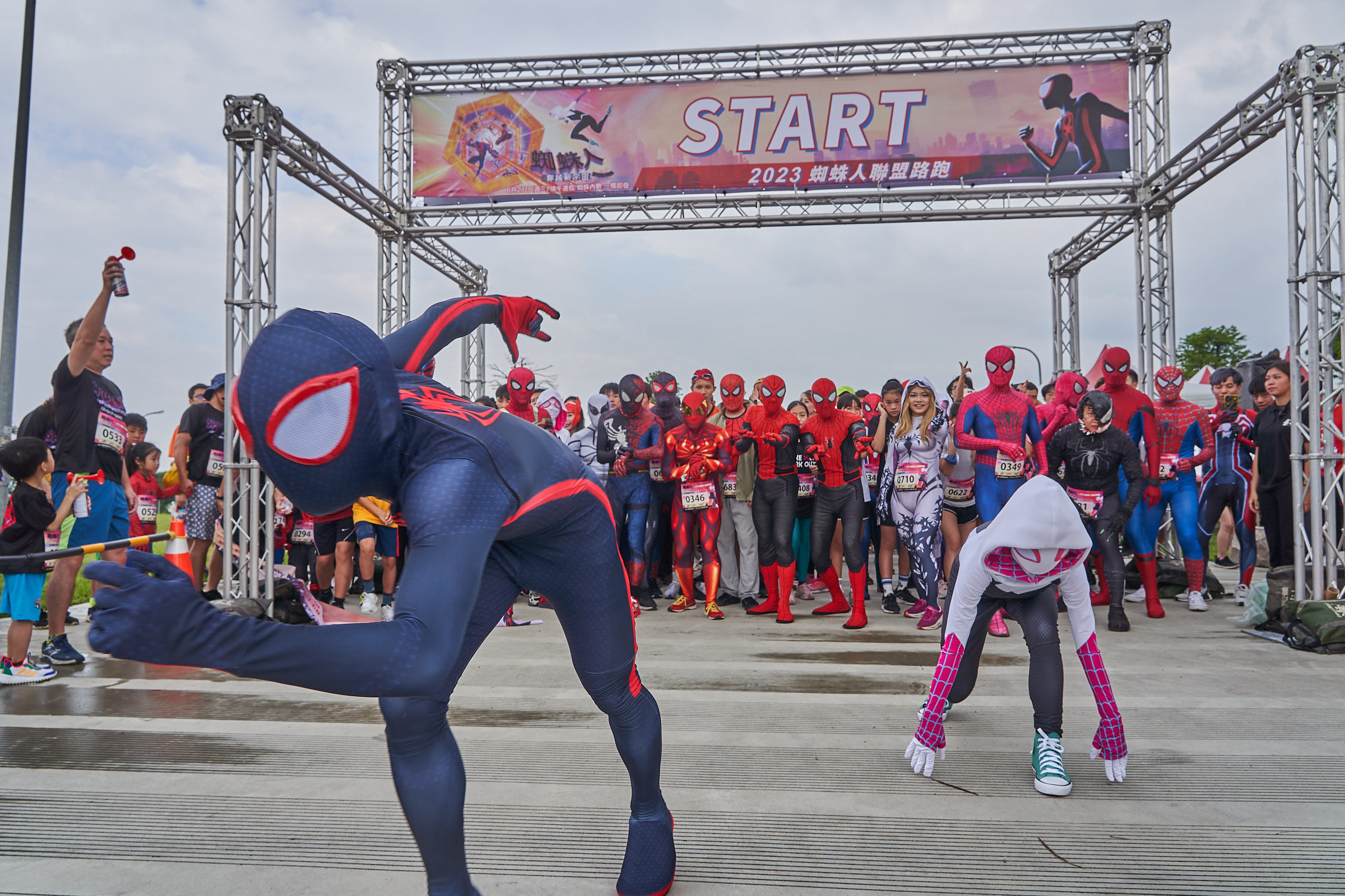 主辦單位在眾人開跑前,特別安排熱舞老師編了一支蜘蛛人版本的暖身操,帶著大人小孩一起熱身拉筋,甚至把第一代蜘蛛人,陶比麥奎爾惡名昭彰的「惡霸麥奎爾」魔性舞蹈加入其中,這特別的驚喜讓大家笑道真的很懂玩。玩性大發的粉絲們更於開跑線前完美複製著名的「蜘蛛人互指」迷因,千人互指的壯觀畫面甚至得讓攝影師爬上兩米的高梯才能拍攝進去。在比賽槍聲響起後,領跑的兩位電影主角邁爾斯與女蜘蛛人關,跑在千名跑者的最前頭,宛如預告片中被蜘蛛人大軍追捕的經典畫面,熱鬧的場面也為 2023 蜘蛛人聯盟路跑揭開序幕。