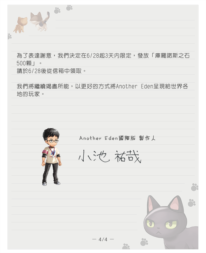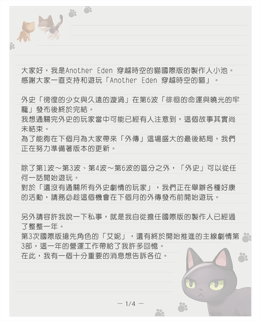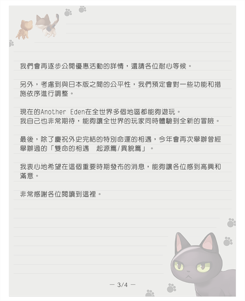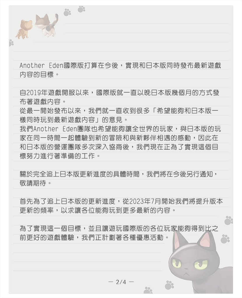 自 2019 年遊戲開服以來,國際版就一直以晚日本版幾個月的方式發布遊戲內容。從最一開始發布以來,我們就一直收到很多「希望能夠和日本版一樣同時玩到最新遊戲內容」的意見。我們 Another Eden 團隊也希望能夠讓全世界的玩家,與日本版的玩家在同一時間一起體驗到新的冒險和與新夥伴相遇的感動,因此在和日本版的營運團隊多次深入協商後,我們現在正為了實現這個目標努力進行準備工作。