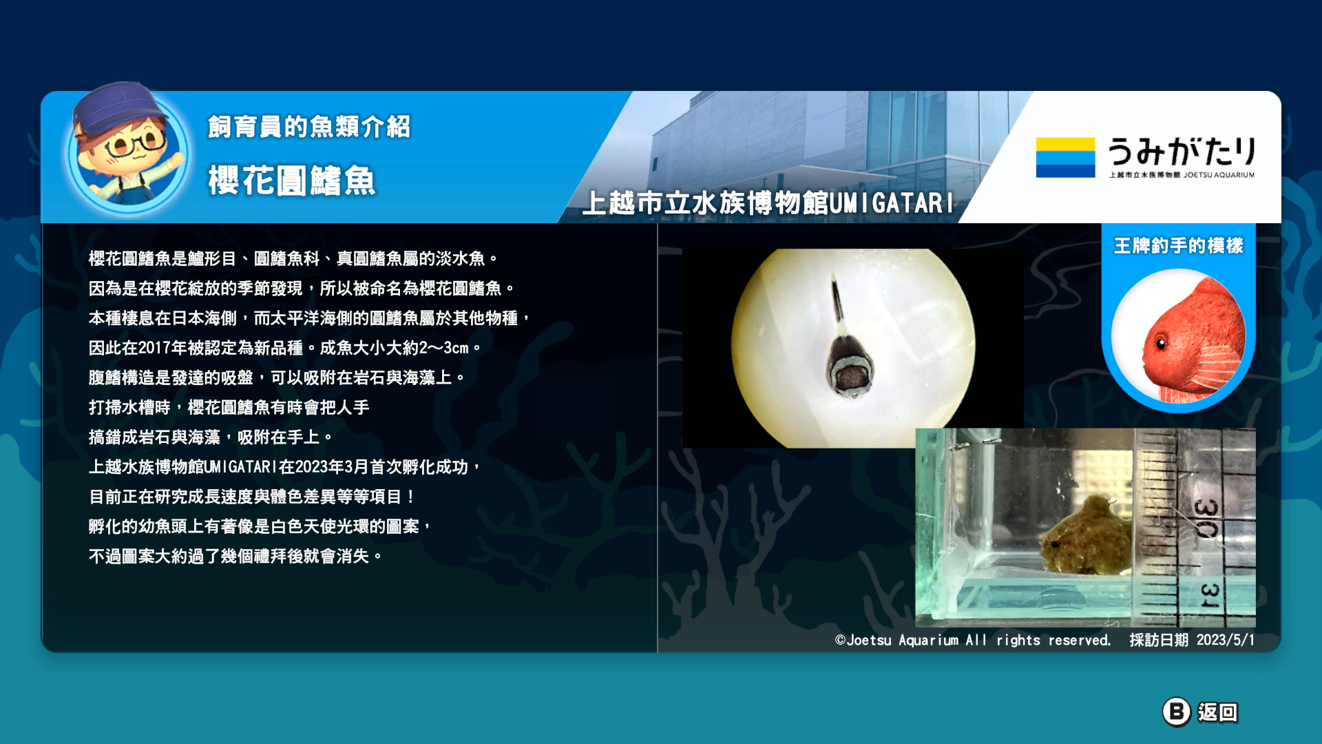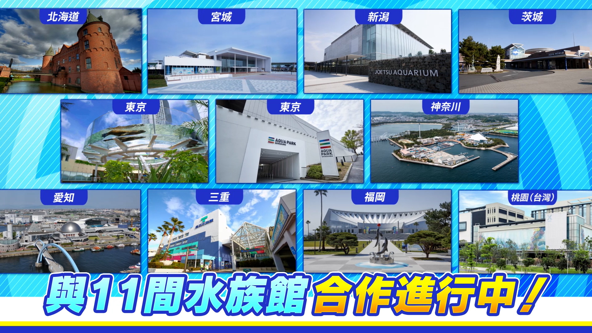 與各水族館連動的合作任務現已新增,不只可以看到各水族館引以為傲的魚類們,玩家更可以在遊戲中閱讀來自各水族館飼育員們的魚類介紹。成功釣到合作魚類的話,玩家將可以獲得以各水族館為靈感所設計的虛擬角色服裝外,若將所有全新登場的合作魚類都釣到的話,更可以打開水族館關卡。