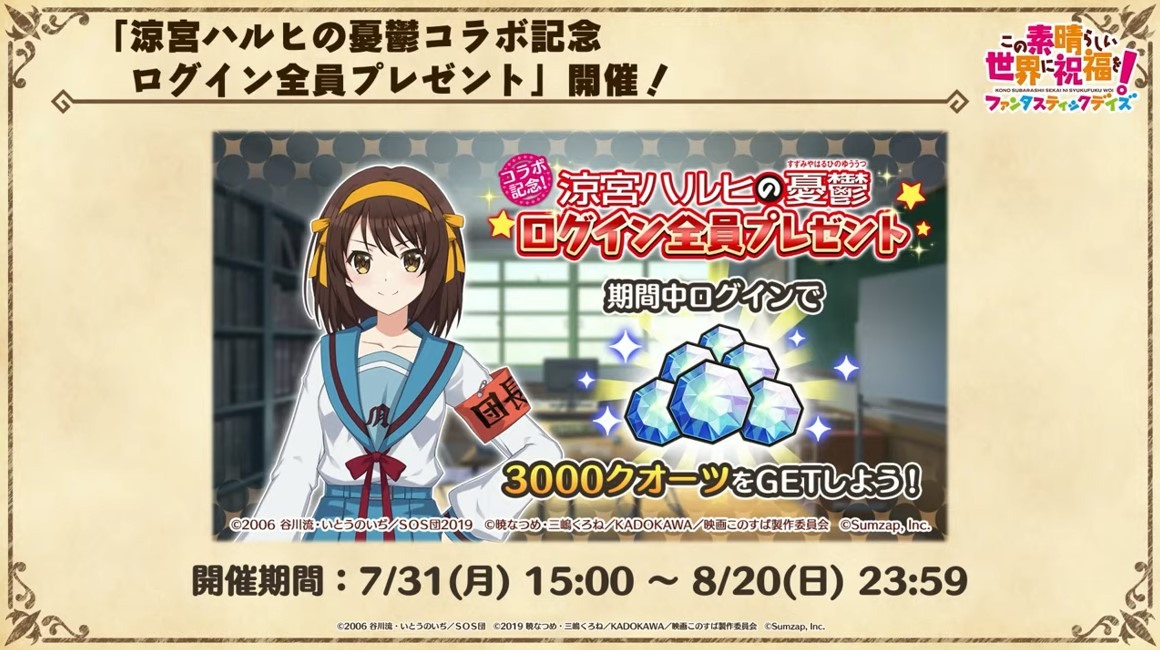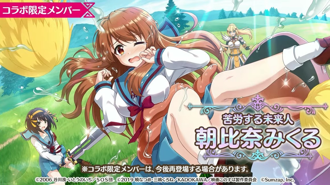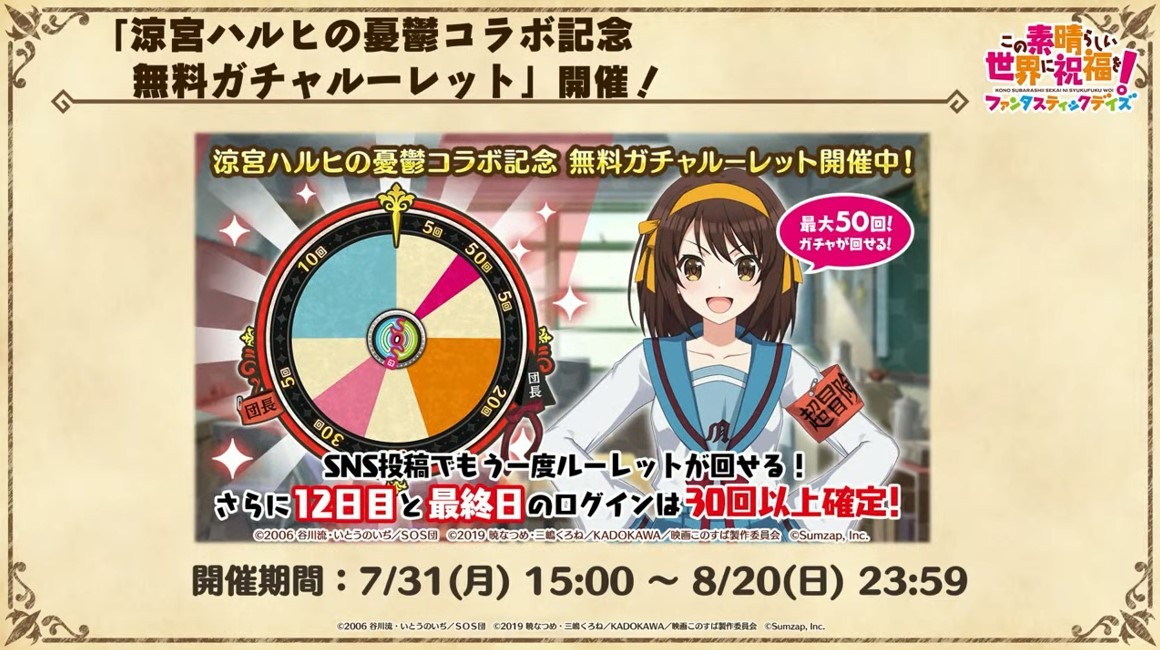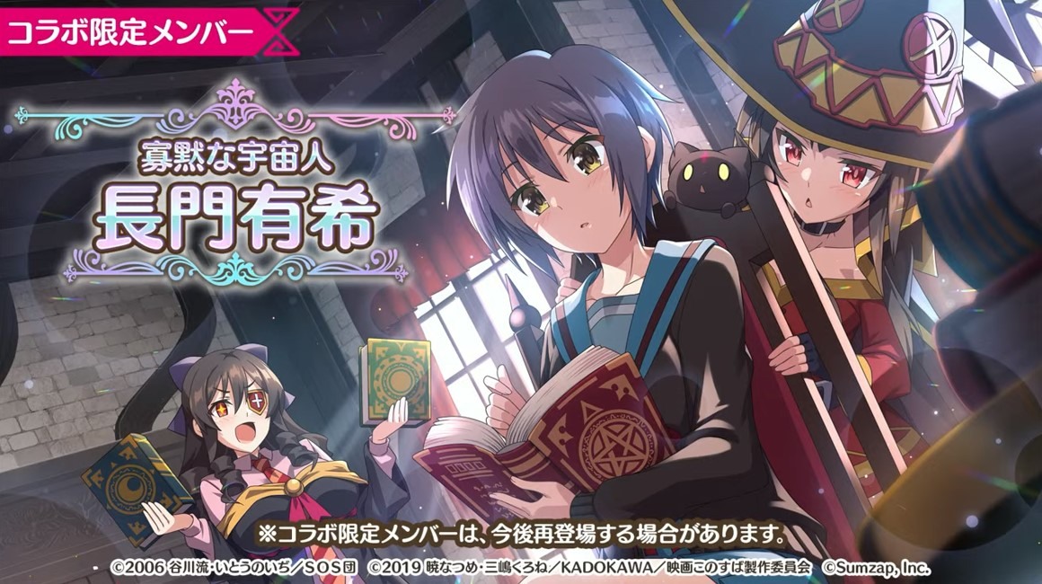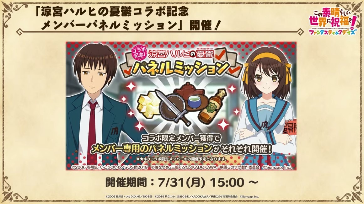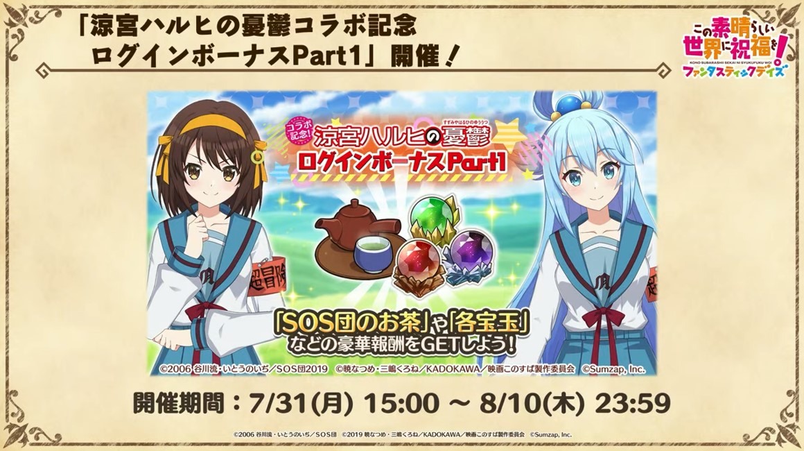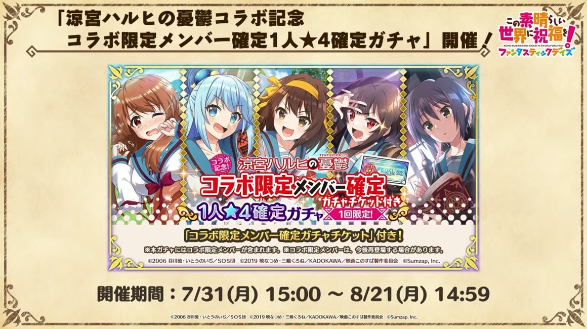 涼宮春日的憂鬱 合作轉蛋 Part1」中,除了合作角色「★4[超冒險者]涼宮春日」、「★4[沉默寡言的外星人]長門有希」、「「★4[辛苦的未來人]朝比奈實玖瑠」外,「★4[阿克塞爾的超女神]阿克婭」、「「★4[爆裂生命體]惠惠」也將同時上架。轉蛋舉辦期間為 7 月 31 日 15:00~8 月 21 日 13:59。