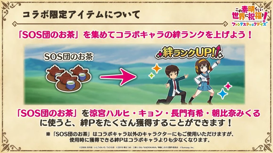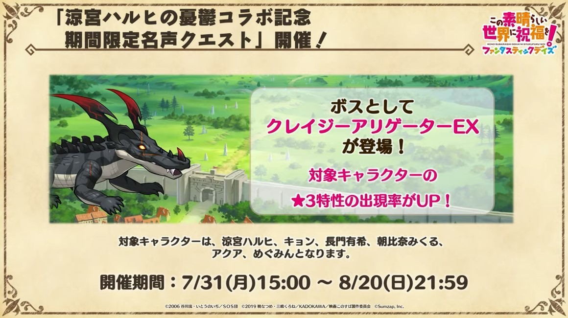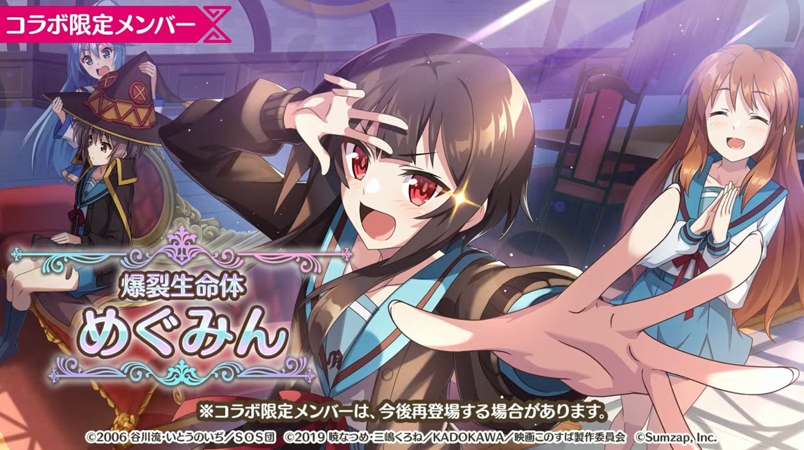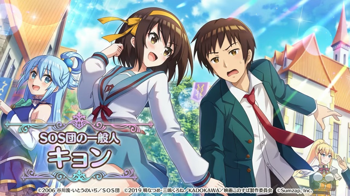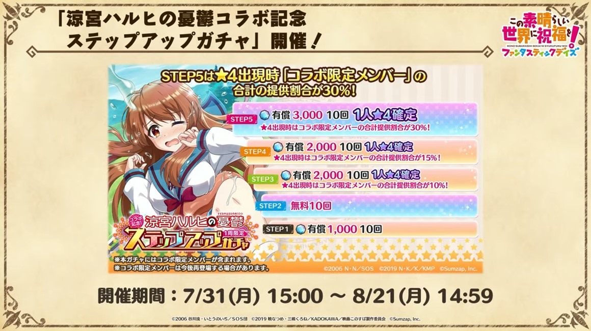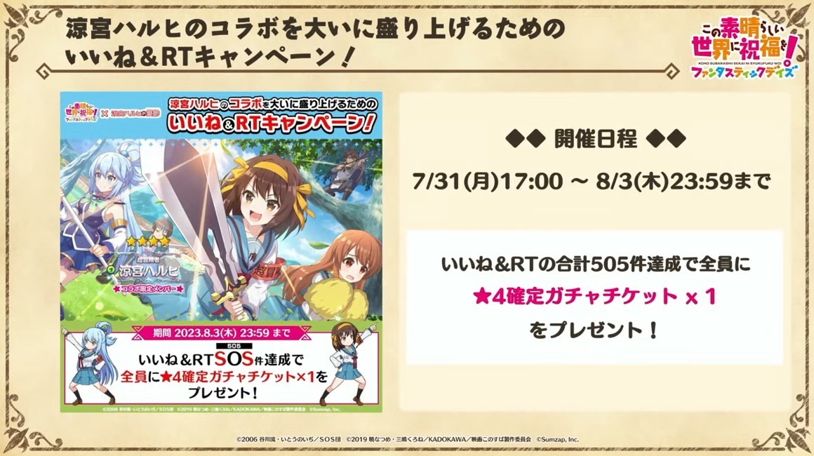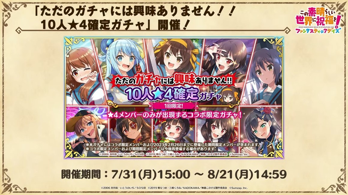 涼宮春日的憂鬱 合作轉蛋 Part1」中,除了合作角色「★4[超冒險者]涼宮春日」、「★4[沉默寡言的外星人]長門有希」、「「★4[辛苦的未來人]朝比奈實玖瑠」外,「★4[阿克塞爾的超女神]阿克婭」、「「★4[爆裂生命體]惠惠」也將同時上架。轉蛋舉辦期間為 7 月 31 日 15:00~8 月 21 日 13:59。