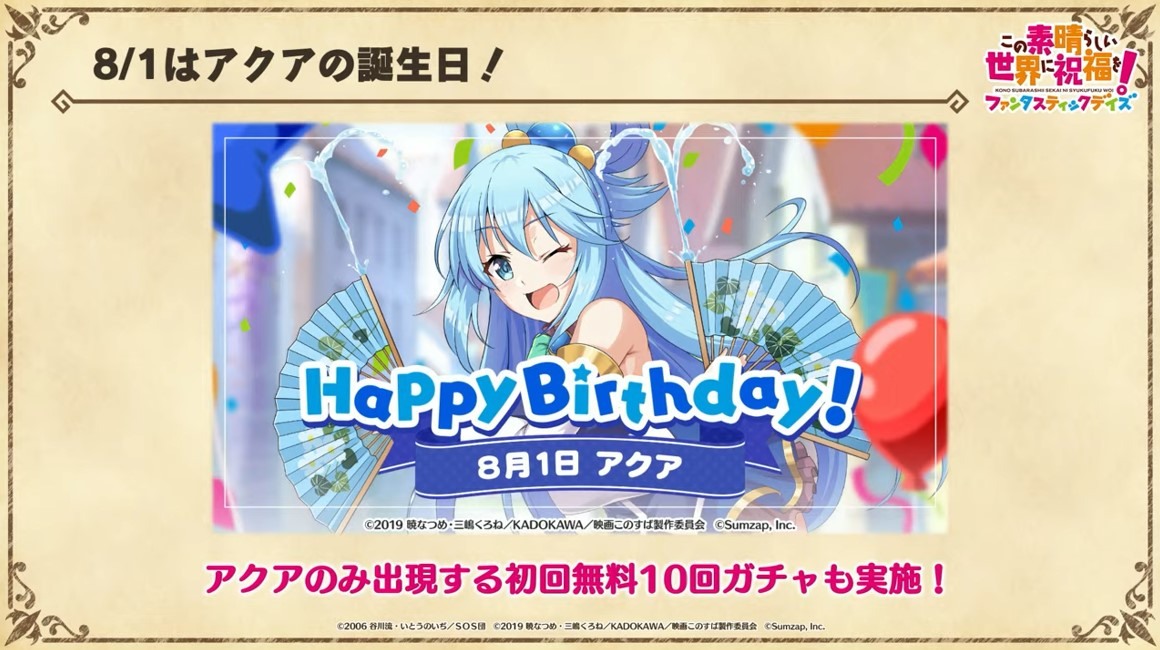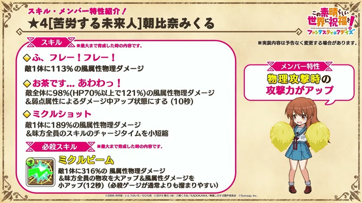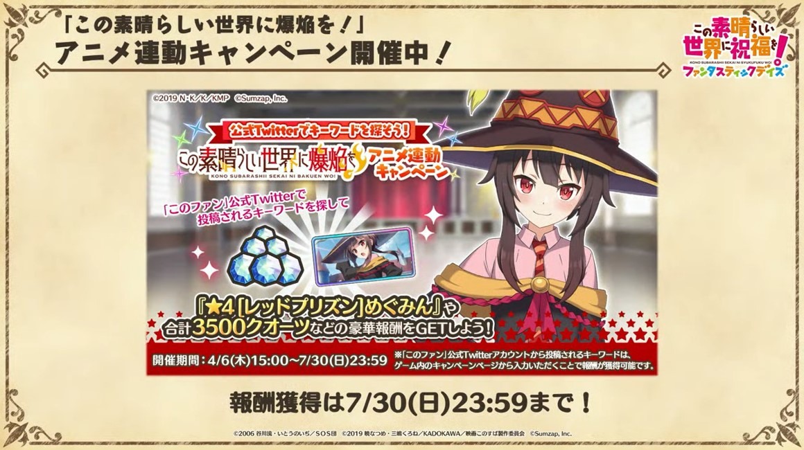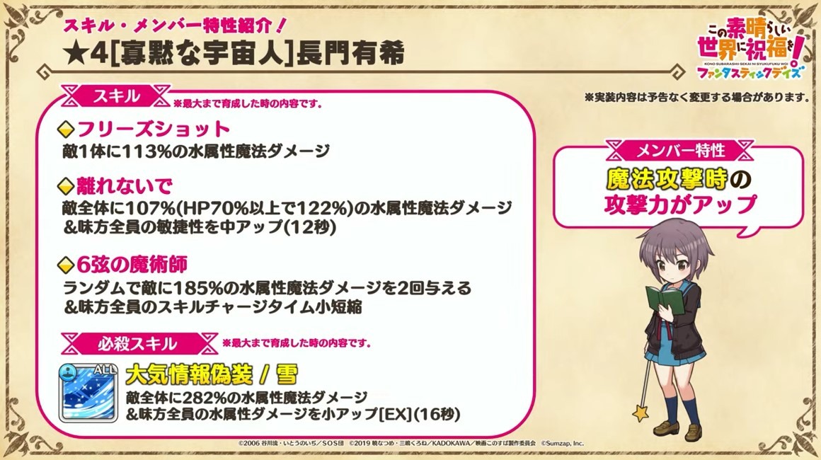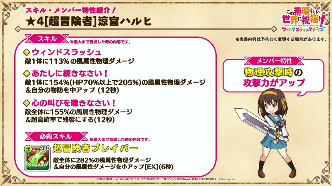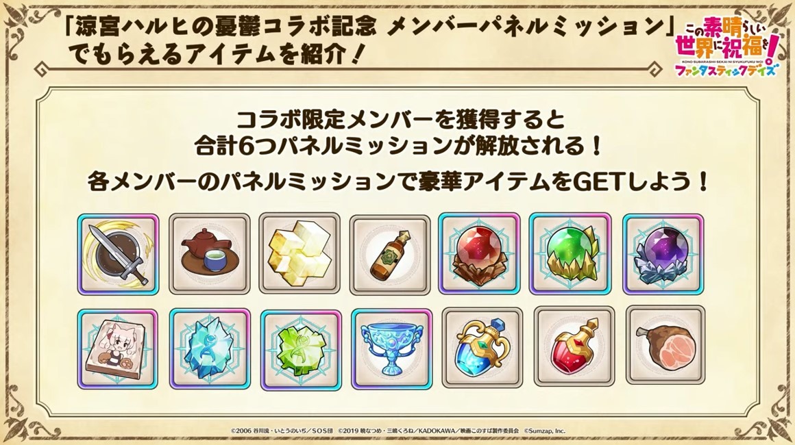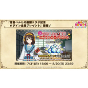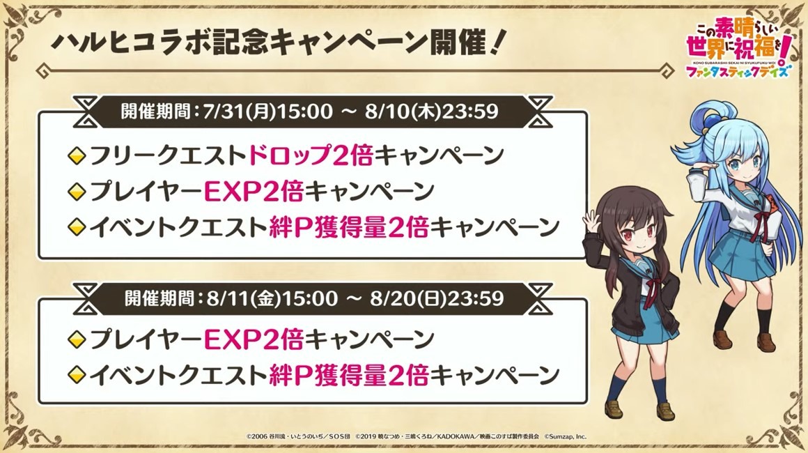 涼宮春日的憂鬱 合作轉蛋 Part1」中,除了合作角色「★4[超冒險者]涼宮春日」、「★4[沉默寡言的外星人]長門有希」、「「★4[辛苦的未來人]朝比奈實玖瑠」外,「★4[阿克塞爾的超女神]阿克婭」、「「★4[爆裂生命體]惠惠」也將同時上架。轉蛋舉辦期間為 7 月 31 日 15:00~8 月 21 日 13:59。