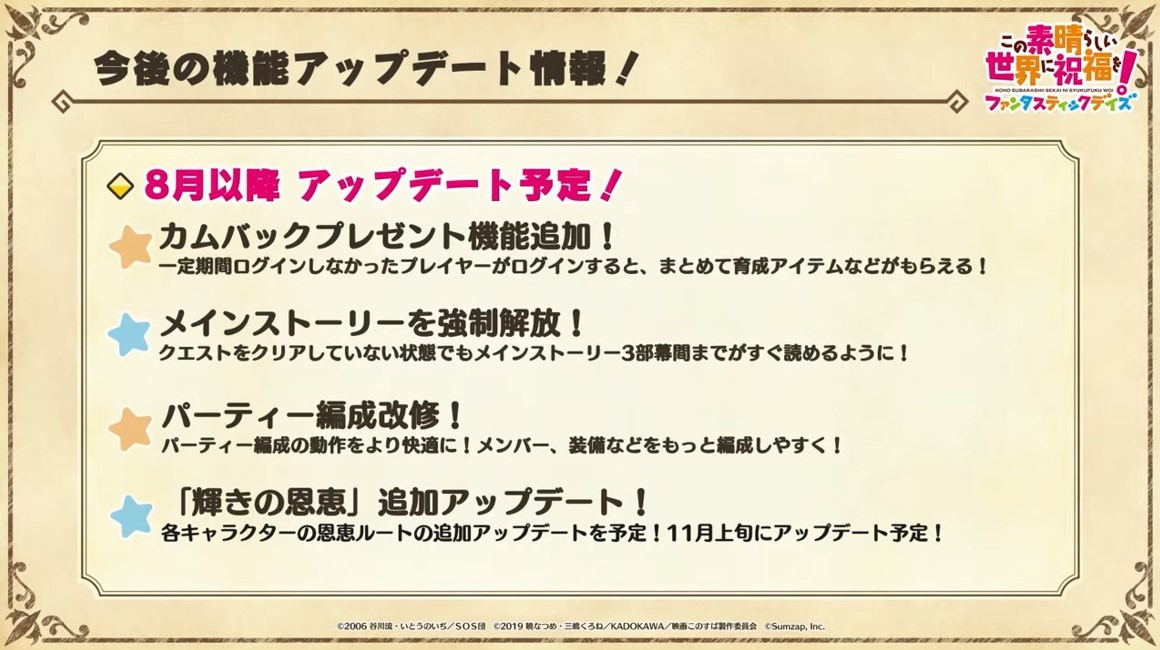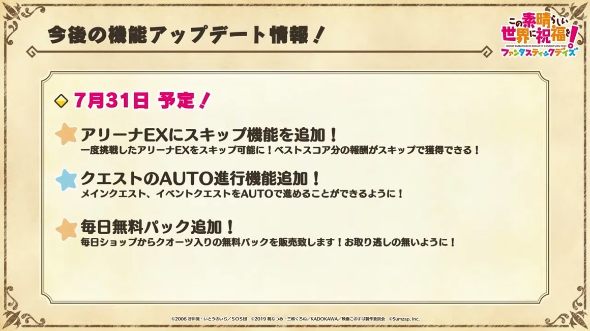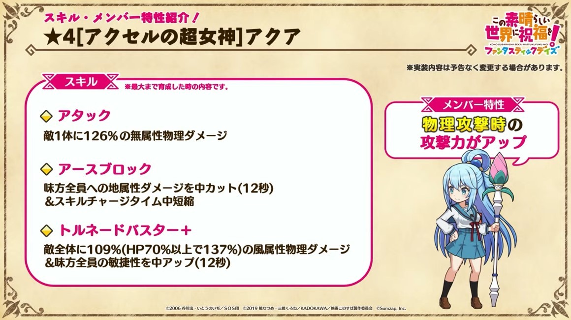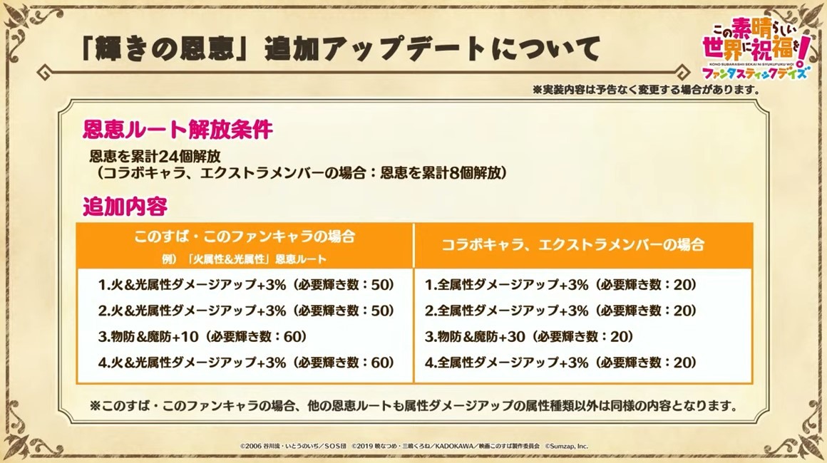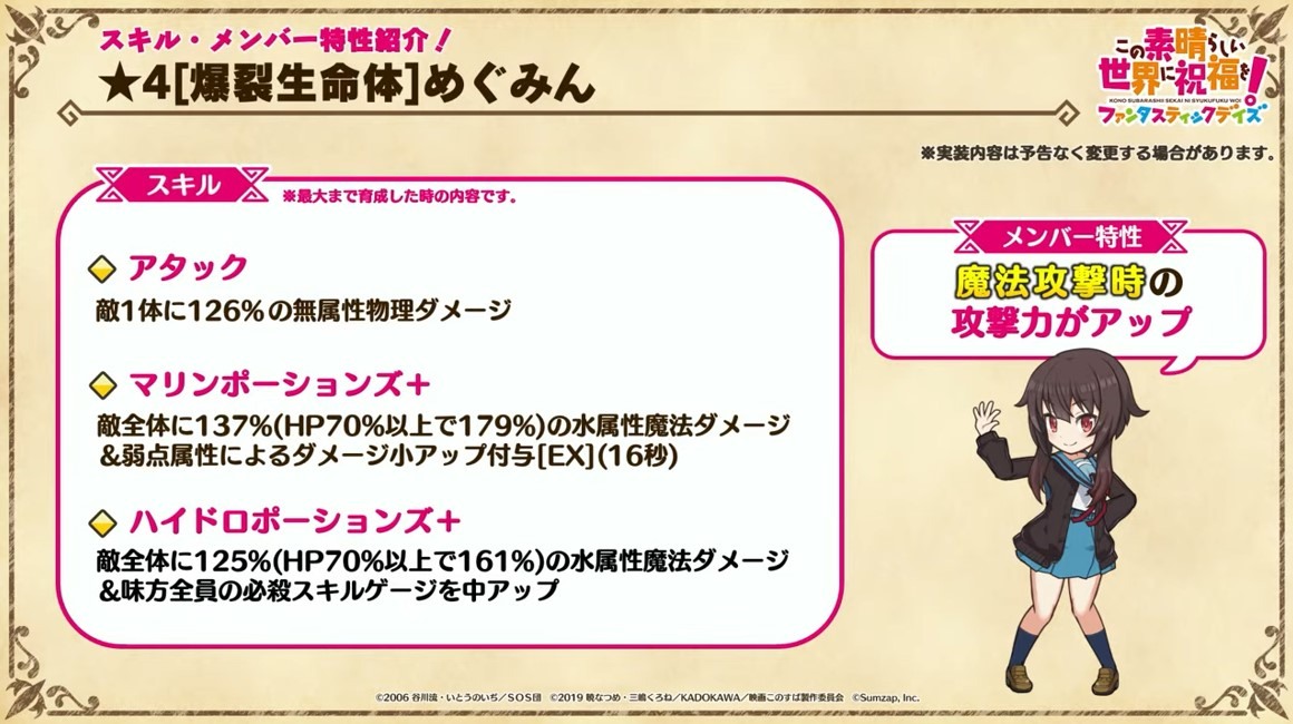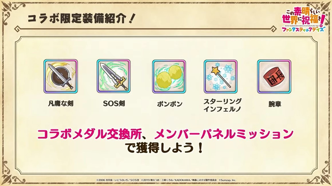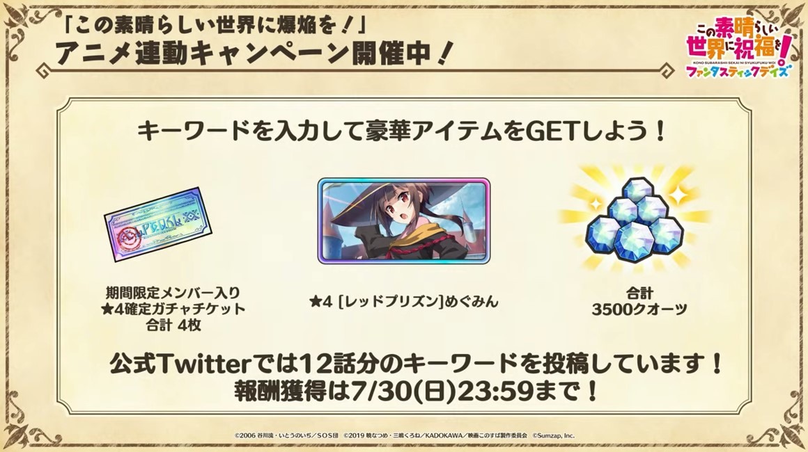 涼宮春日的憂鬱 合作轉蛋 Part1」中,除了合作角色「★4[超冒險者]涼宮春日」、「★4[沉默寡言的外星人]長門有希」、「「★4[辛苦的未來人]朝比奈實玖瑠」外,「★4[阿克塞爾的超女神]阿克婭」、「「★4[爆裂生命體]惠惠」也將同時上架。轉蛋舉辦期間為 7 月 31 日 15:00~8 月 21 日 13:59。