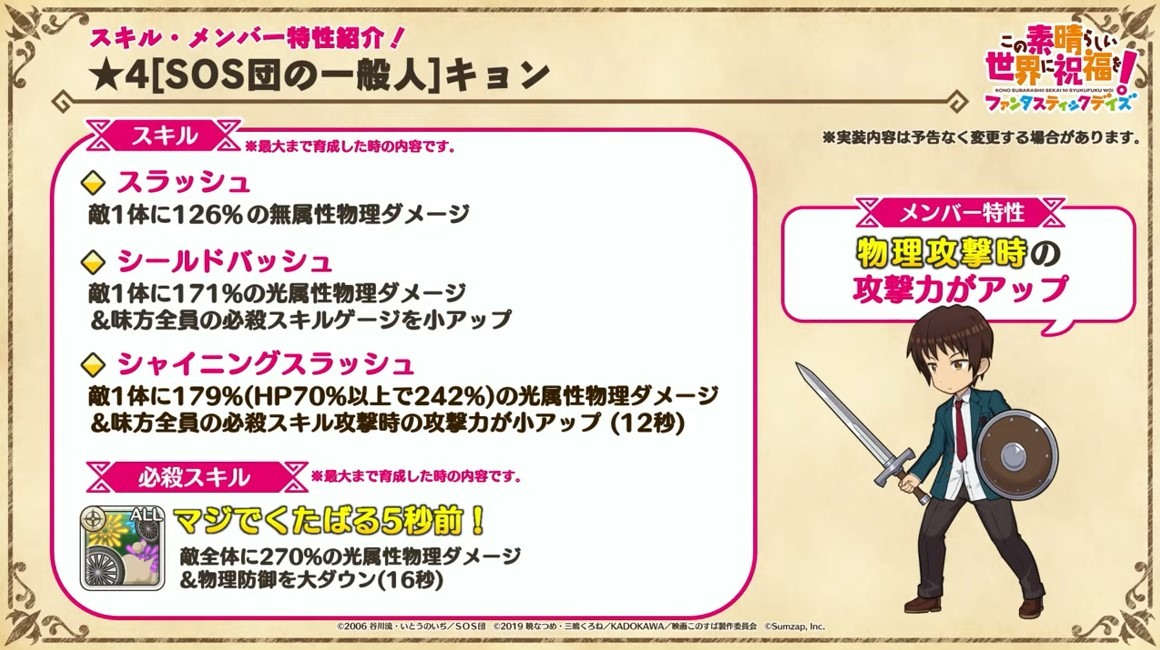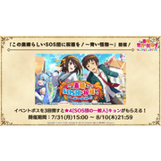 在合作活動「為美好的 SOS 團獻上祝福!~藍色怪物~」中打倒活動 BOSS 三次後,將能獲得「★4[SOS 團的普通人]阿虛」。官方指出,阿虛擁有進行物理攻擊時的攻擊力提升的角色特性,必殺技是「真的要掛掉的 5 秒前!(マジでくたばる 5 秒前!)」。活動舉辦期間為 7 月 31 日 14:00~8 月 10 日 20:59。