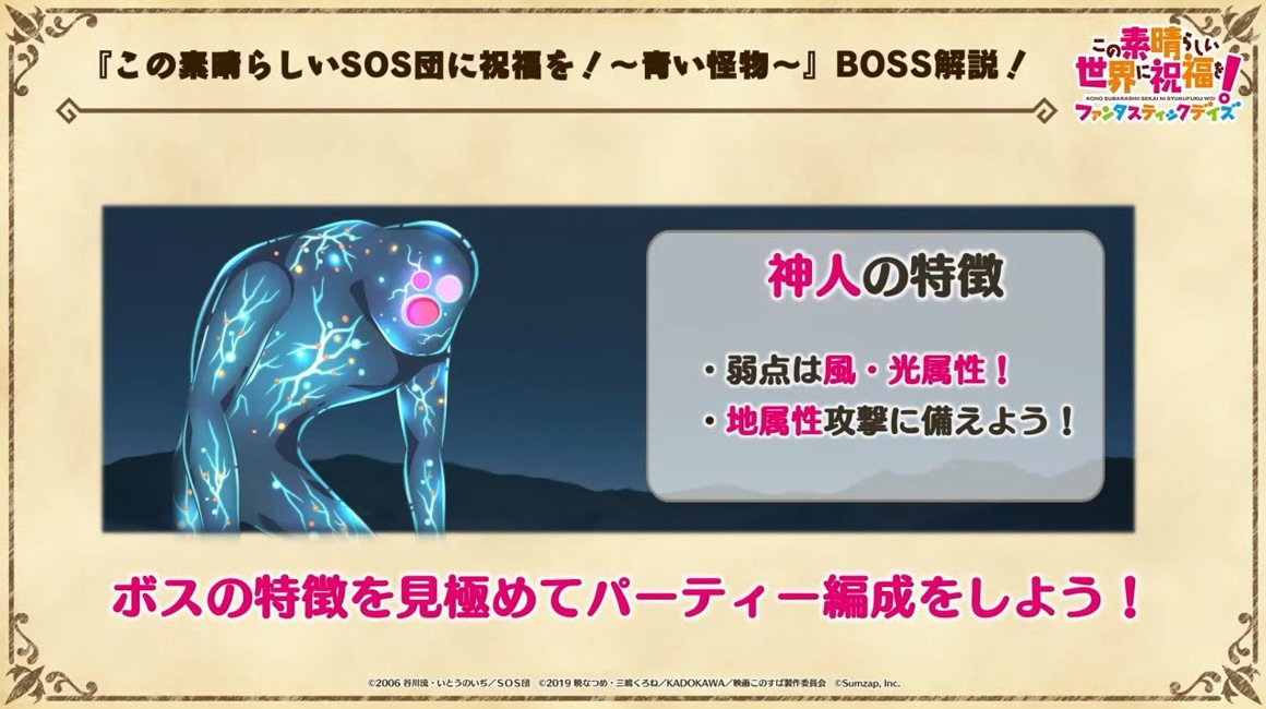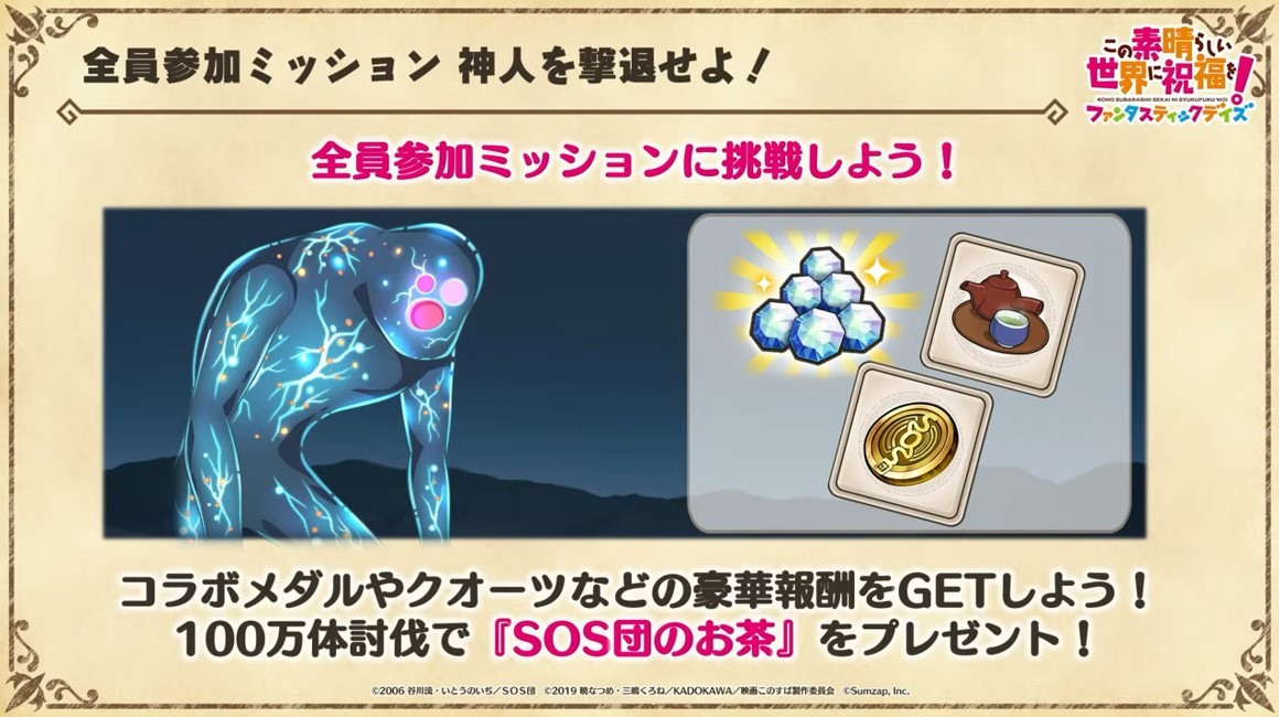 官方表示,SOS 團的 5 位成員涼宮春日、阿虛、長門有希、朝比奈實玖瑠、古泉一樹將會於活動故事中登場,直播中也公開了合作活動角色的介紹影片以及活動故事影片,供玩家參考。