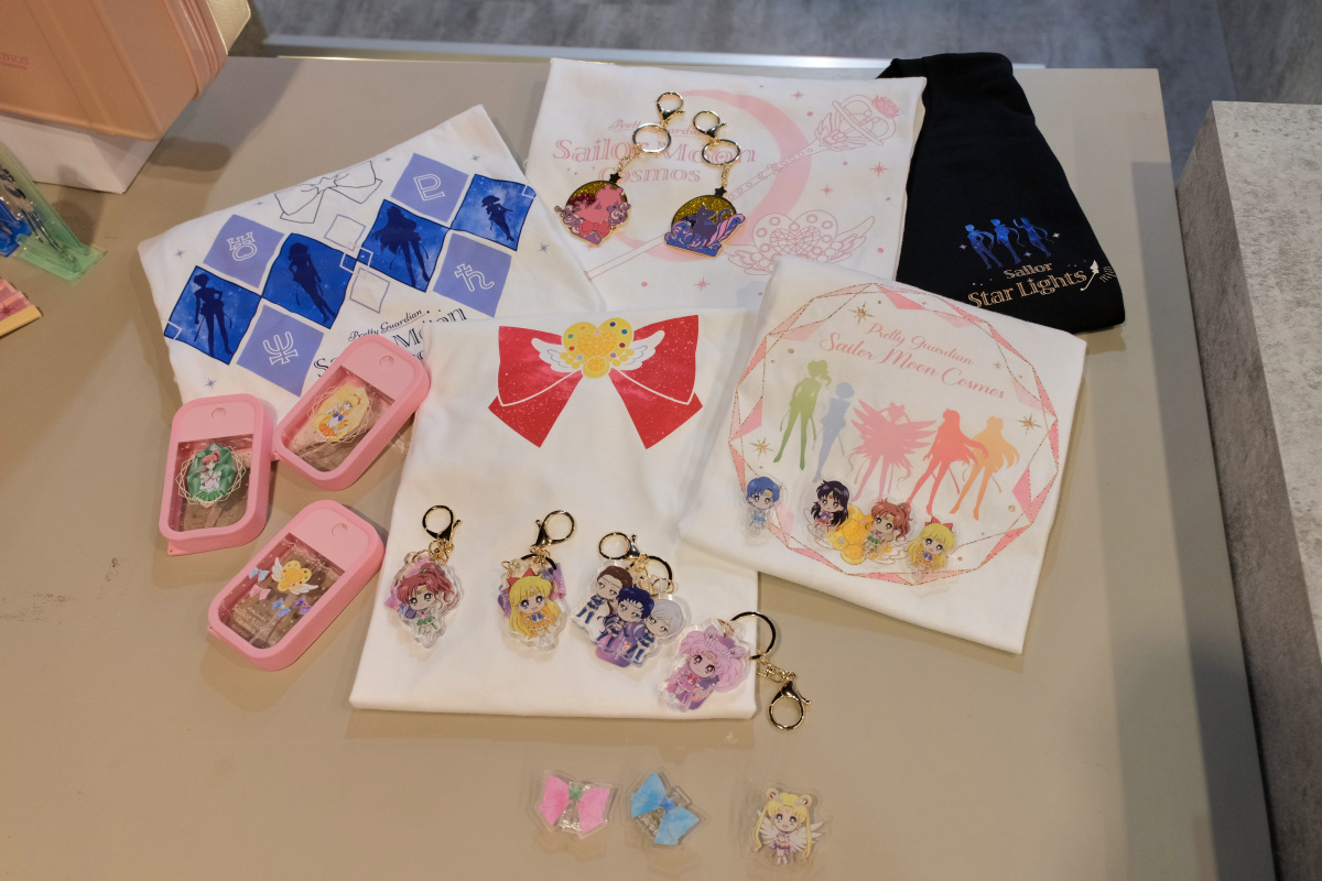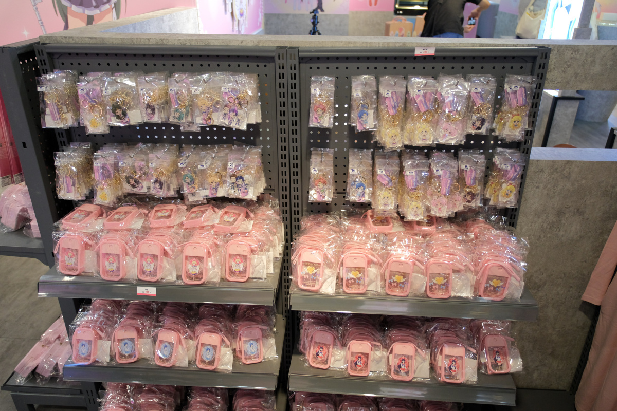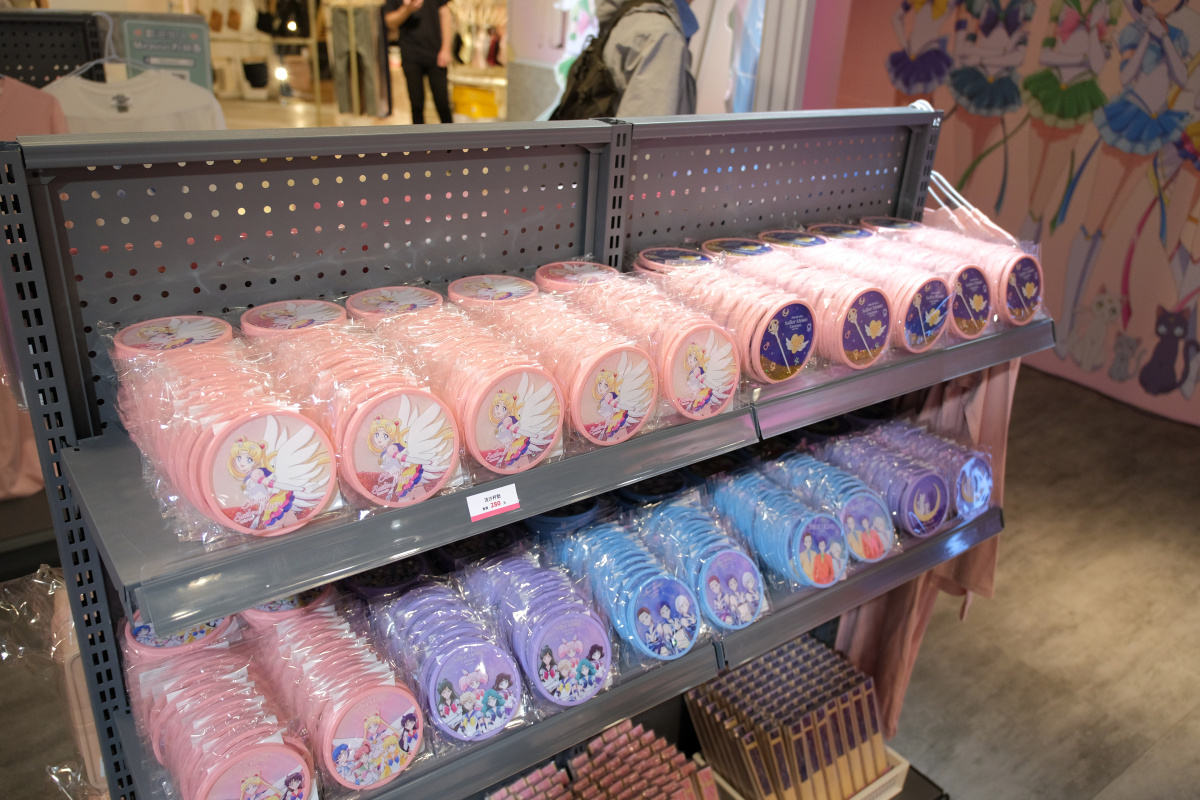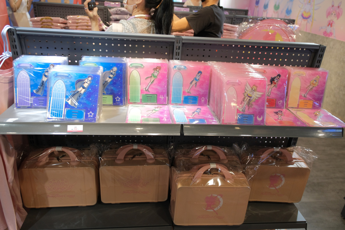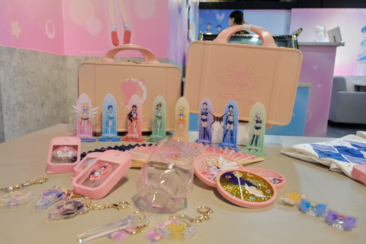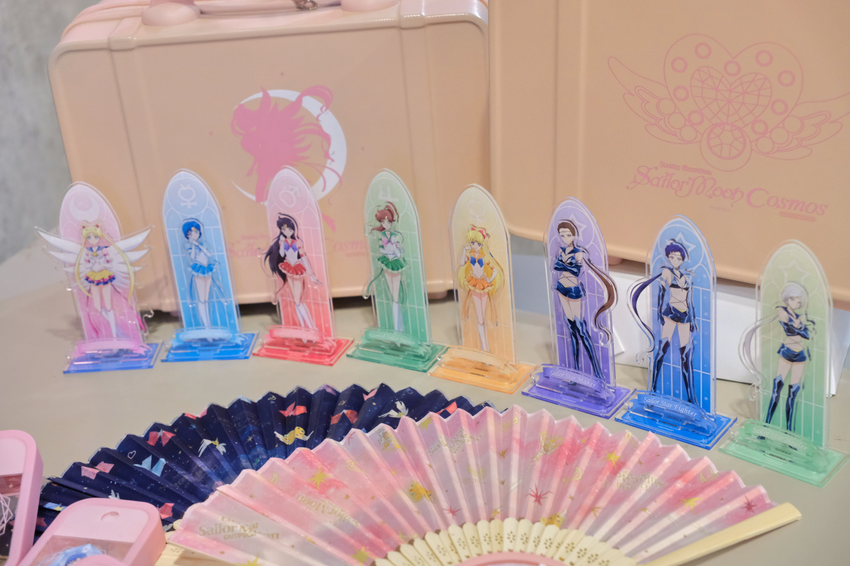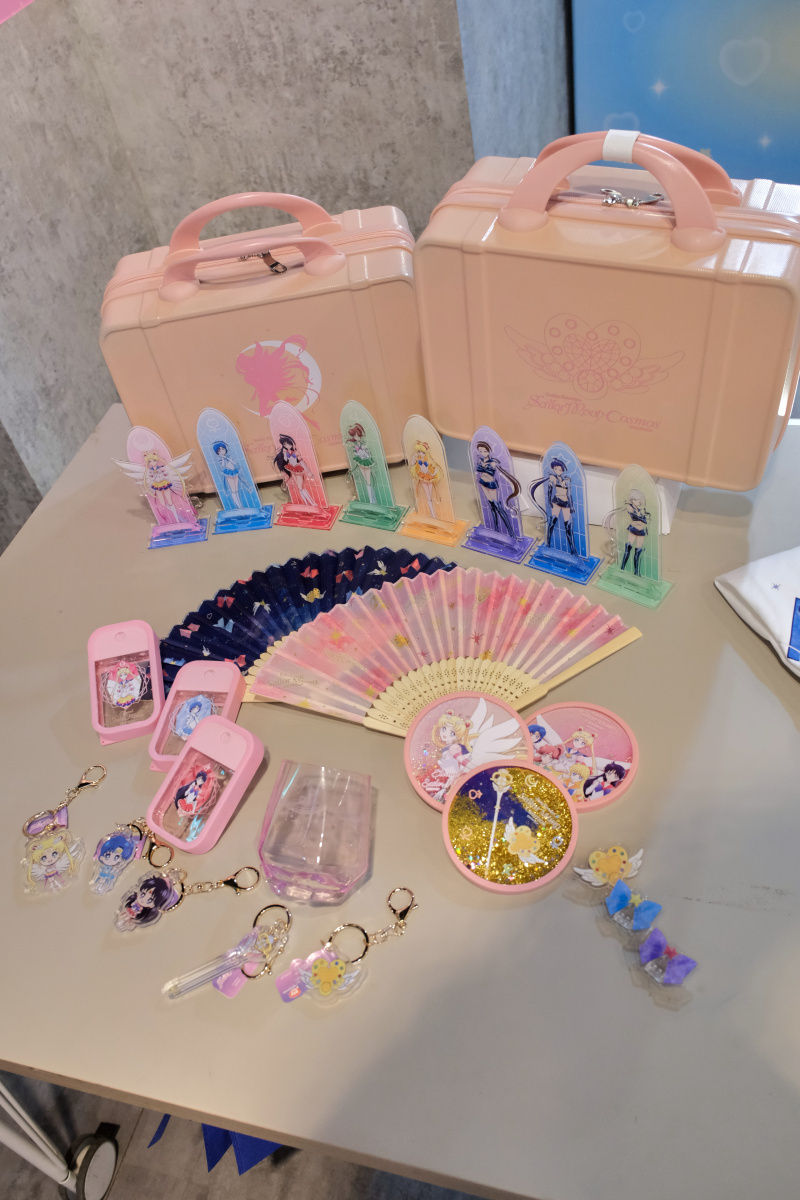 周邊商品的部分,這次的期間限定店則是有著露娜剪影或道具圖案的小型行李收納箱、共有五戰士及變身器等道具圖案可選擇的噴霧瓶、扇子、飾品、雕花玻璃杯或者是保溫瓶等實用周邊於活動登場。