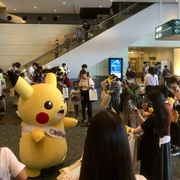 進去會場時看到很多粉絲聚集在大廳,主要理由除了有皮卡丘在跟大家打招呼之外,也有拍照牆面給大家拍照留念,也有提供可愛的手舉牌喔!當然,也有像筆者這樣看到海報就也想拍照留念的人。